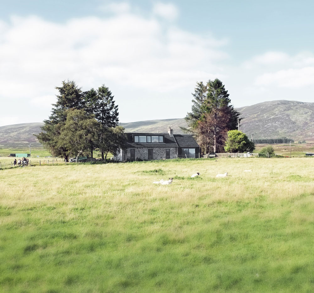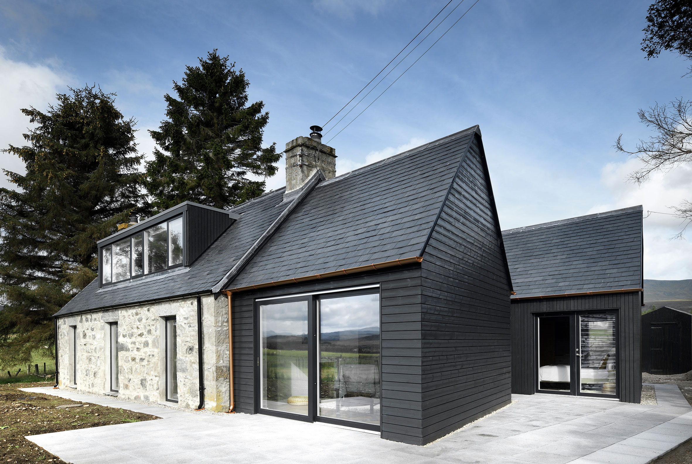 We were originally approached by the client (who was relocating back to Scotland) to refurbish and extend a historic estate cottage in Newtonmore located in the heart of the Scottish Highlands. Through a feasibility study and brief development, the proposal to create two wings , one incorporating sleeping accommodation, the other public room, was formed. Both wings are linked with new glazed entrance which highlighted and connects the old and new. The new element is staggered in plan to provide landscape views beyond the existing cottage and extension. Thermopine cladding from near by Russwood was specified to the new elements.