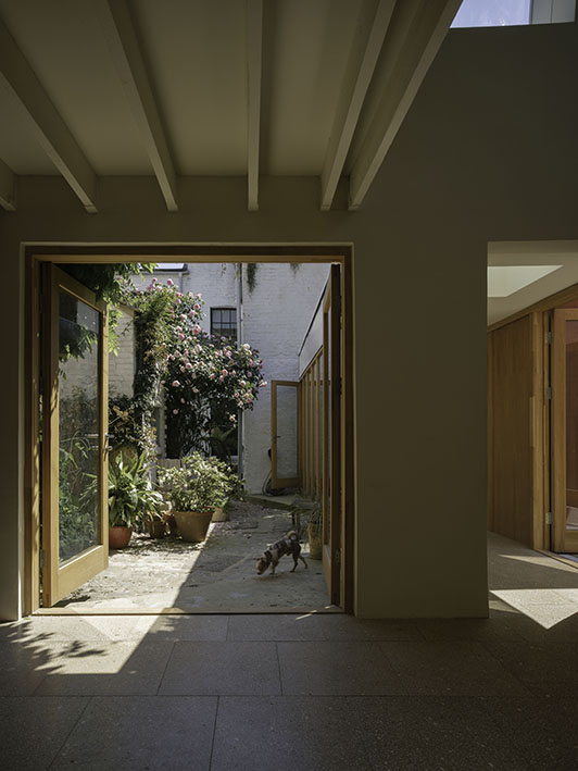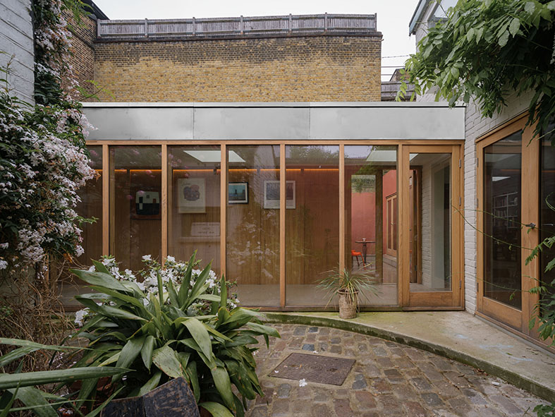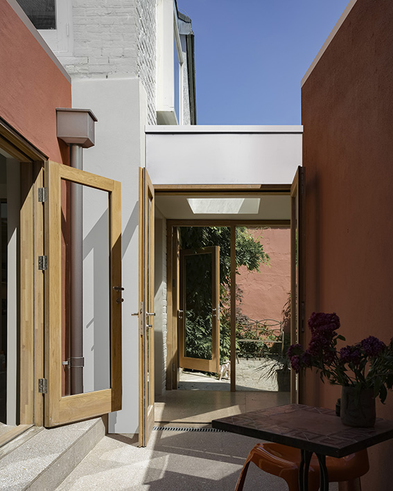 Our clients, a musician and producer and a yoga teacher, bought a 19th century dairy in Dalston 20 years ago, and have been living and working there in a variety of creative ways since. The property has been used as a music recording studio, a furniture shop and as a house, and is now home to the couple and their two young children. Our work consists of two phases of construction. Phase 1 will entail the renovation of the rear building, the old dairy and milking parlour, creating a glazed link corridor between this structure and the house facing the street. Phase 2 will involve the creation of a new roof-top bedroom on top of the house itself. The project involves some creative demolition of a some poor quality lean-to structures which leads to the revelation of a series of courtyards on the site. The result is a number of ambiguous spatial thresholds, internal and external rooms that are inter-connected when open to each other in the summer months. Construction began at the end of 2022 and completion summer 2024. The project was shortlisted for the International Award from the Royal Institute of Architects in Ireland in 2025.