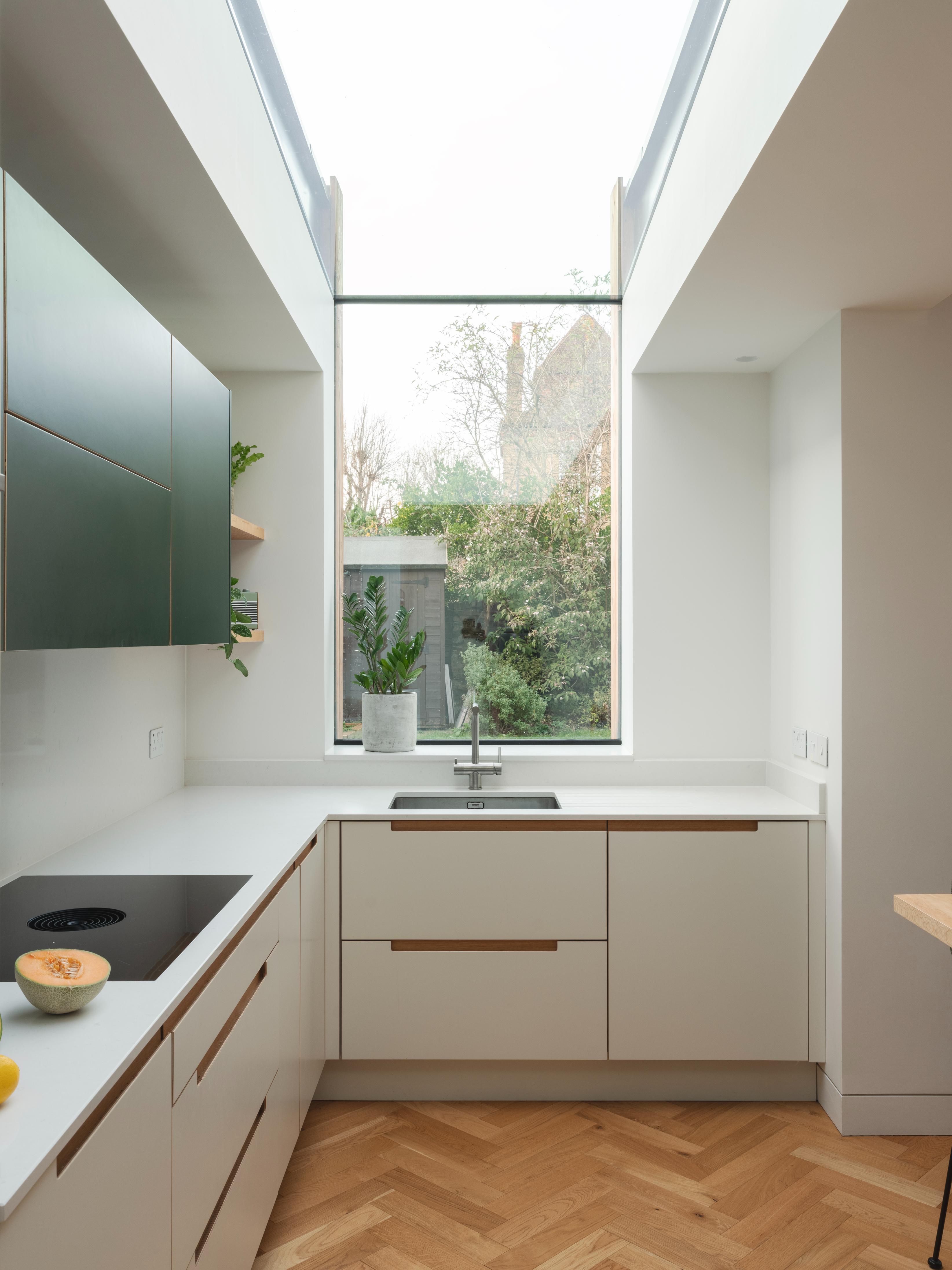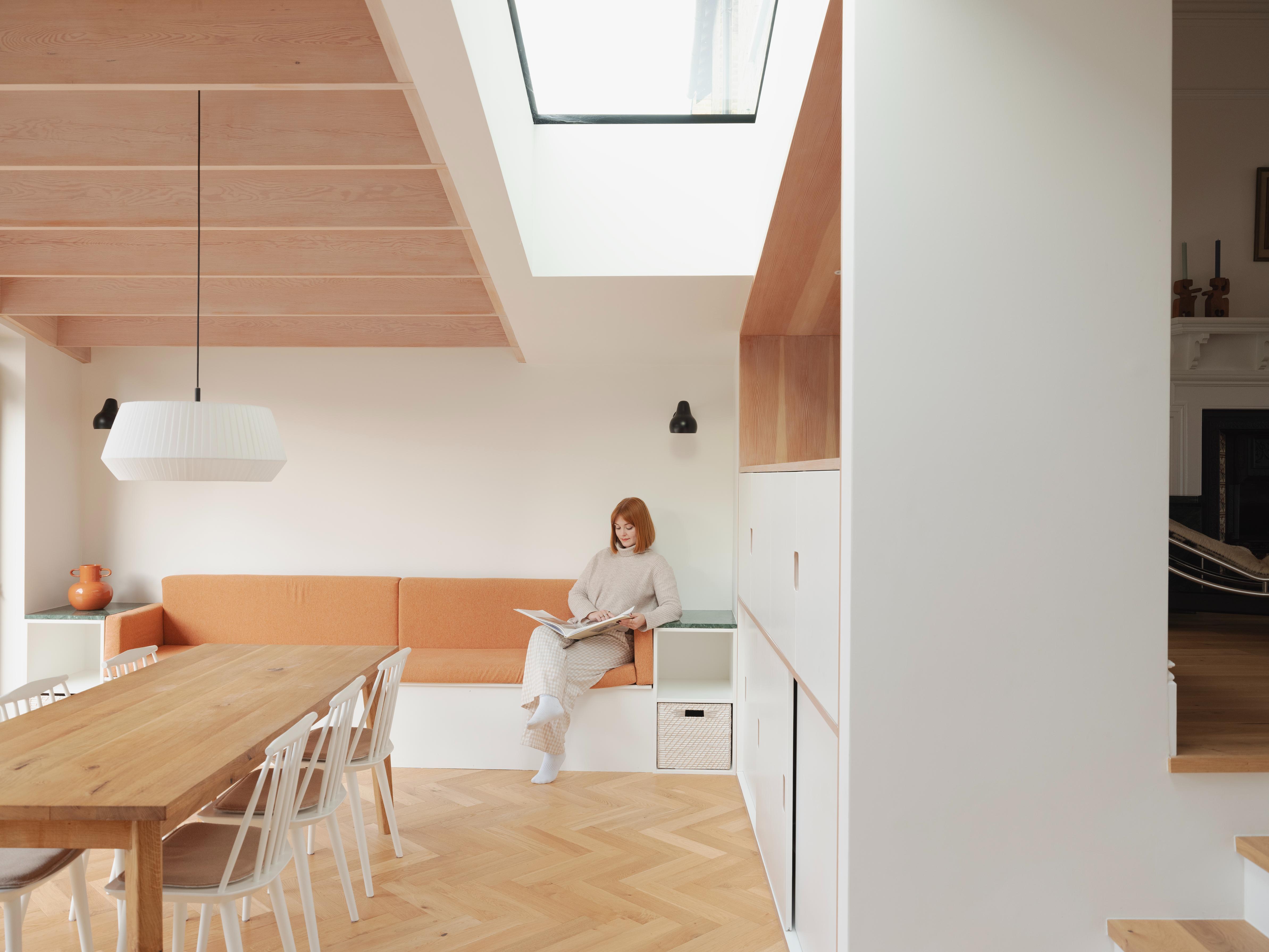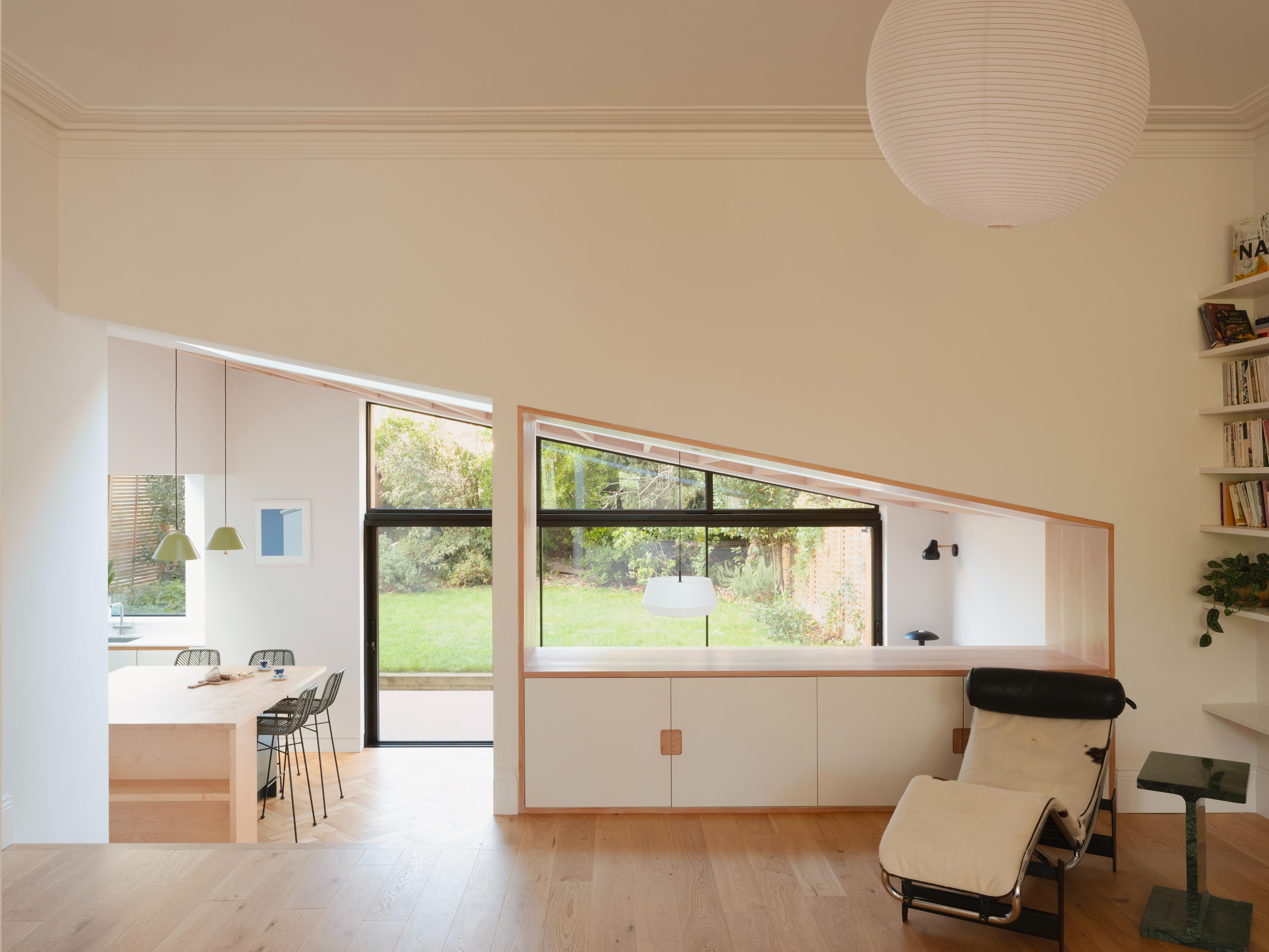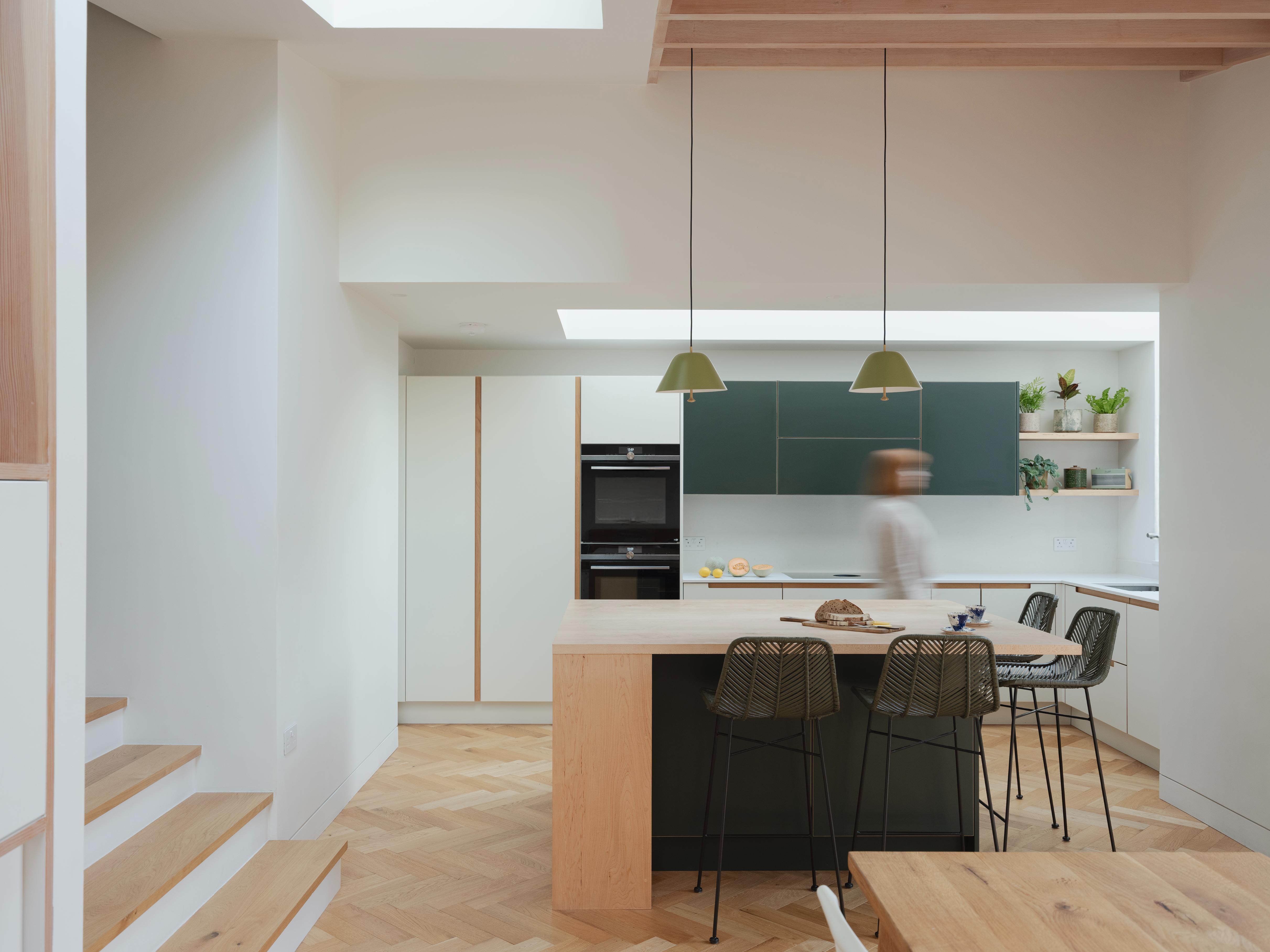 Hilly Fields is a unique and highly bespoke extension, whole house refurbishment and loft conversion located within the Brockley Conservation Area and opposite Hilly Fields park. Although generous in width with large internal spaces, a common characteristic of the dwellings around Hilly Fields Crescent are the half-width outrigger extensions which extend to the rear of each house and are believed to be part of the original fabric of the building. These typically house the kitchen and utilitarian accommodation. The arrangement of these spaces disrupts the flow at ground and inhibits natural daylight and views out into the rear garden spaces. The brief was to replace the existing outrigger with a full width extension which would house a new kitchen and social living/dining space. At loft level the existing generous loft space was to be converted into a new master bedroom and suite. Cited within a Conservation Area, roof extensions are not the accepted norm and a decision was made early on the utilise the existing space rather than extend it. The new ground floor extension is a bold statement, taking reference from Scandinavia in terms of the façade treatment, building form and complimentary internal material palette. The kitchen space is divided into two zones, the kitchen and social space. The change in level from the external garden to the existing floor level is addressed through a set of feature steps which links the existing and new structures. A feature up and over window brings natural daylight into the heart of the kitchen space, with a full length strip roof light positioned in the sloping green roof which defines the social space. To perceptively enhance the volume and create a tactile finish, the Douglas Fir rafters are exposed to create a ribbed ceiling effect. Externally, Siberian Larch timber fins, arranged in a hit and miss arrangement, and which follow the form of the building, create a bold statement externally. A contrasting emerald marble panel ,sourced from the local marble yard, frames the base of the up and over window. A sloping green roof to the extension softens the outlook from the first floor windows, contributes to enhanced bio-diversity across the site, and increases surface water attenuation, Integrated internal joinery creates storage, seating areas and compliments the feature kitchen.