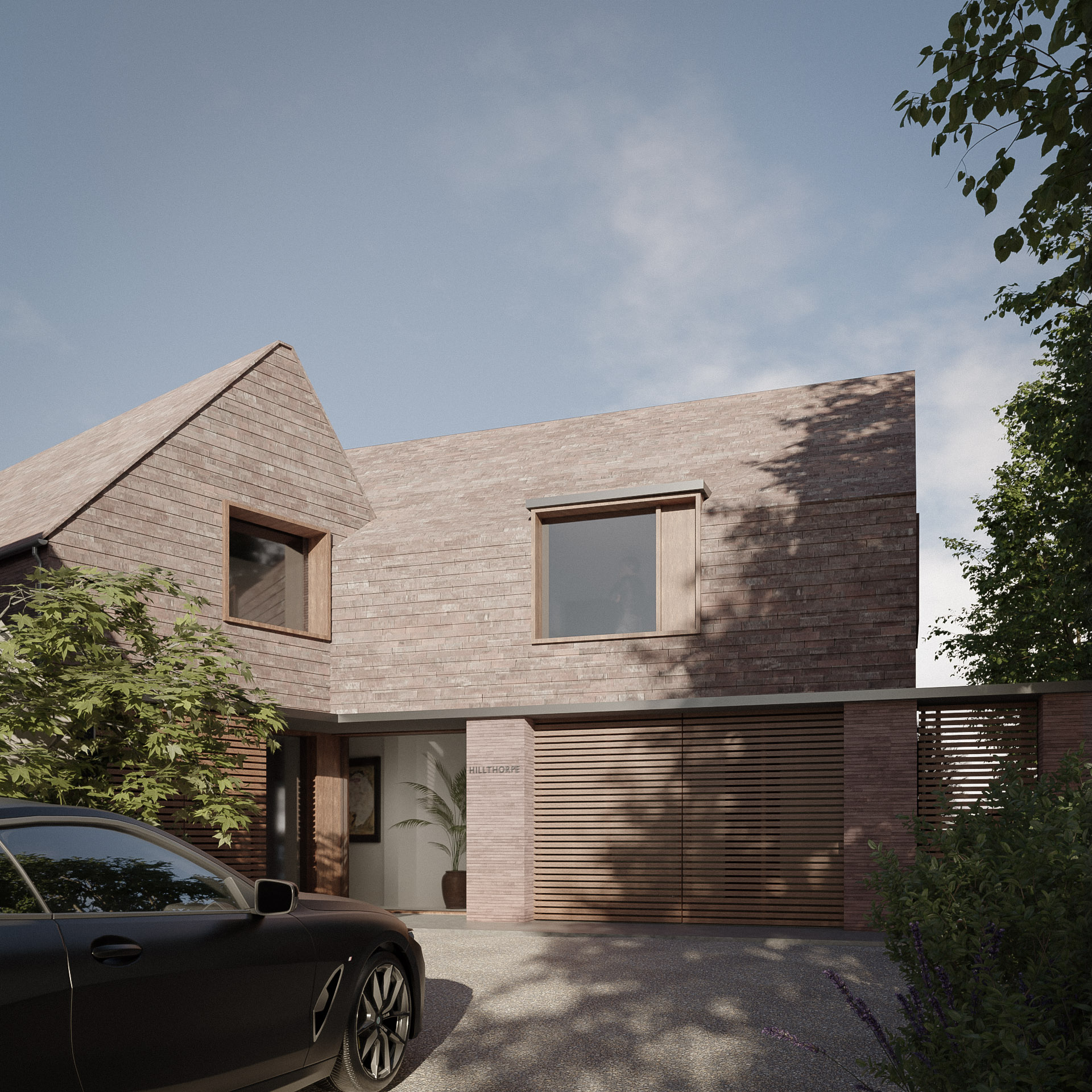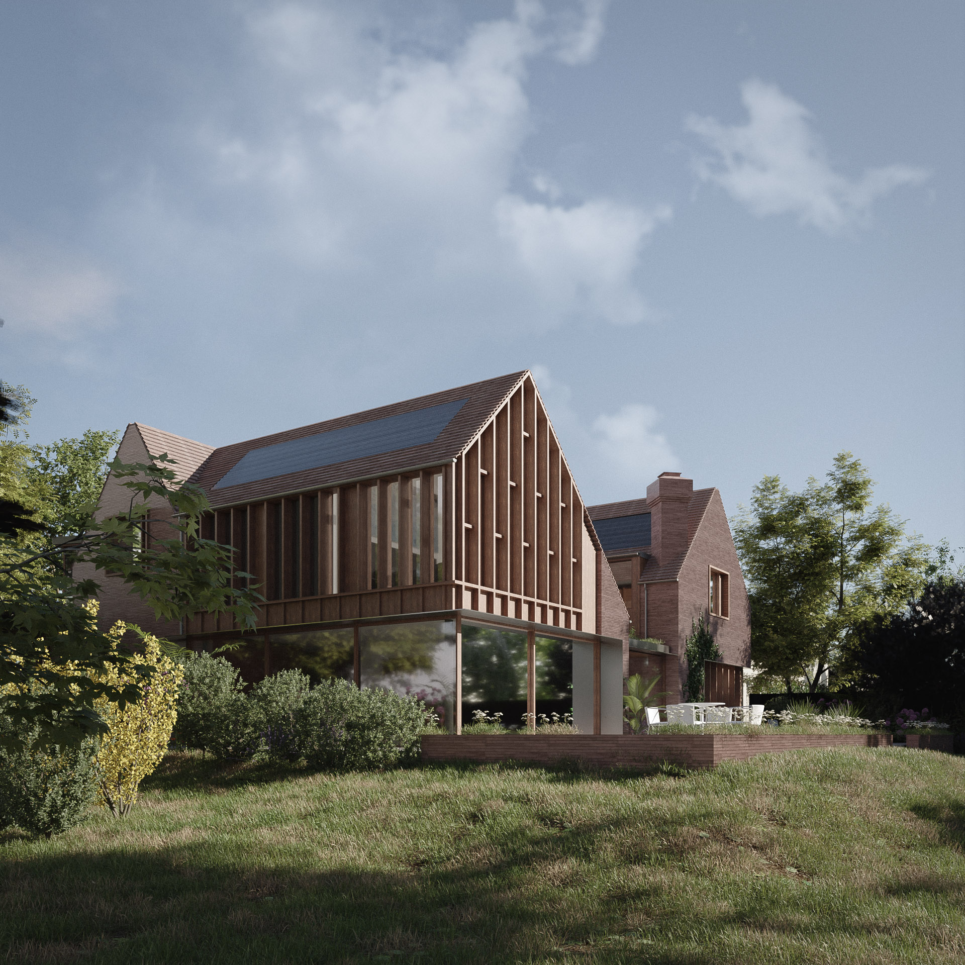 Hillthorpe is located in a conservation area predominately occupied by large detached arts and crafts properties. The majority of the existing building dates back to the 1930s when the property was extensively extended, further additions were completed in the 1950s. To enter the building you need to pass through a dark narrow opening, which is far from welcoming. The building has not been updated since and is in need of a significant upgrade. Sustainability was key on the agenda for our client as such demolition and rebuild of the existing property was immediately ruled out due to the embodied carbon already in the existing building. The second key point on the agenda was to create a unified home with a large open plan ground floor that made the most of the large south facing garden. ?The result is a series of extensions that increases the existing property by 40% and creates a cohesive building centred around a small pond. Taking cues from the traditional arts and crafts buildings nearby the main double storey rear extension has an asymmetric roof known as a catslide roof. This is a similar size to the gable end of the existing property, so creates a cohesive building, but in true arts and crafts style isn't symmetric. Further additions in the form of dormers allow us to use the full width of the first floor creating much larger bedrooms. A large open plan kitchen dining living room occupies the new extension on the ground floor. The entrance is moved to the front of the building and new double height atrium space is carved out of the existing living room. A new study is created at the back of the property overlooking the adjacent woodlands. A further living room, games room, laundry room, plant room, utility room and WC are located on the ground floor. At first floor a new master suite is created with a balcony overlooking the woodlands. A total of four further bedrooms are created all with double height ceilings. Three more bathrooms, a further study and store room are also created. Rather than a steel framed or concrete structure, the proposal predominantly uses structural timber throughout to reduce the embodied carbon in the building. The vertical window frames on the rear extension are actually part of the structure of the building, these deep frames also help to reduce overheating in the summer as they provide solar shading. The proposal is designed to Passivhaus standards, utilising air source heat pumps and rainwater harvesting to ensure the property is sustainable whilst in use.