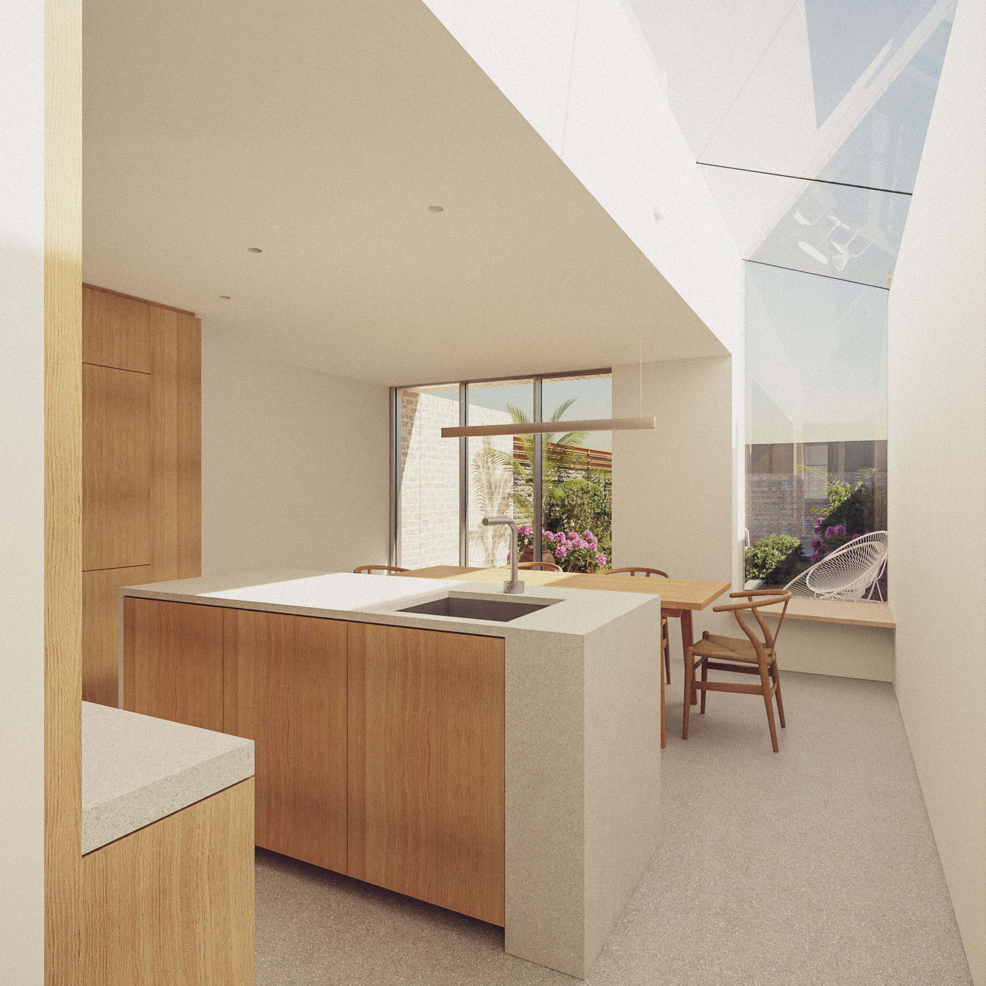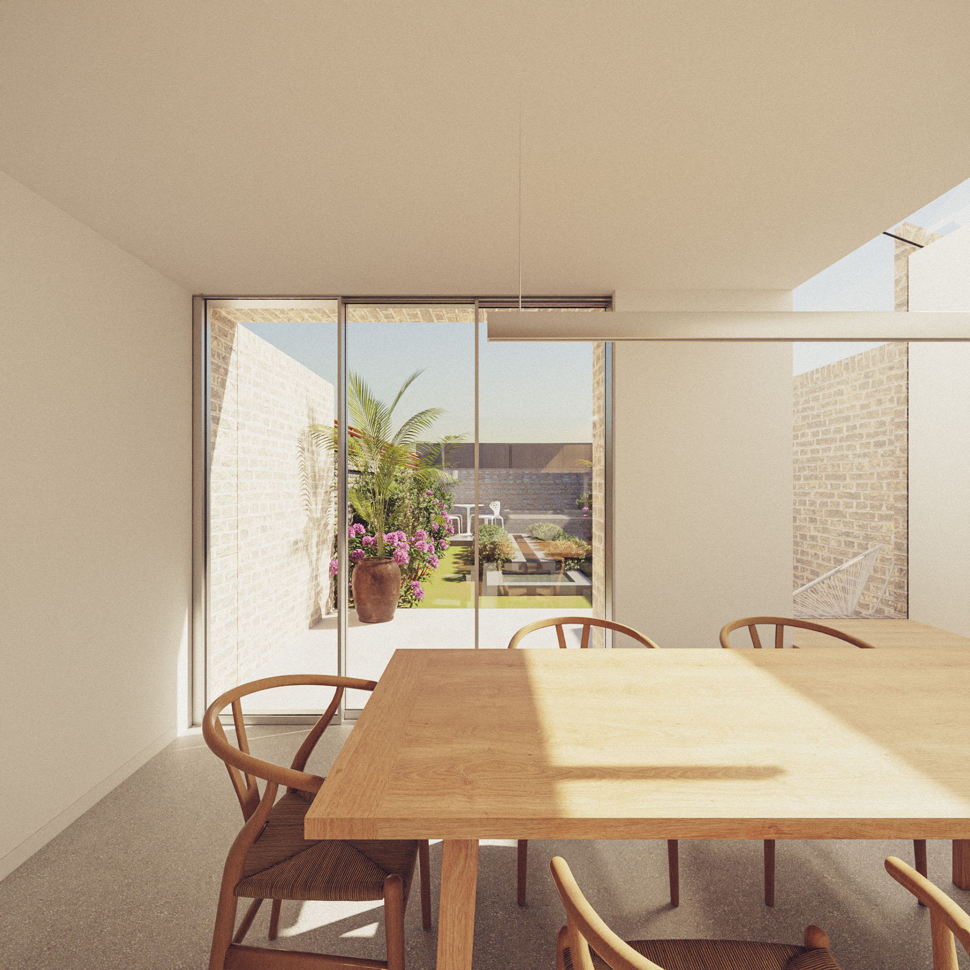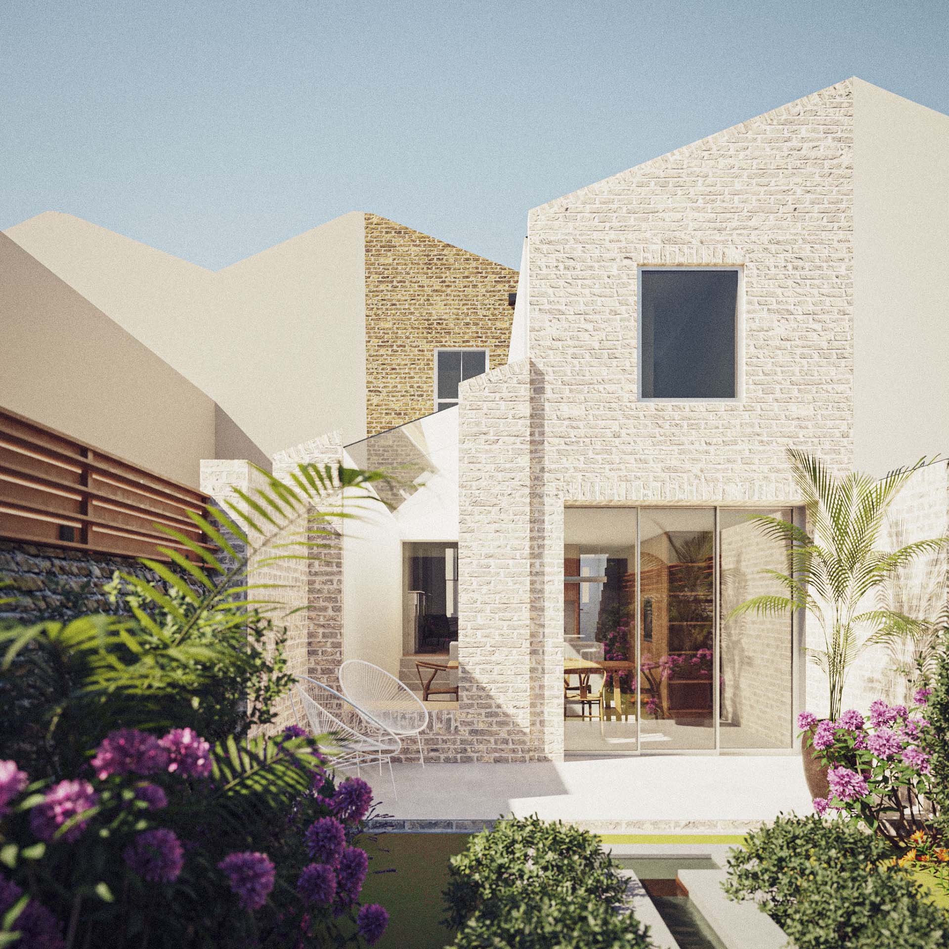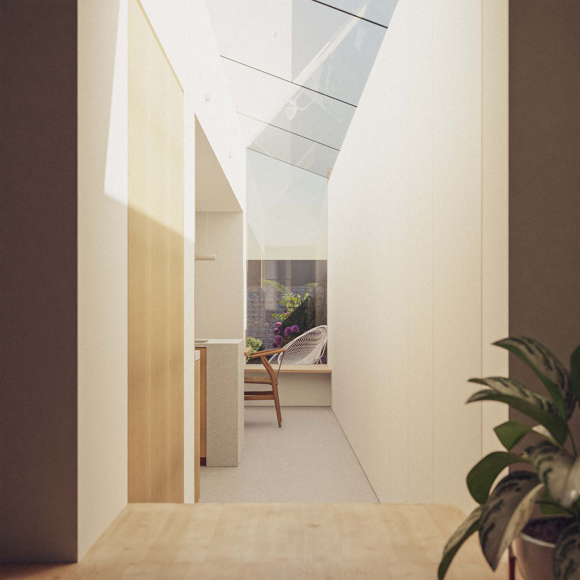 The property is a two storey mid terrace house with a narrow outrigger and cellar and there was no direct access to the rear of the property. The house is in a conservation area - “Tower Hamlets Cemetery”. The garden is west facing, with the house receiving good levels of daylight. The over arching vision for the property was to create a light filled property with a main room at the back to contain a kitchen/dining/living space that opens out on to the garden.