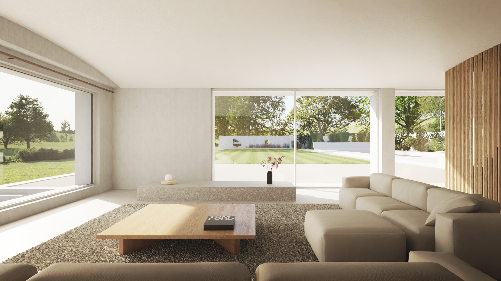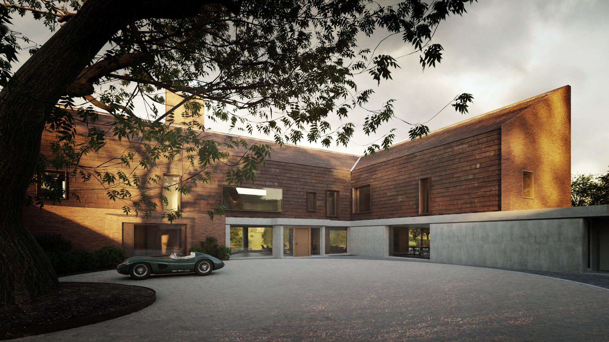 Our brief was to create a countryside house that prioritised privacy whilst maxmising the views across the rolling hills of Hertfordshire. The result was a contemporary take on the traditional farmhouse that closes itself off from the main road and opens wide to the south, embracing the sun and the surrounding environement. We set the house slightly further away from the road, and at a slightly lower level than the existing property. Combined with a new boundary wall and deep planting, the impression from street level is that of a modest traditional two storey farmhouse. Traditional materials have been used, including handmade tiles and bricks from locally-produced clay, to embed the property into its surroundings. But it is the careful contemporary detailing that sets the house apart. Moving round to the south, the pitched roofs have gone and instead there is a bold expanse of brickwork punching towards the views. Omitting the pitched roofs allowed us to create dramatic internal spaces, with triple a height atrium and double height bedroom suites. The contemporary detailing continues, utilising concrete at ground floor level to create large spans allowing the spaces to flow freely into the gardens and out into the fields beyond. Set in 13 acres, the property benefits from five en suite bedrooms, cinema room, gym, spa, indoor and outdoor pools, wild meadows and formal gardens. The perfect countryside home. -- Hertfordshire - Architects - Architecture - Interior Design - Landscape Design - Sustainable Design - New Build - Private House