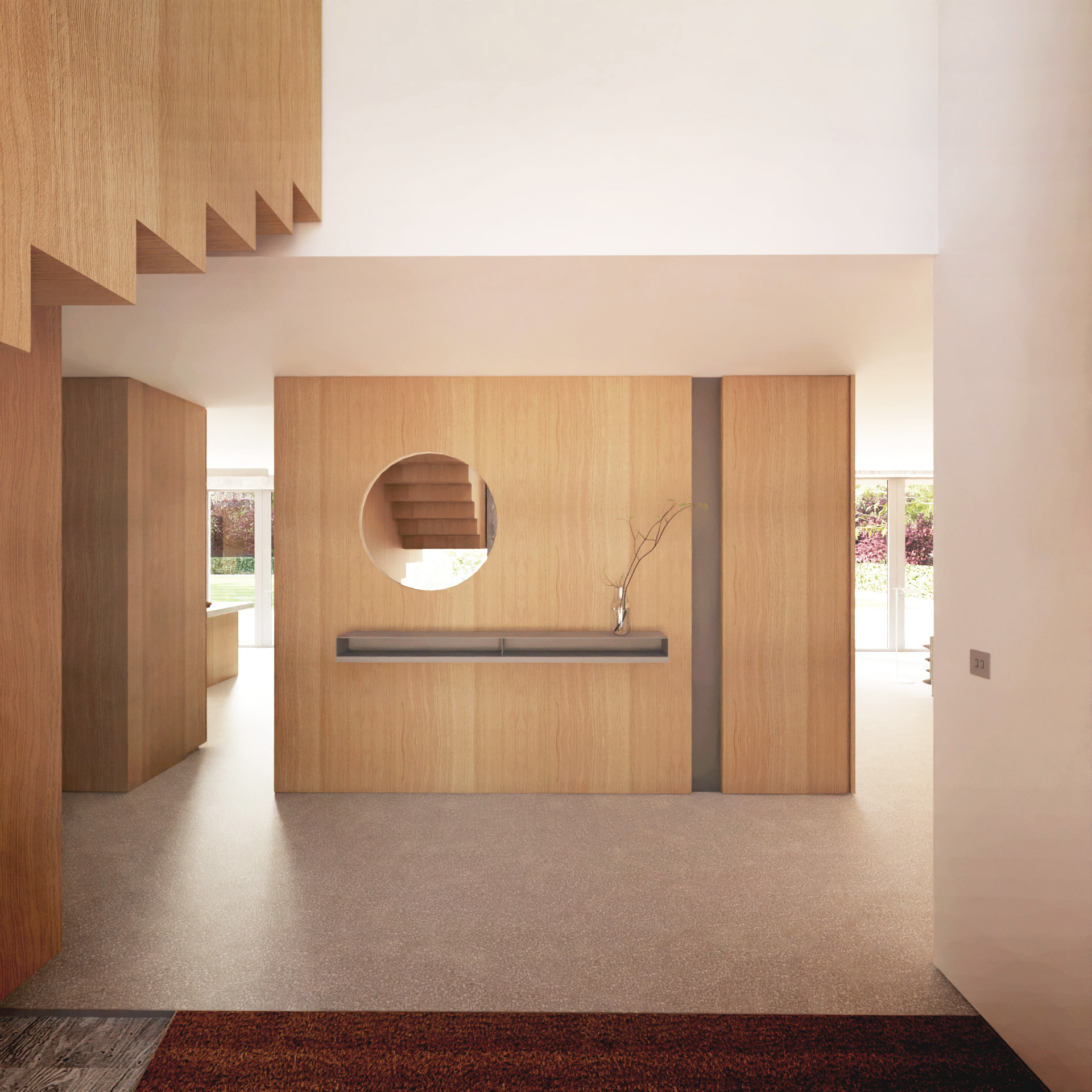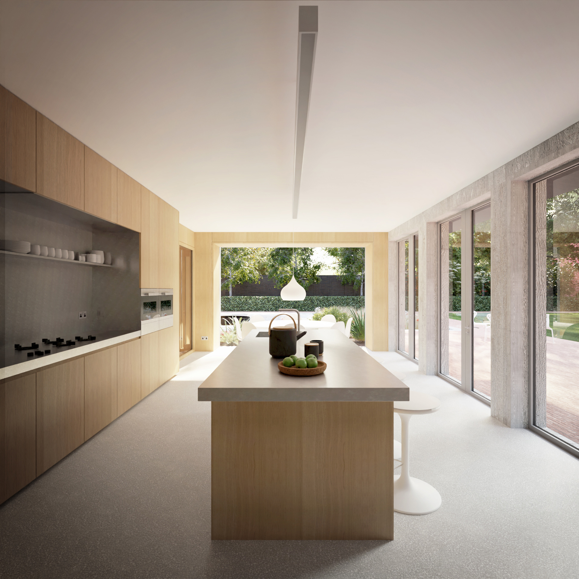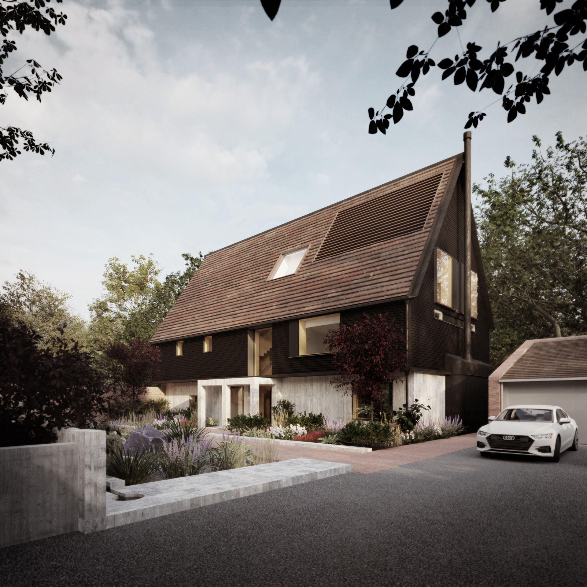 Norfolk House has been designed to provide a practical and comfortable escape from bustling city life to the peace and tranquillity of the countryside. It is smart, sensible and homely – a contemporary take on the crofter’s cottage – combining the charms of a rural setting with the best of modern design. It offers flexible living space that can be tailored to work as a main, second, or holiday home. The property offers four to six bedrooms. Two of the bedrooms could alternatively serve as a large home office and playroom, respectively. We have analysed the spaces thoroughly to make them work as hard and as efficiently as possible, minimising excess and wasted space. The proposal uses local materials where possible to reduce the building’s carbon footprint. The pallet of materials is refined and restrained, utilising timber and timber boarded concrete to give the internal spaces warmth whilst keeping the environments calm and simple. Externally the local vernacular of timber boards and clay tiles is invoked, with handmade bricks used walls and paths within the landscape. Air source heat pumps are concealed in the roof space which provided a sustainable source of heating for the building. Photovoltaic cells are located in the grounds and contribute to the energy consumption of the building. Batteries within the garage store this energy when not in use. -- Norfolk - Architects - Architecture - Interior Design - Landscape Design - Sustainable Design - New Build