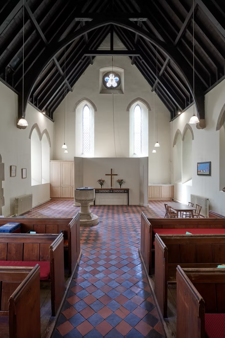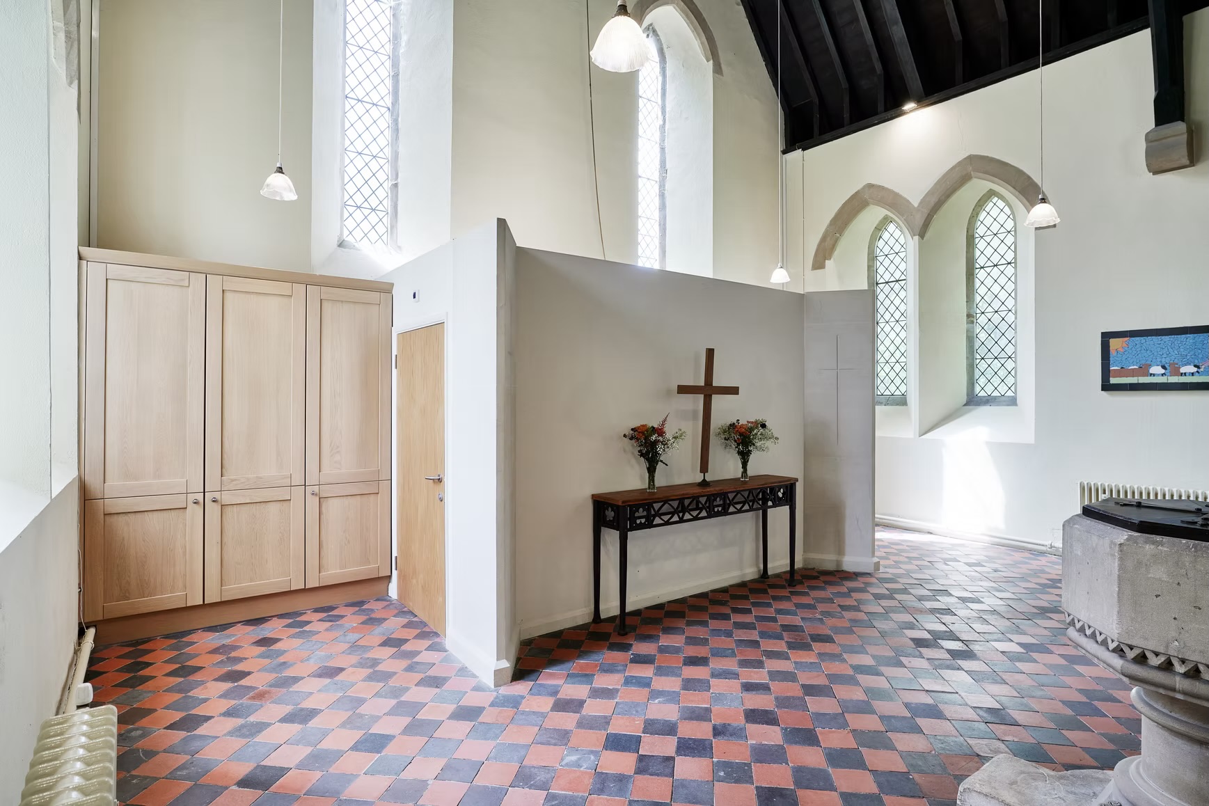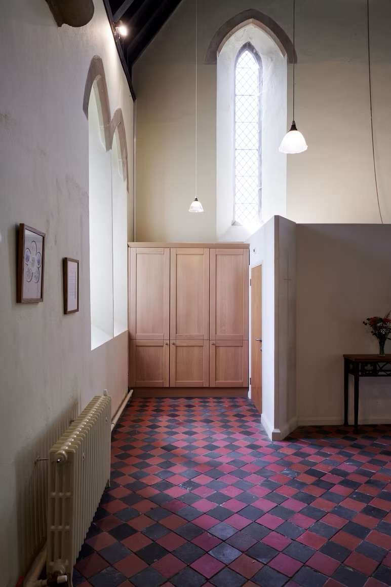 St Peters Church in Kington Langley is a Victorian, Grade II-listed building that had a functional 'Green Room' that needed complete refurbishment. Working with the Church's management committee, vicar and wardens we explored various options that would return the light to its wonderful interior. Functional aspects - disabled WC, storage and kitchenette - were carefully hidden behind a new screen that was set back a respectful distance from the existing font. In setting the screen back, a generous entrance space was created that affords a much better opportunity for congregations to mingle either pre- or post-service. It also allows a greatly-improved space for christenings and baptisms to take place in. ?Victorian floor tiles were sourced from a far-flung Welsh reclamation yard through the tireless dedication of the church's team of volunteers; the result is a stunning - and seamless - extension to the previously-covered tiled floor.