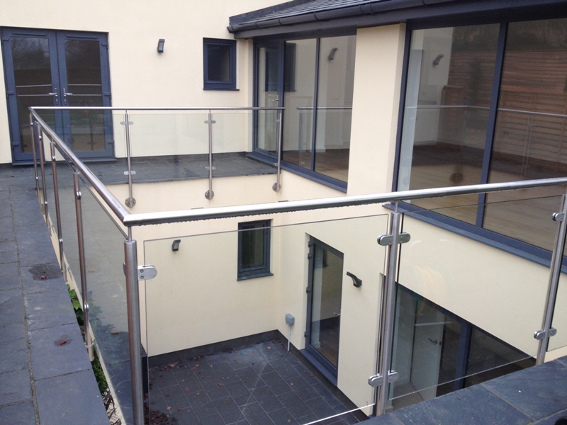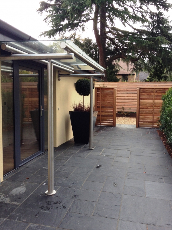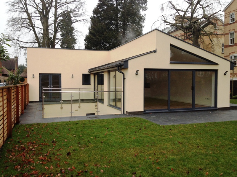 The design of two individual modern dwellings within a conservation area close to a town centre. Located within an important gap within the conservation area, the design for one dwelling was restricted in height in order not to impact on the gap and views from an adjacent park. We designed a lower ground floor area containing bedrooms, bathrooms, multifunction room and a plant / utility area, off a hallway with access to a large lower ground floor patio providing natural daylight an pleasant outlook to the hallway, and master bedroom. Other rooms were served in the same way by a spacious light well/patio. The designs incorporate large glazed area set within rendered walls under a natural slate roof. Hard landscaping uses natural slate to match the colour of the roofing material. Sunken patios are guarded by all glass balustrading to minimise visual impact. Internal living areas are open plan, with vaulted ceilings and glazed guardings.