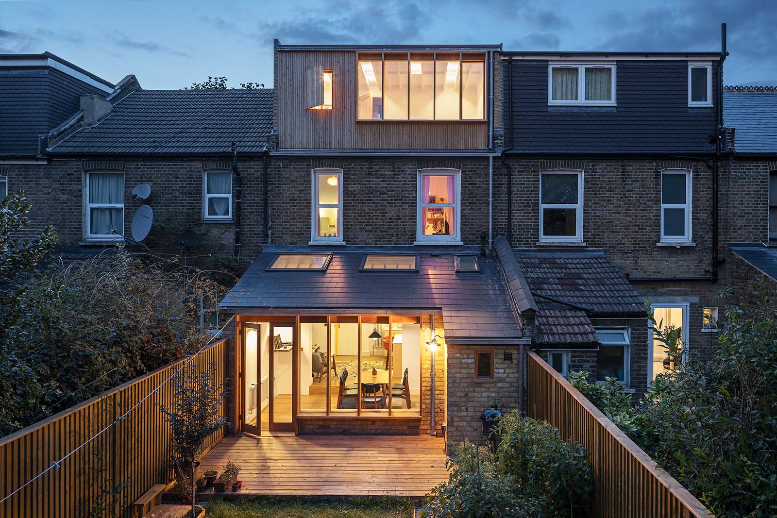 Trelawn Road, Leyton, London, UK Mike Tuck Studio completed the extensive remodelling and extension of a 3 bedroom town-house in Leyton, London. The house was a typical Victorian terrace which had ‘good bones’ but wasn’t suited for modern family life due to the ground floor bathroom and a very small 3rd bedroom. Erik, a photography teacher and Rachel, a publisher of illustrated children’s books wanted to add space to the house but also dramatically change the quality of light. The rear of the house is south facing and looks over the Central Line and A12 road which posed the dual problems of noise and overheating. During a collaborative design process proposals emerged for a bespoke, robust timber framed glazed façade which could offer shading to the windows while allowing ambient light deep into the rooms. Quick hand-sketches were used to develop the design and convey the spirit of the proposals to the client. It was important that the roof extension and ground floor addition should speak to each other and be seen as a single piece of architecture, particularly given the prominence of the back of the house from a nearby pedestrian footbridge. Siberian larch and Douglas Fir timbers were chosen for their resilience to external use while being sustainably managed and easily obtainable. Internally the kitchen was a bespoke Ikea hack made from birch plywood which helped to keep the costs down. The client also manufactured their own bespoke concrete sink for the bathroom.