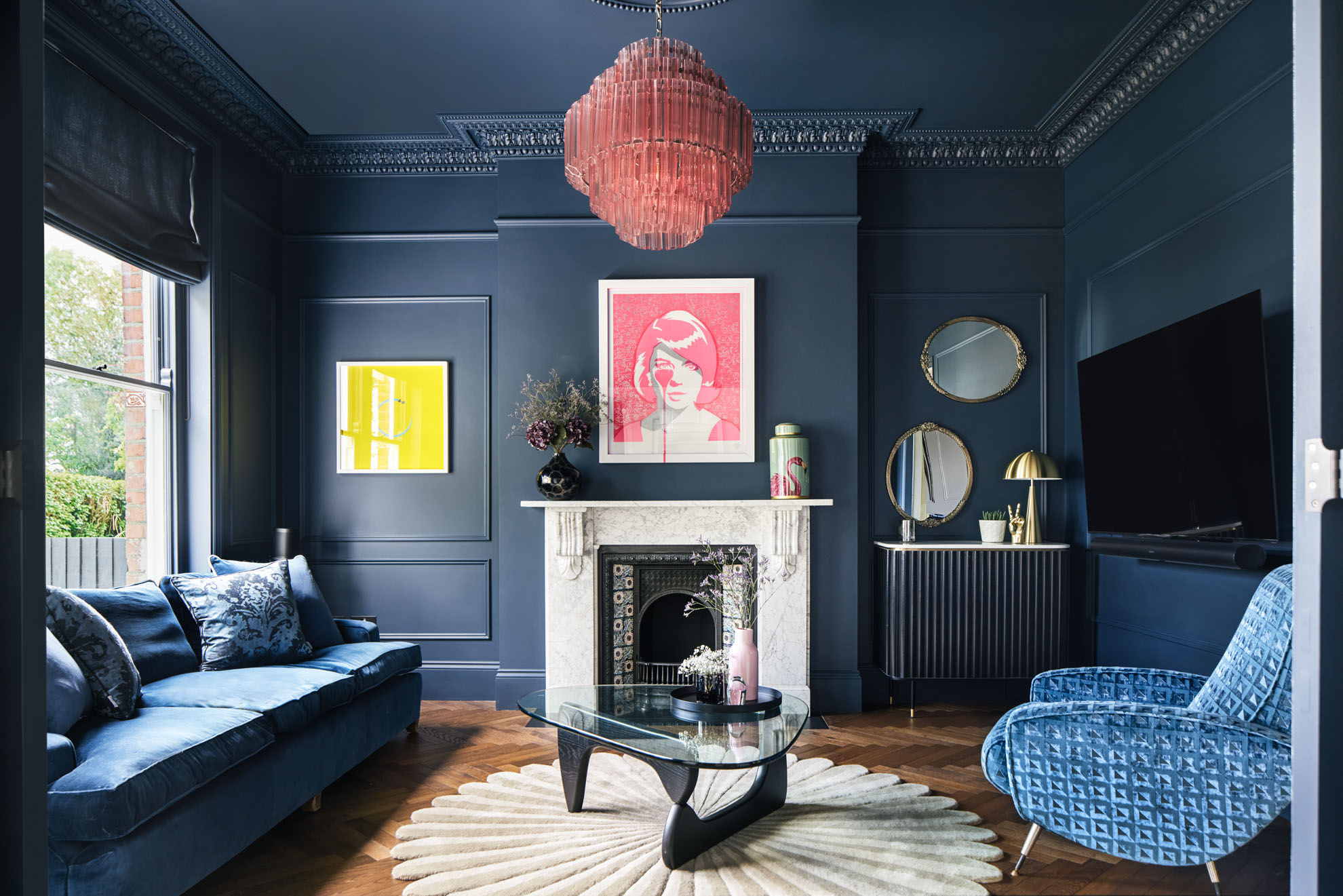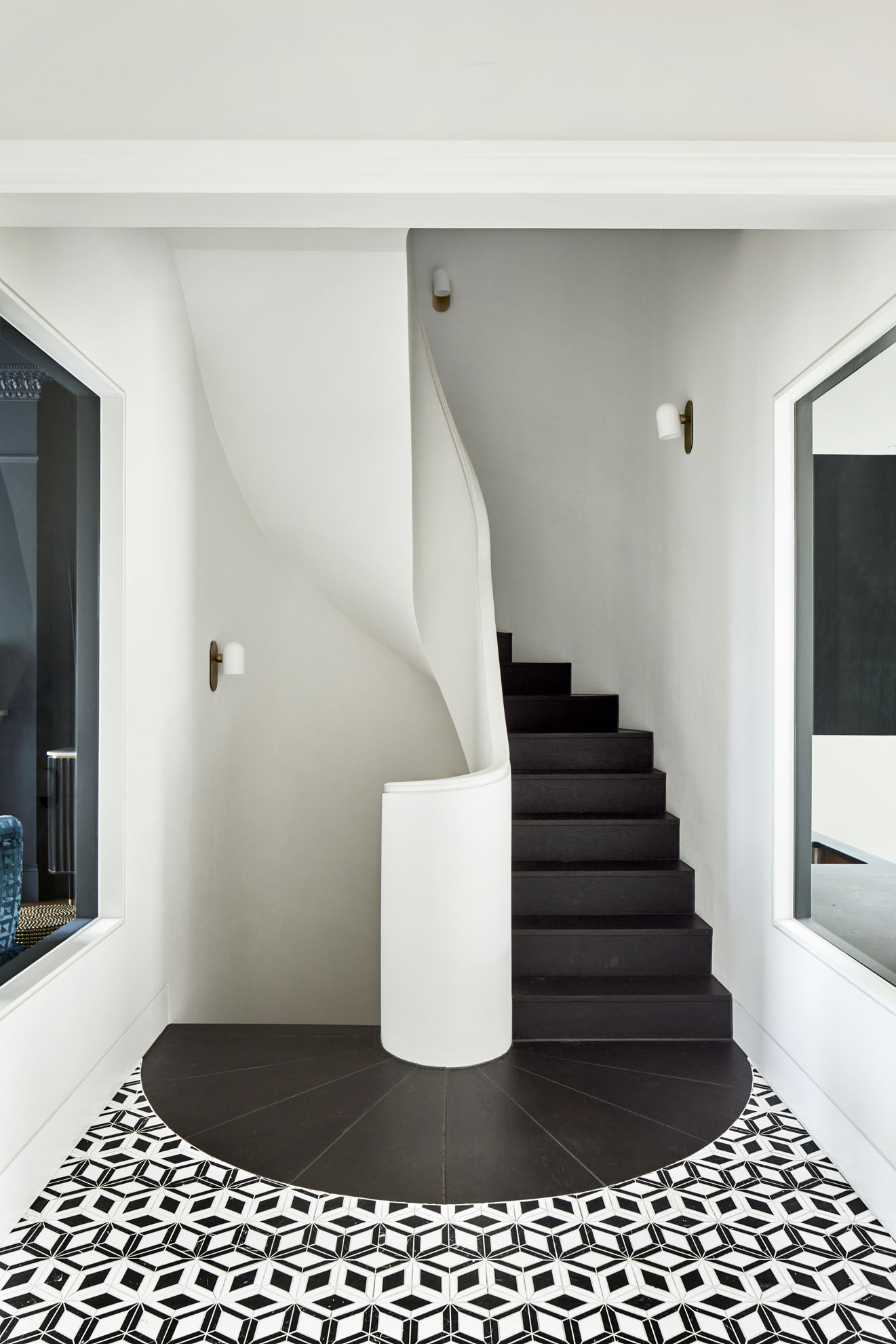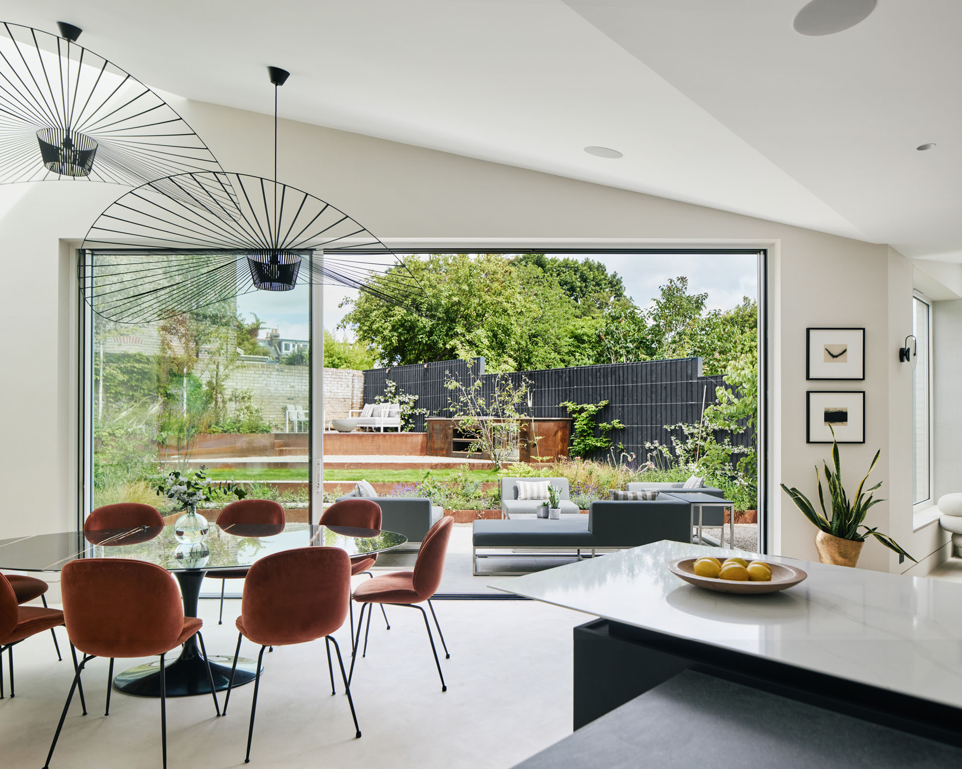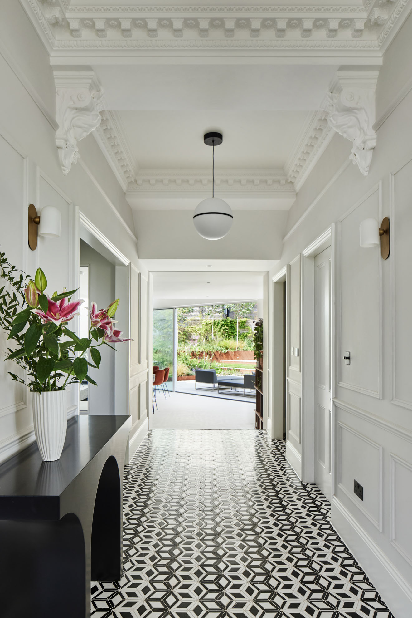 We moved the awkward stairs to a more natural position to one side of the hall, opening up a clear sight line to the garden from the front door. A new lightweight extension replaces the old, a timber structure faced with white cladding and durable blockwork. Wanting to optimise views, morning light and space for planting, we set its back wall at a 45-degree angle to the existing footprint. It now reaches out 9 metres from the house, masking the blank wall of the neighbouring extension and giving longer connection between inside and out. Inside, the living space now has improved flow, rooflight at its furthest point drawing the eye up and through the space. We placed the doors of the more orthogonal front reception rooms opposite one another to give more of this open quality in the original part of the house.