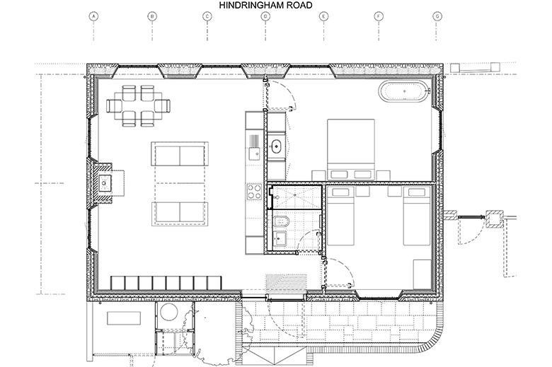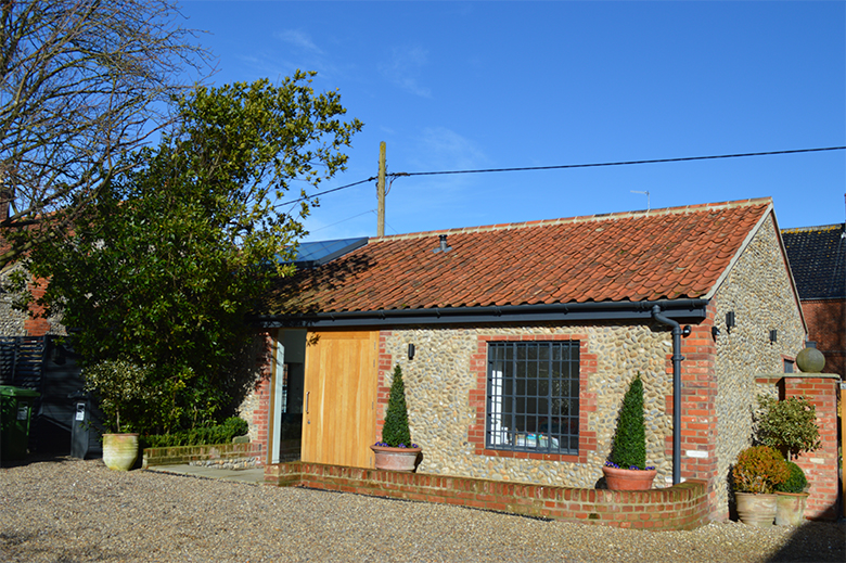 Originally work sheds to the local foundry, later a boat store, the Grade II listed Boathouse seeks to create a balance between a building that is mindful of its heritage whilst noting the Client’s brief for a contemporary finish. A renovation into a two-bedroom house, the new design maintains the rich vernacular of flint and red brick with openings of cast iron windows. Our architectural and interior design approach aimed to establish a clear plan, enhance the Client’s living experience with high ceilings, light from above and use a simple palette of materials detailed to define each junction and structural element. The result balances heavy weight external envelope and lightweight contemporary additions. We integrated sustainable design solutions including • Air source heat pumps removed the client’s reliance on oil and in conjunction with a booster it worked to provide heating for domestic hot water. • Passive ventilation aids and thermal mass help to mediate temperatures • Local reclaimed red brick and flint for perimeter walls, reclaimed local pan tiles for the roof and FSC certified timber for the principle roof beams, engineered oak floor and front door. • A combination of improved fabric of walls and glazing, and a wood-burning stove contributed towards the sustainable strategy.