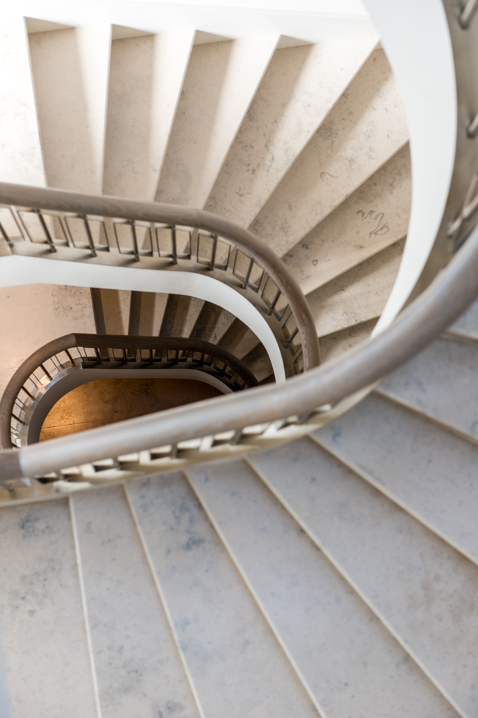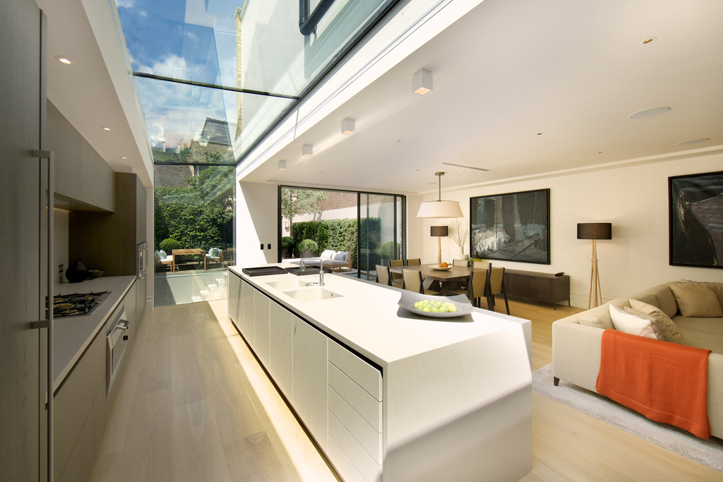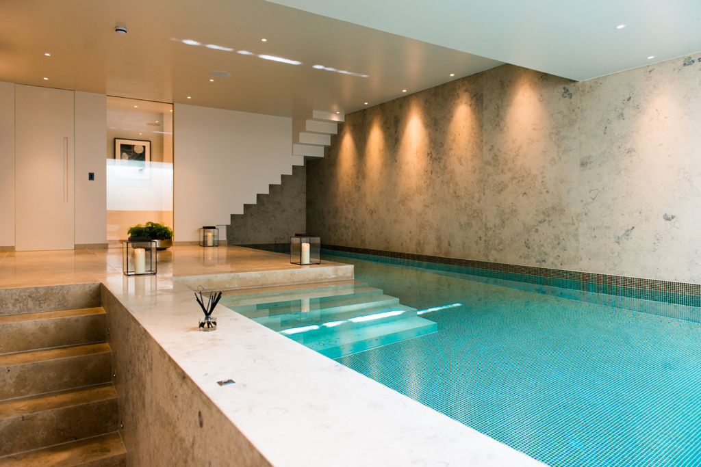 This property was one of 14 semi-detached houses dating from the early 19th Century. The properties were some of the earliest to be built on the street and historically had large gardens backing onto Campden Street to the North. Over time, mews houses were constructed at the end of their gardens and extensions added to the original houses. By 2011 this particular house had been altered almost beyond recognition creating a nonsensical and dark internal layout with a two very small rear courtyards for a gardens. Nash Baker Architects successfully obtained planning consent to demolish the two existing properties on the site, retain the historic façade of the 19th Century house, and create a single luxurious family home. Visitors enter the property through a new landscaped front garden to a formal entrance. Once inside they are drawn into the wide entrance hall where they discover a dramatic stone clad helical staircase cutting through the building and dropping natural light into the heart of the house. Off the main hall you find both a traditional reception room with 12 foot ceilings, and a contemporary, light filled, family living room overlooking the lush courtyard garden. The luxurious master bedroom occupies the majority of the first floor and provides attractive views down into the garden. A further 4 bedrooms on the first and second floors provide guest and family accommodation. The existing mews house has been re-built in a more contemporary style providing ancillary accommodation (2 additional bedrooms and bathrooms). It is connected to the main house via a new 300sqm basement which is accessed via a sculptural white staircase rising from the basement below. The large, spacious basement accommodates a well-appointed pool and spa, family media room, and formal entertaining space. Supporting the household is a second ‘catering’ kitchen, large staff flat and plant and utility rooms. The two elements of the house are linked at ground level by a tranquil garden designed by award winning international garden designer Luciano Giubbilei. Restrained planting, in conjunction with the ambient sounds of the reflective pool help to create a calm oasis within the city.