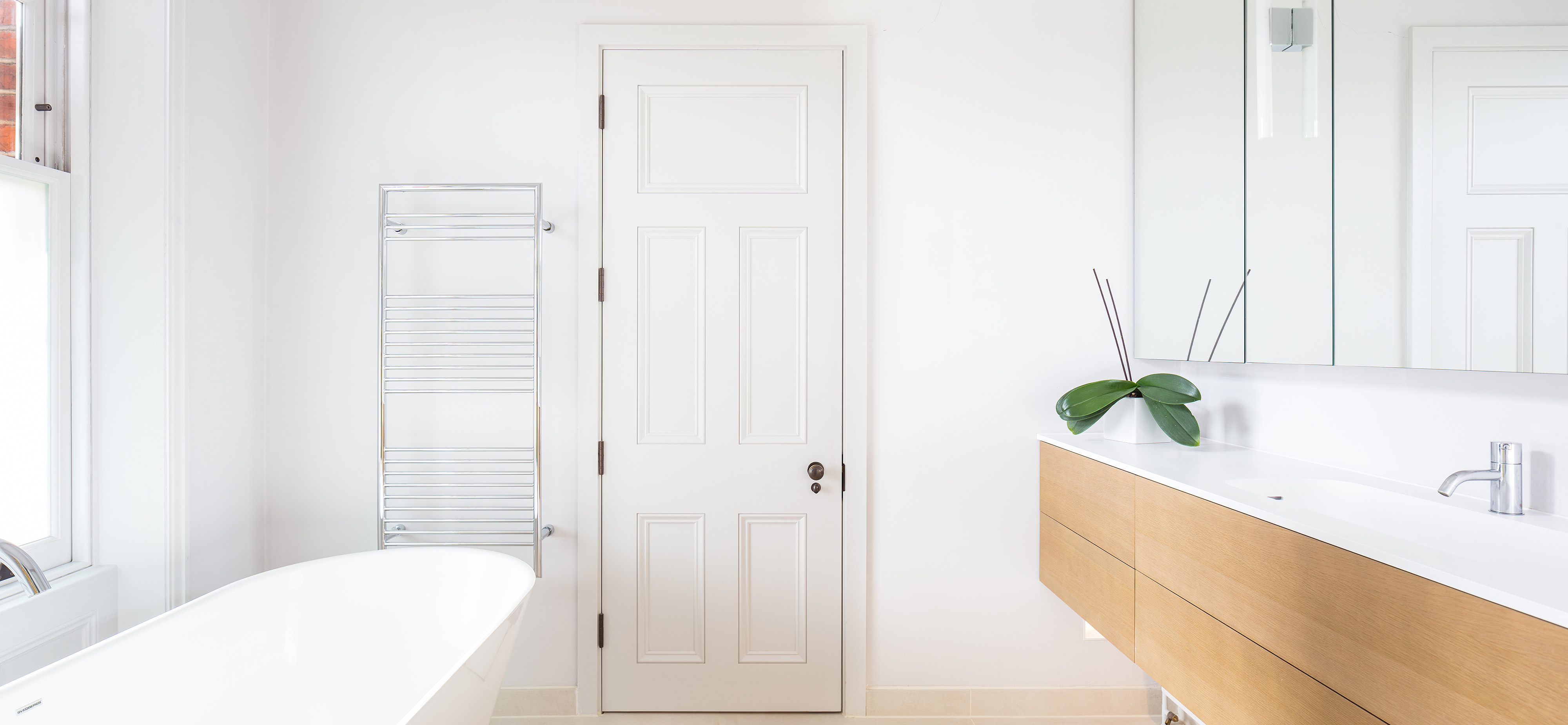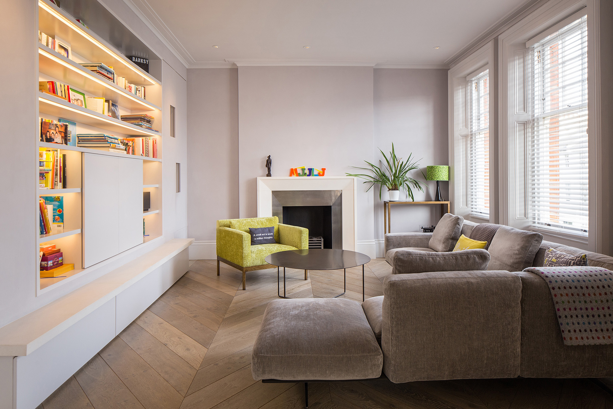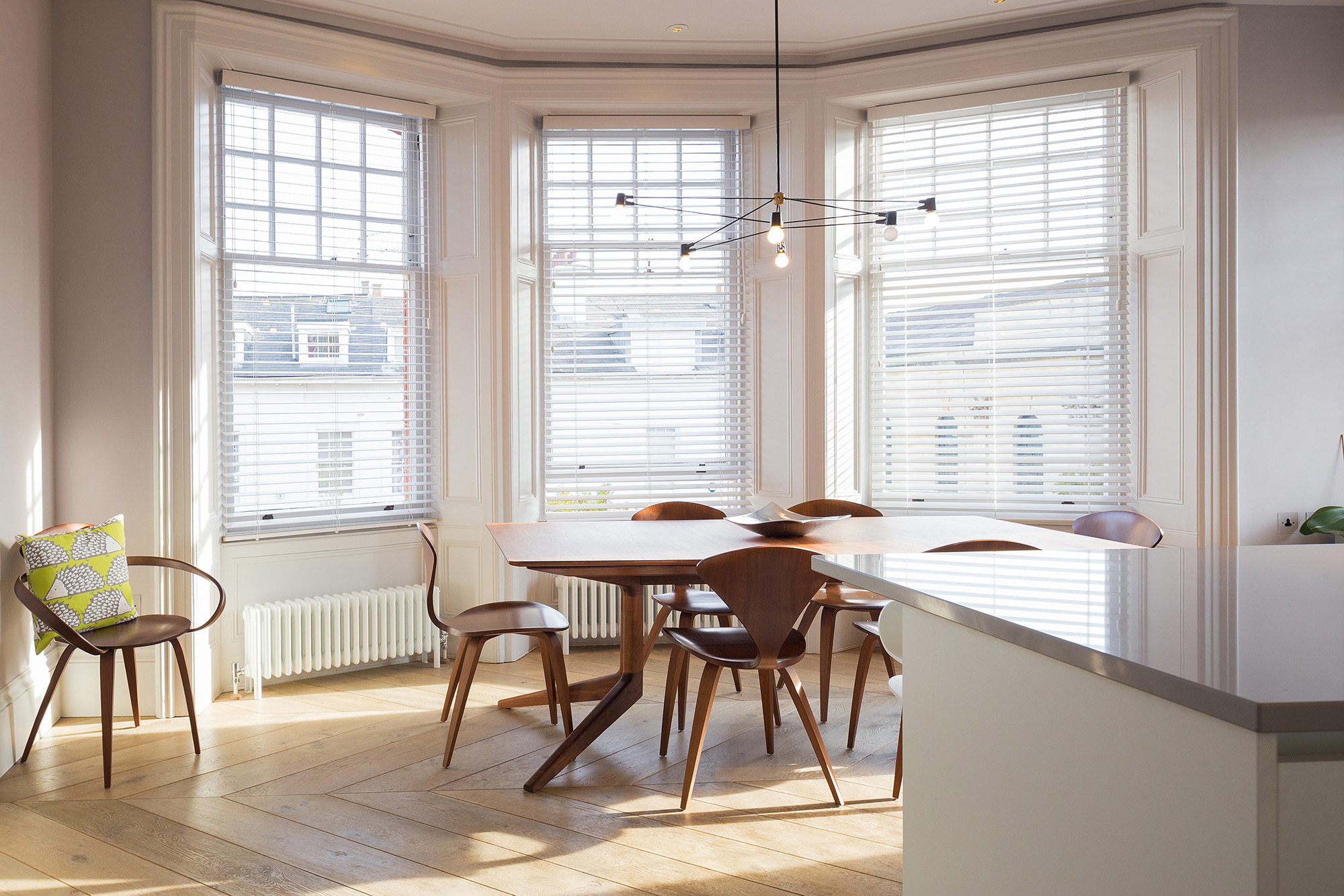 Completed in 1885, Wynnstay Gardens was one of the first purpose-built portered mansion blocks in this area of the borough, and has been fortunate to retain much of its original charm and features. This project involved the refurbishment and reconfiguration of a four bedroom apartment for a young family who were relocating from France. The design brief was to sensitively refurbish the entirety of the existing flat to a high contemporary standard; increase both bedroom numbers, and sizes; and install new bathrooms throughout. Nash Baker Architects sought to retain and restore the original character of the apartment, whilst addressing the requirements of a modern young family. By increasing the opening between the reception rooms, we were able to form a single family space; with a flowing kitchen, dining and living space. Relocating the kitchen to the main reception room provided a new central ‘heart’ to the apartment, and also enabled the additional bedroom and bathroom space required. Furthermore, a shower room was re-purposed to become a plant and utility room, and bespoke cupboards were formed in the hallway to fulfil storage needs. This complex project required planning consent, as well as landlords consent from the building management company. Floors and ceilings were acoustically upgraded, and, to satisfy residents’ concerns, a new fully waterproofed floor with leak detection system was installed to the new kitchen. Other works included: Bespoke fitted joinery, new floor finishes, floor reinforcement for free standing bath, thermally and acoustically upgraded sash windows throughout, and the installation of new electrical and mechanical services.