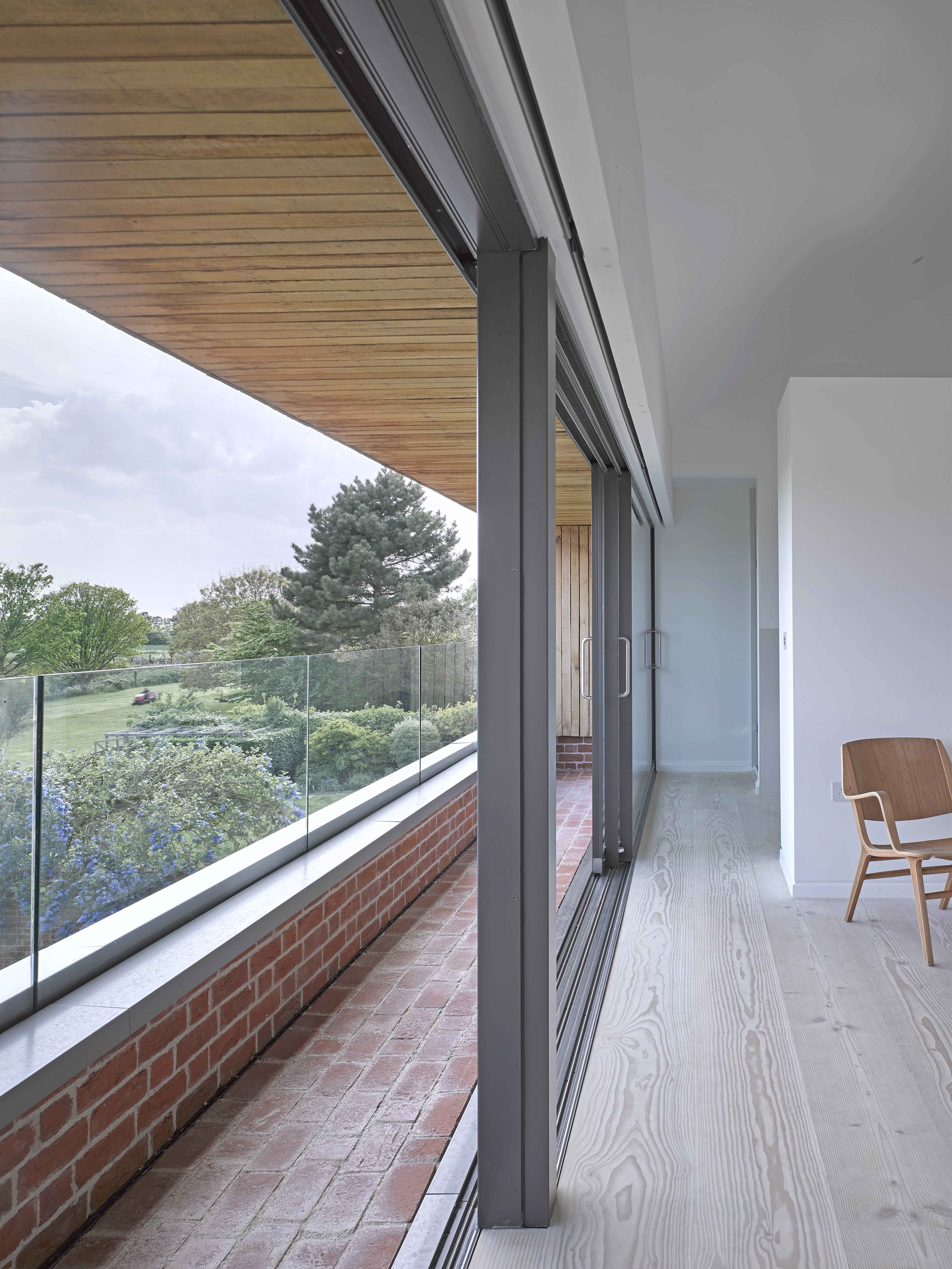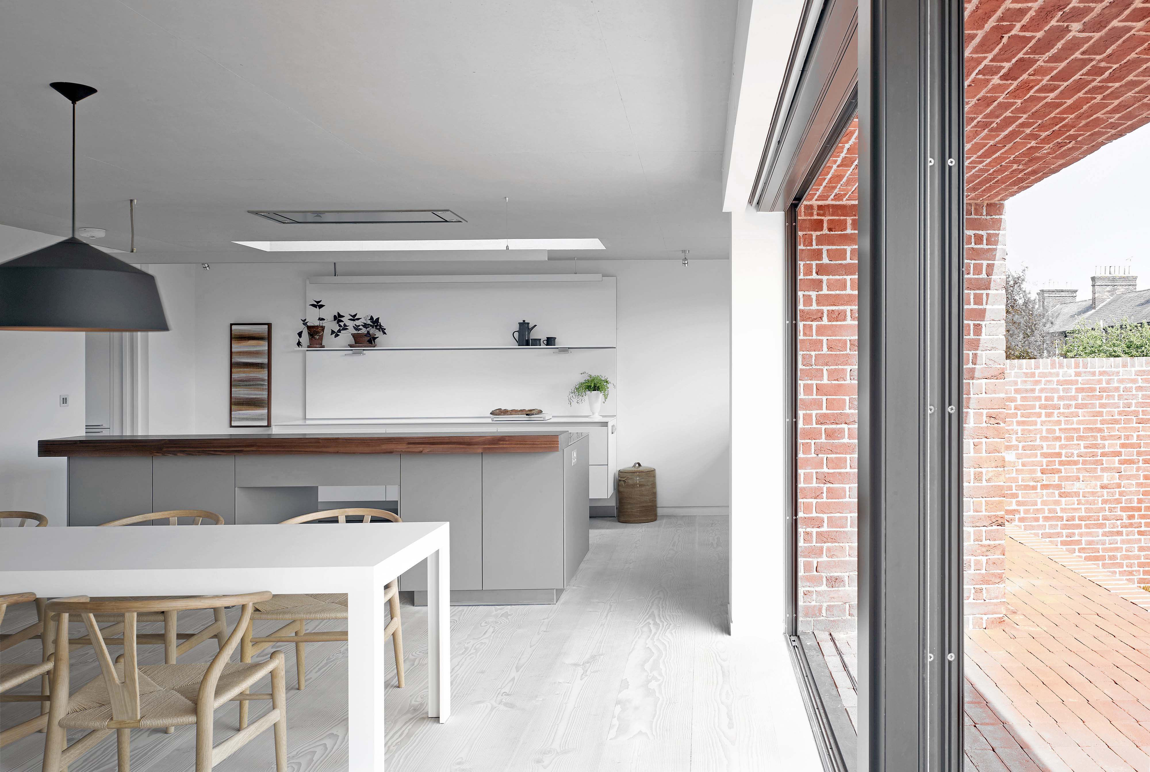 Our Suffolk brick house is new build home that utilises a palette of natural and traditional materials to blend with the rural street scene, and the exterior uses locally sourced oak cladding and handmade bricks to meld with the architectural character of the village. To create a more distinctive look, the bricks were laid using white iron-free sand for the lime mortar which was sourced from the local Wivenhoe pit. In contrast to the brickwork at the ground floor, the upper level appears lightweight, utilising ribbons of untreated oak cladding to wrap up and across a pitched roof. The oak cladding was sized to match the brick course dimensions so that the two elements of construction have a complimentary design intent. Internally, the house has a muted decorative scheme where the careful specification of materials and technical detailing have created a dwelling which is sensitive to its historic setting, yet unashamedly modern.