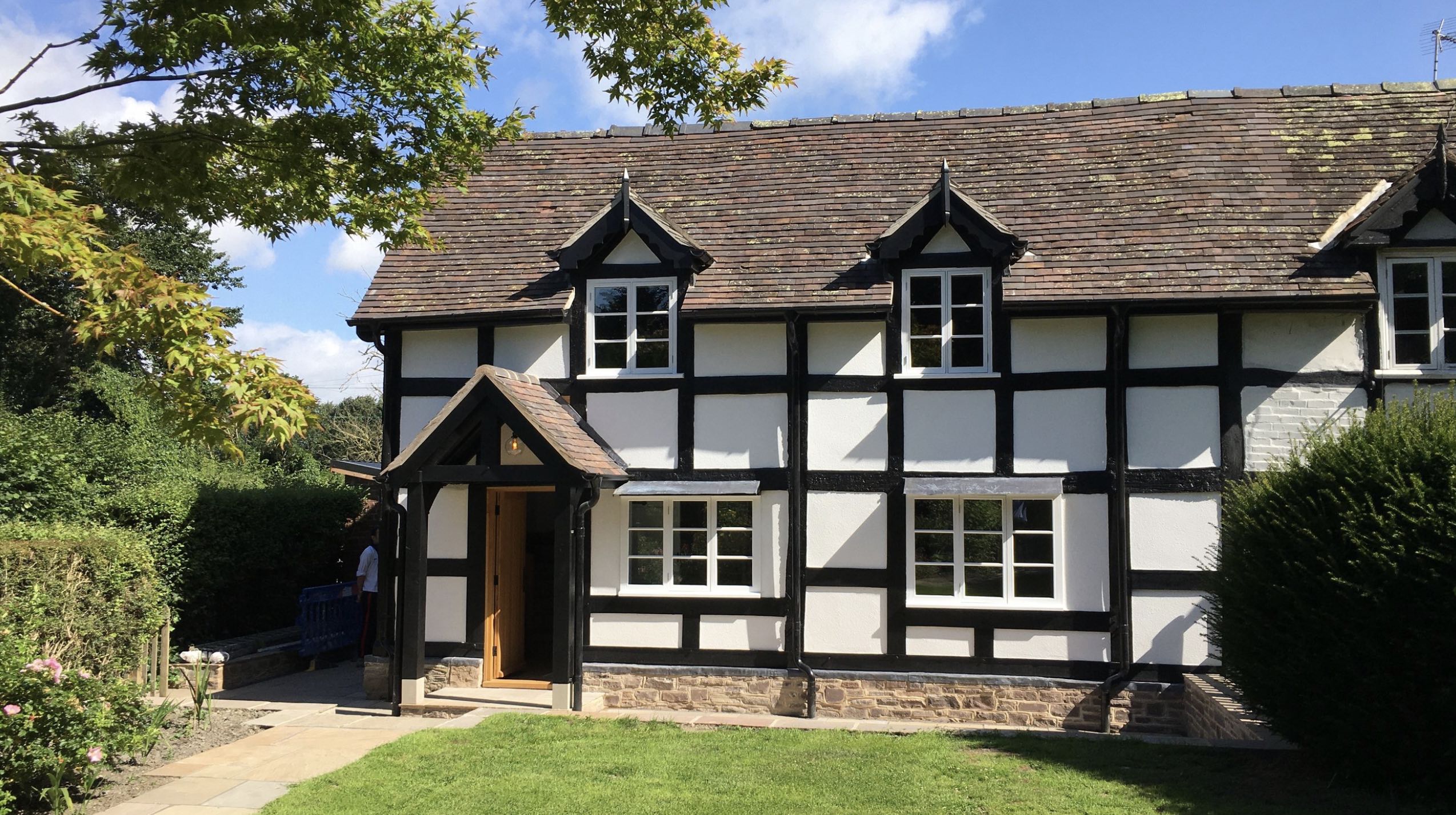 Set inside a Conservation Area within a north Herefordshire village, the project involved the sensitive restoration of an existing 19th C timber framed cottage, and addition of a new rear extension to provide additional bedroom and kitchen / dining space. The narrow gabled design of the extension respects the form and proportions of the original cottage, with the new walls constructed in a painted brick to remain legible as a separate and later addition when viewed with the original timber framed building. Project undertaken at Owen Hicks Architecture Ltd (c)