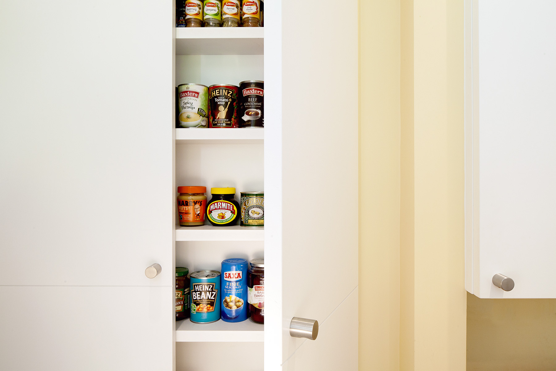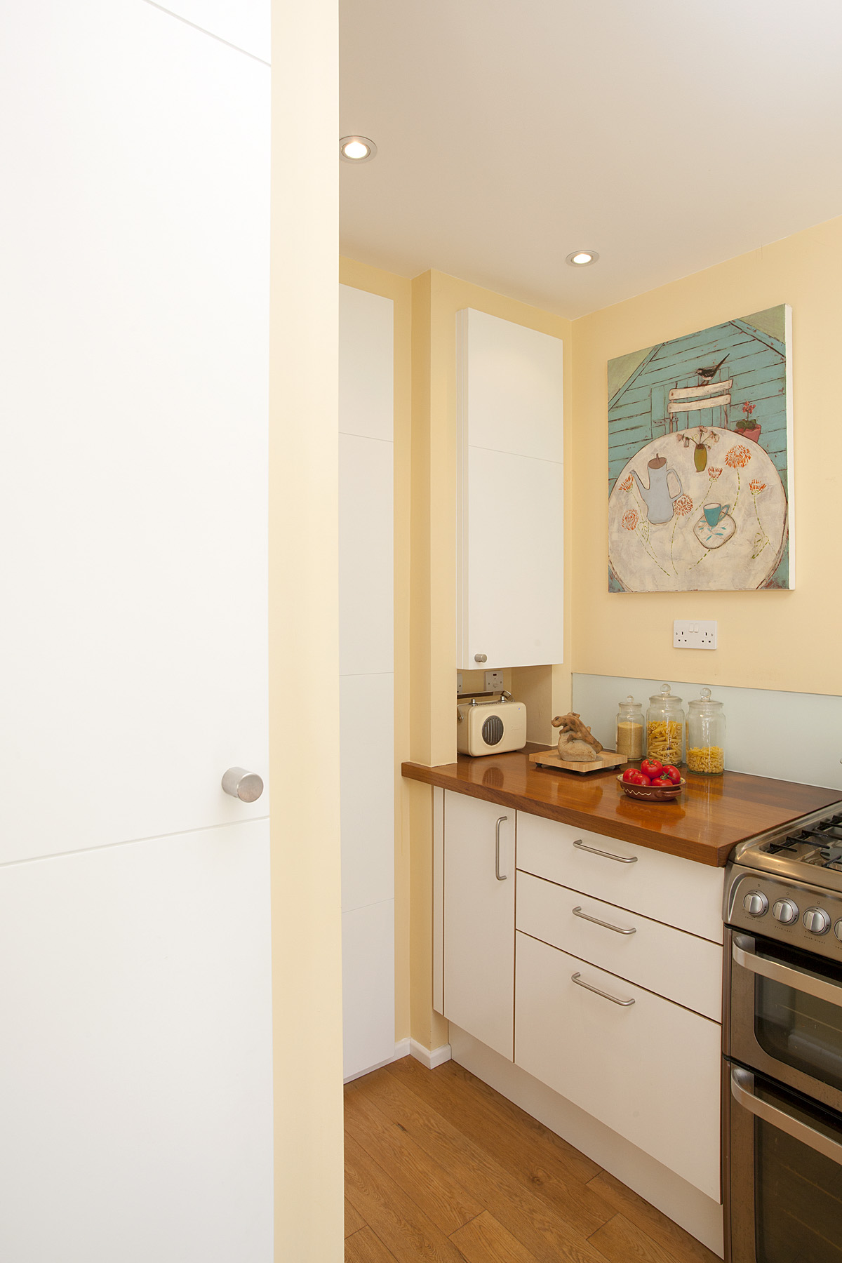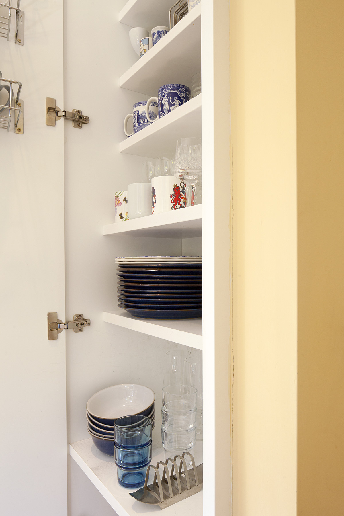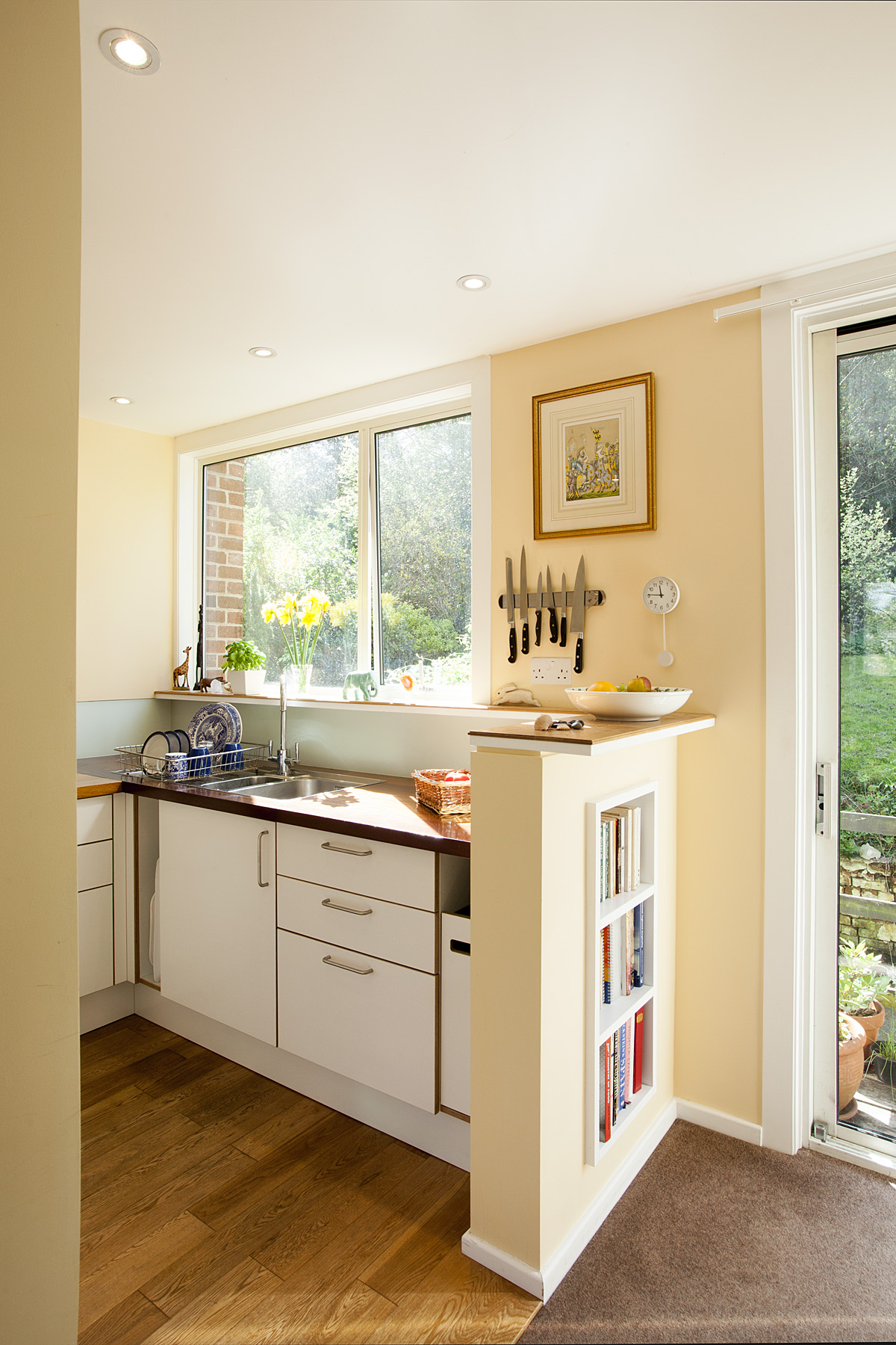 A tired and inefficient 1970s kitchen was replaced with a bespoke new kitchen. Wall units were eliminated, to give a feeling of spaciousness and light. Shelving depths and heights were varied, to make storage as efficient as possible.
