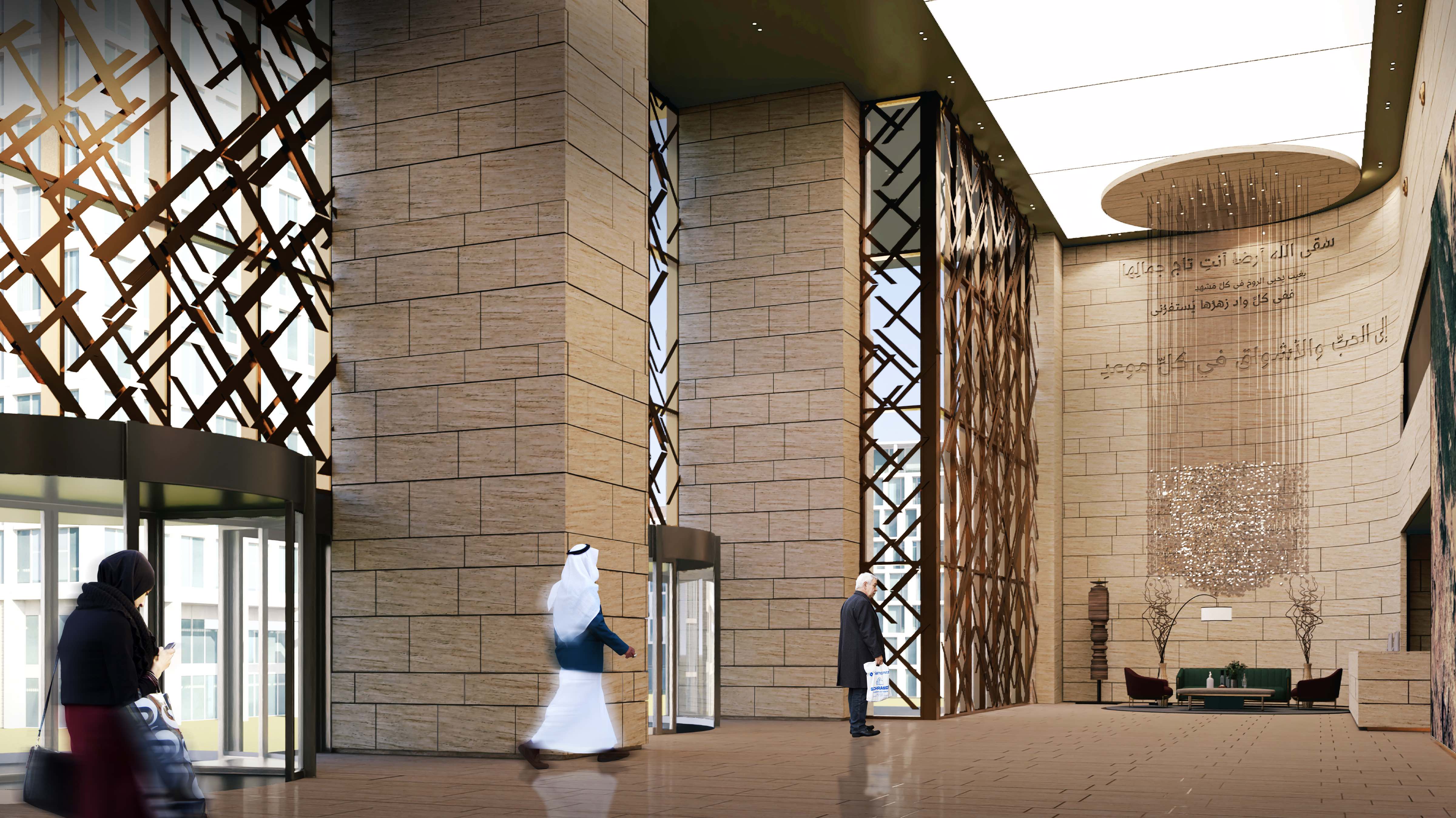 The project strongly references Najdi design, the architectural heritage of Riyadh, together with the Salmani architectural initiative which seeks to combine traditional devices and forms into contemporary buildings. nicholas was commissioned to design the office landlord areas, including lobbies and retail circulation space, together with selected office tenancies, totalling more than 10,000m2 in floor area. The design utilises a limited palette of traditional materials such as sandstone and brass, together with screens which cast shadow with the passage of the sun. The result is a discrete, respectful and forward-looking essay on the region’s cultural heritage – which is both relevant and something that tenants can be proud of.