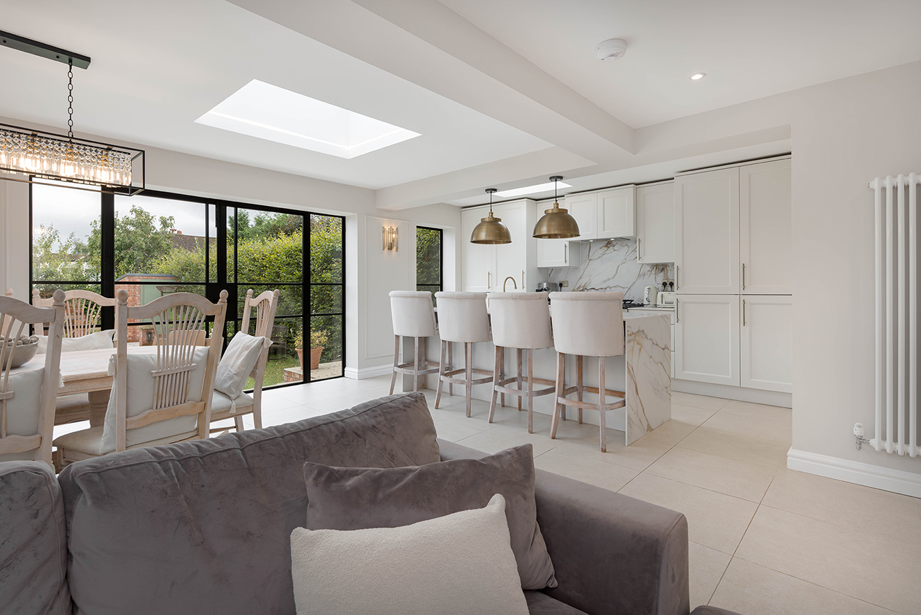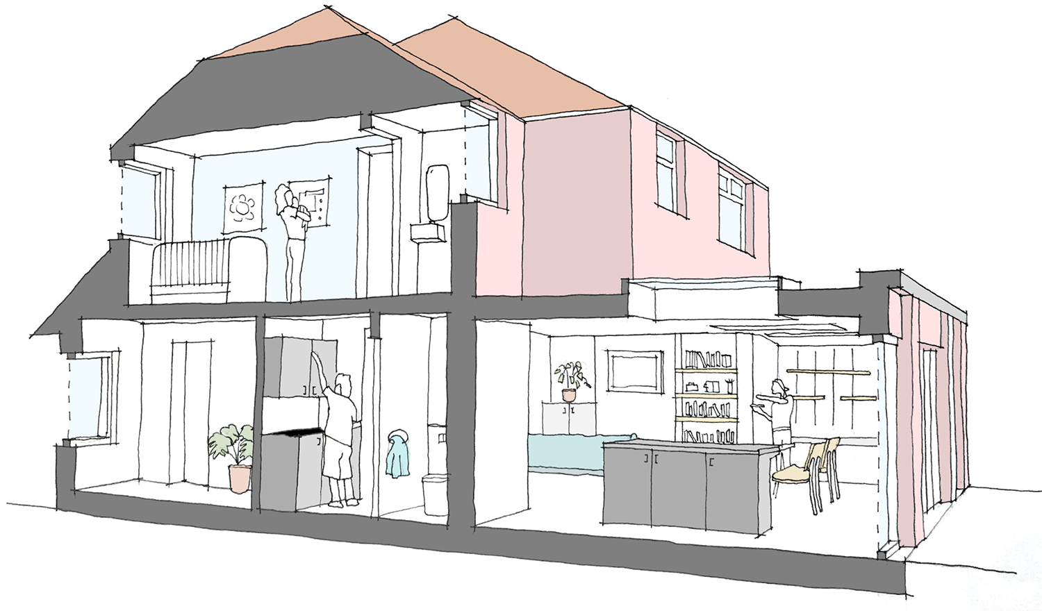 We were appointed to design proposals for an internal remodel and extension to an existing semi-detached family home. The solution includes a two storey side extension to bring the existing garage space back into use as part of the main house, whilst also creating a new en suite nursery on the first floor. The new space at the back of the house is used to create an open plan living room and kitchen/diner along with a separate utility cupboard to house the washing machine and dryer. Large windows and doors are used to connect the interior to outside and skylights will bring natural light deep into the plan. The project is due for completion later this year.