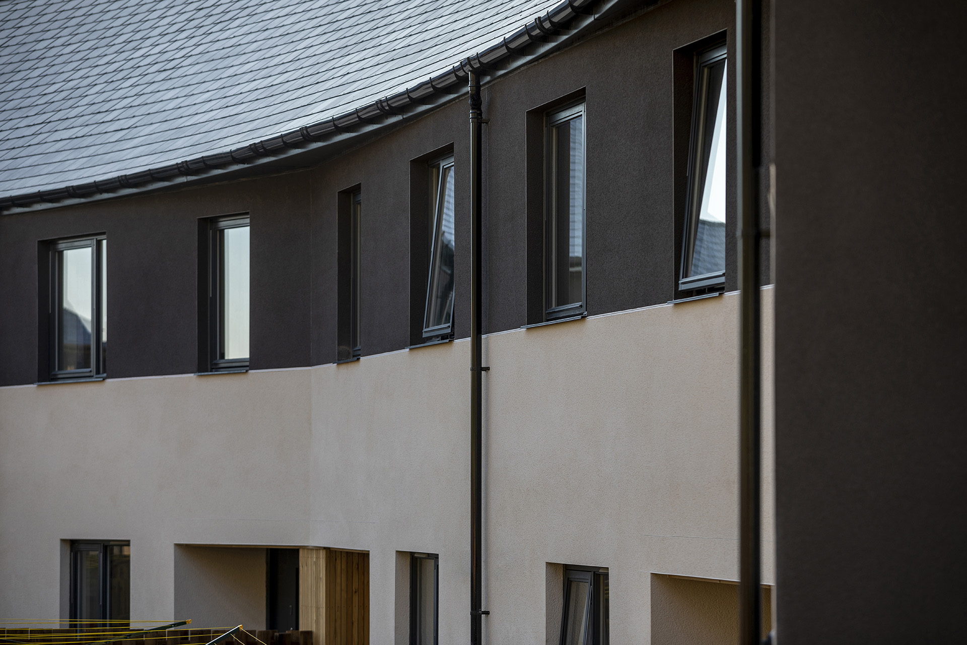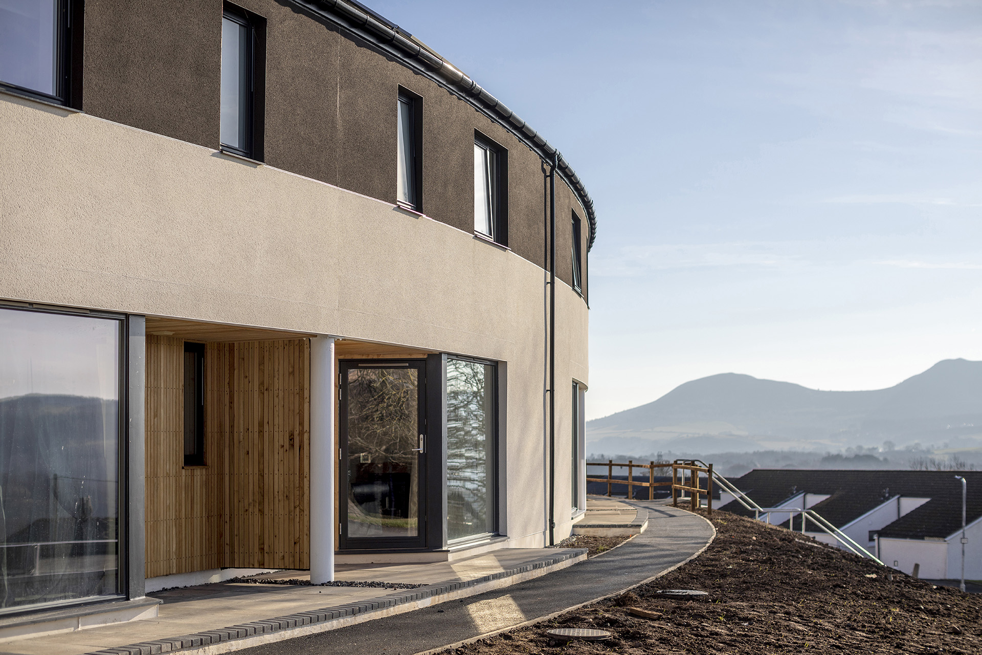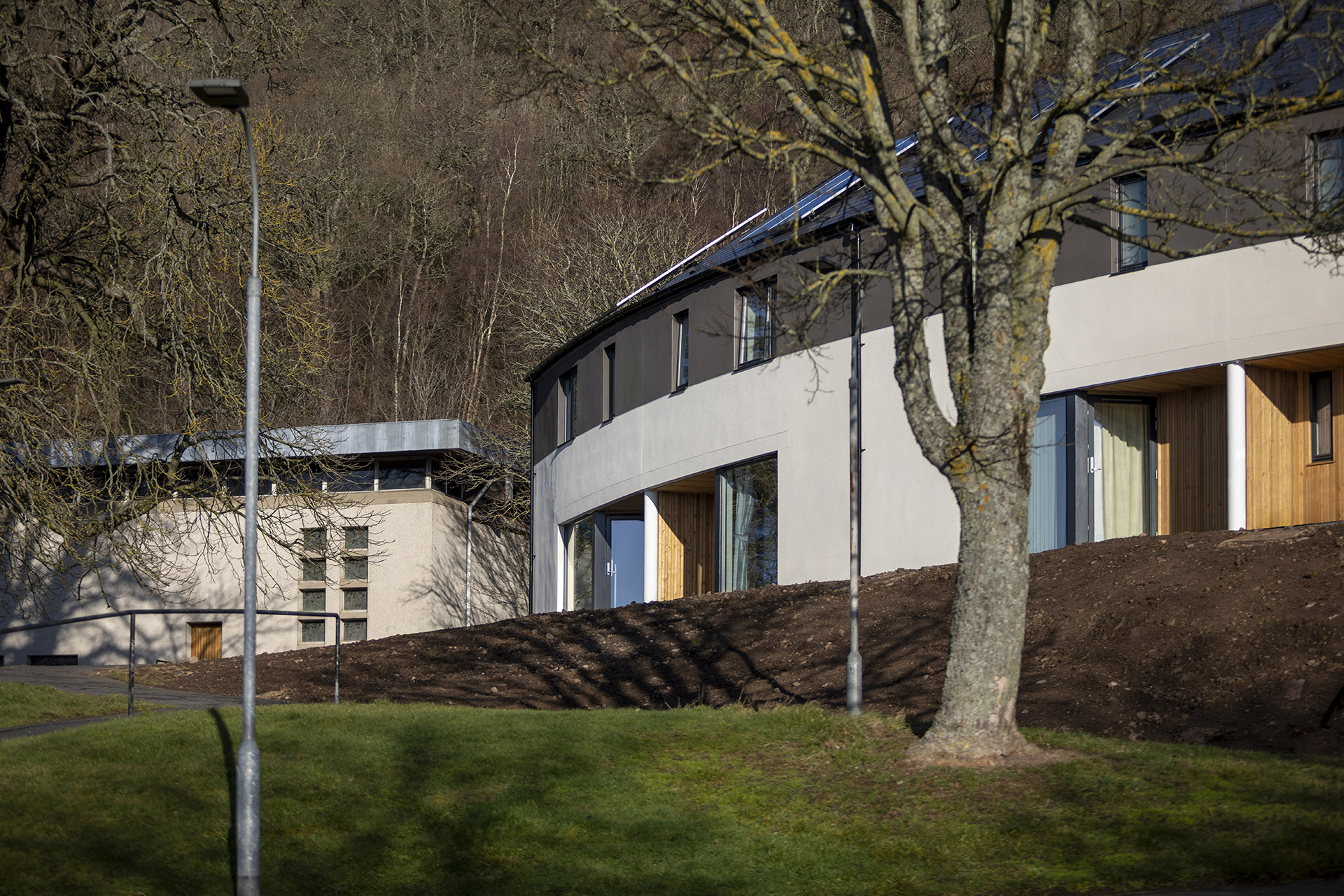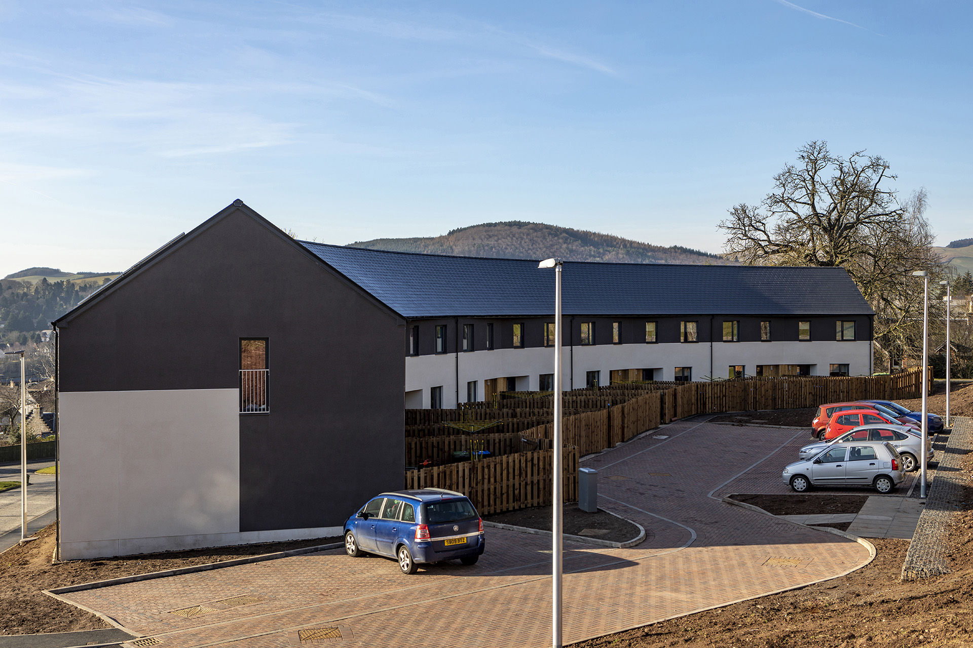 These ten affordable homes for Scottish Borders Housing Association, on the 1960’s Langlee housing estate in Galashiels, are arranged in a curved terrace. The site’s width and its relatively steep slope does not facilitate a conventional street of houses with regular public front and private rear sides. Both elevations of the new housing in this instance are public facing; the north elevation is a frontage with house entrances and the south elevation, with its good view across the valley to Eildon Hills, is also a frontage but one that represents the scheme to the wider neighbourhood. Therefore both elevations have to balance the competing public and private demands. Parking is placed on the north side of the site so the housing terrace conceals it. Considering that the Langlee housing estate is on the edge of Galashiels where the town meets the adjacent woodland and agricultural land, its architecture has a particularly urban scale. It is characterised by unconventional Modernist housing typologies; three storey point blocks to the north and west with a backdrop of four storey double maisonette blocks and terraced rows to the west, generally all set out with rigidity north and south aspects. Photos: Angus Bremner