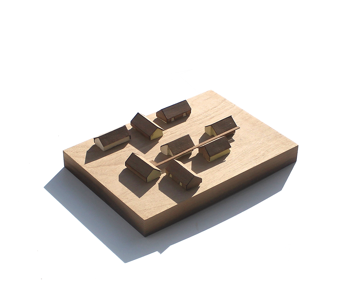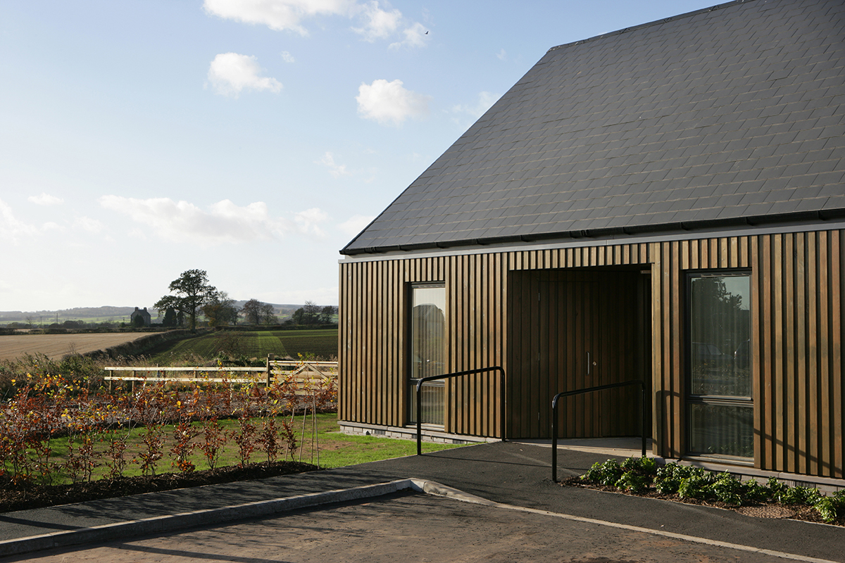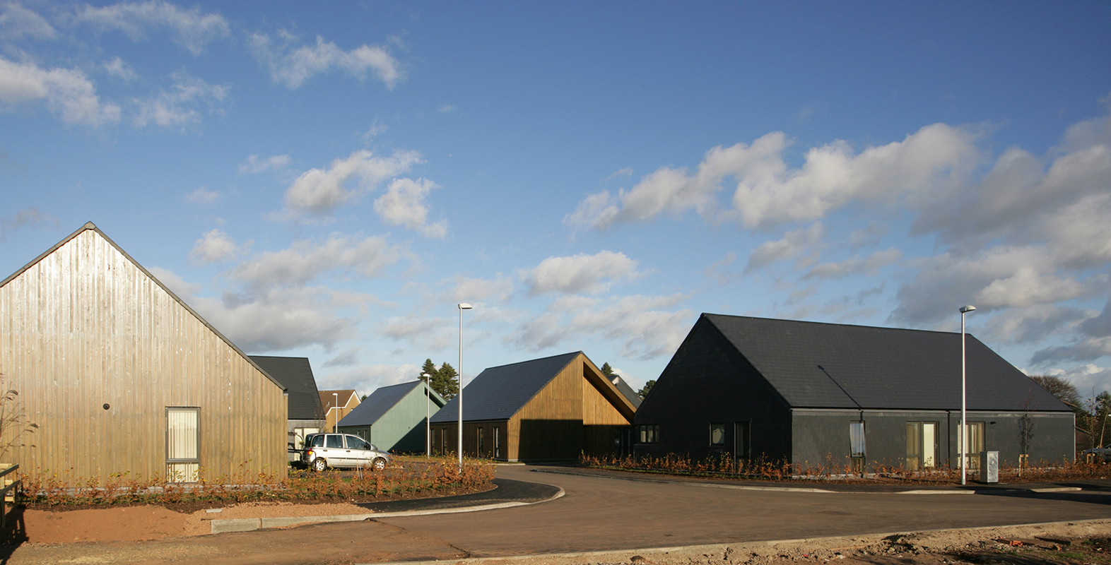 This development was for a community of individuals with a variety of care requirements. We worked closely with residents and their carers to help them with the transition from a traditional institutional rural care home to independent living with 24 hour local support close to Duns town centre. A ‘tartan grid’ of houses mixes alternate gables and eaves along the road giving character to the street. ‘Core’ houses for those with greater care needs, are connected via a linear covered walkway to a communal services building while cluster houses are arranged around the periphery. The commonly understood character of a home is created by the use of simple pitched roofs with gables at either end. Trim detailing emphasises these clean forms, while recesses provide sheltered inviting entrances to each dwelling. Mindful of a limited budget and stringent space requirements, the project employs simple means to provide a sense of calm, enhancing the domestic feel of the site. Three different colours of stained larch alternate across the houses, cladding pairs of adjacent long and gable walls in each building, while fibre cement slates continue down from the roofs to cover the remaining walls. Efficient floor plans provide comfortable spaces for wheelchair users to move easily around their homes, with assistive technologies, including ceiling mounted hoists, integrated into the design.