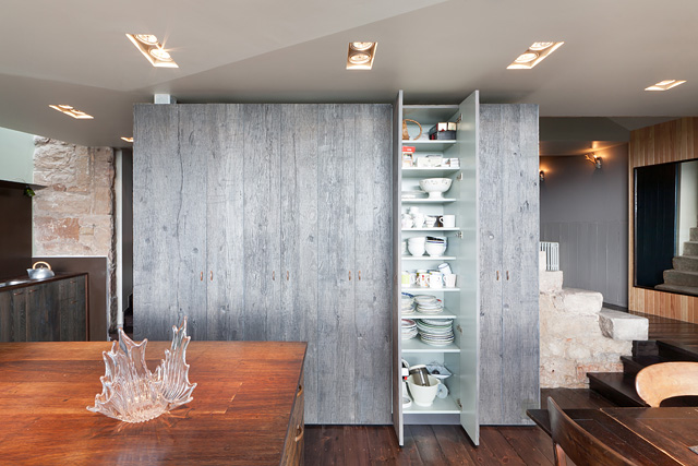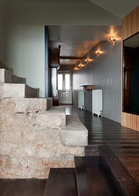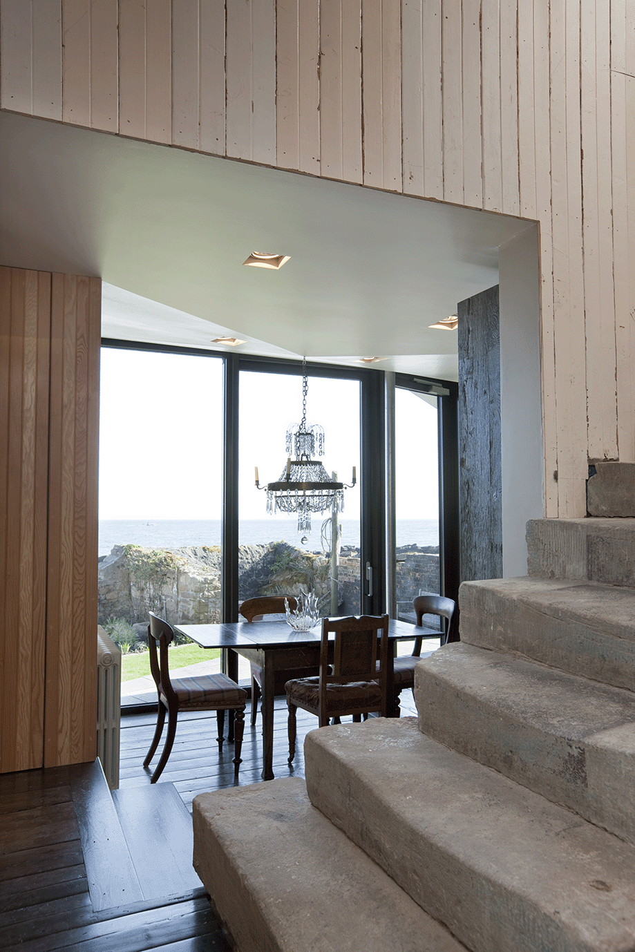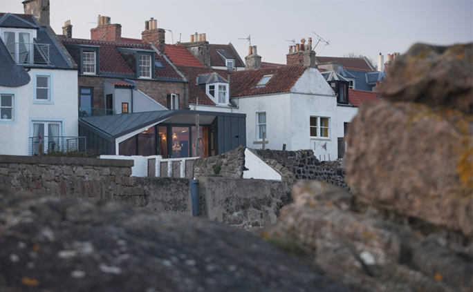 Commissioned by Ian Harding and Clare Checkland (artist), OCA designed this extension to an early 19th century fishing cottage over looking the sea between Anstruther and Cellardyke in Fife’s East Neuk. Dwellings in such settlements typically turn their back on the sea and are grouped closely together to shelter the narrow streets behind from the blustery gales. We wanted a living area that faced the sea, whilst retaining the introverted character of the other rooms in the house. A 19th century stair to the rear of the original house now forms the crux of the new plan, wrapped by a light glazed extension containing a new living room and kitchen. Clare Checkland’s interior design complements the patina of the house’s exposed shore-side setting. There is a deliberate contrast in light and scale when moving through the existing dwelling, heightened by oblique views and glimpses of the sea. The folded roof form and irregular plan of the extension makes reference to the slightly irregular existing dwelling and other cottages in the row. An angled glass rooflight brings additional natural light into the existing plan and helps to visually separate the new extension from the 19th century house. Photos: Angus Bremner
