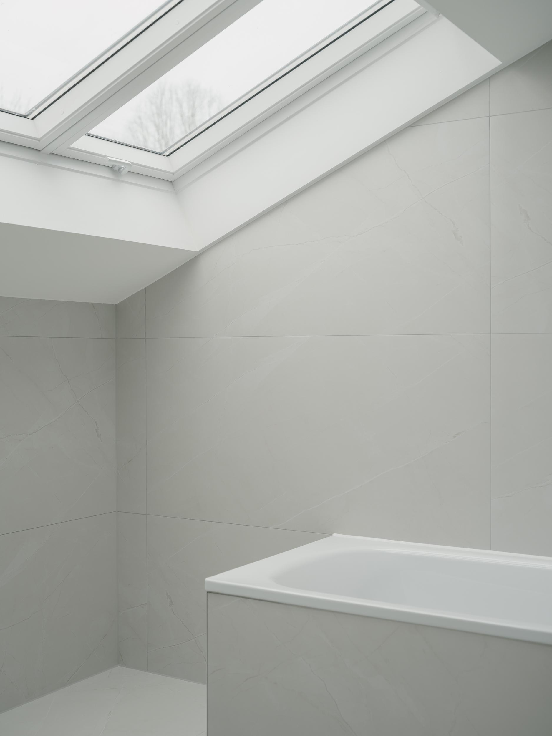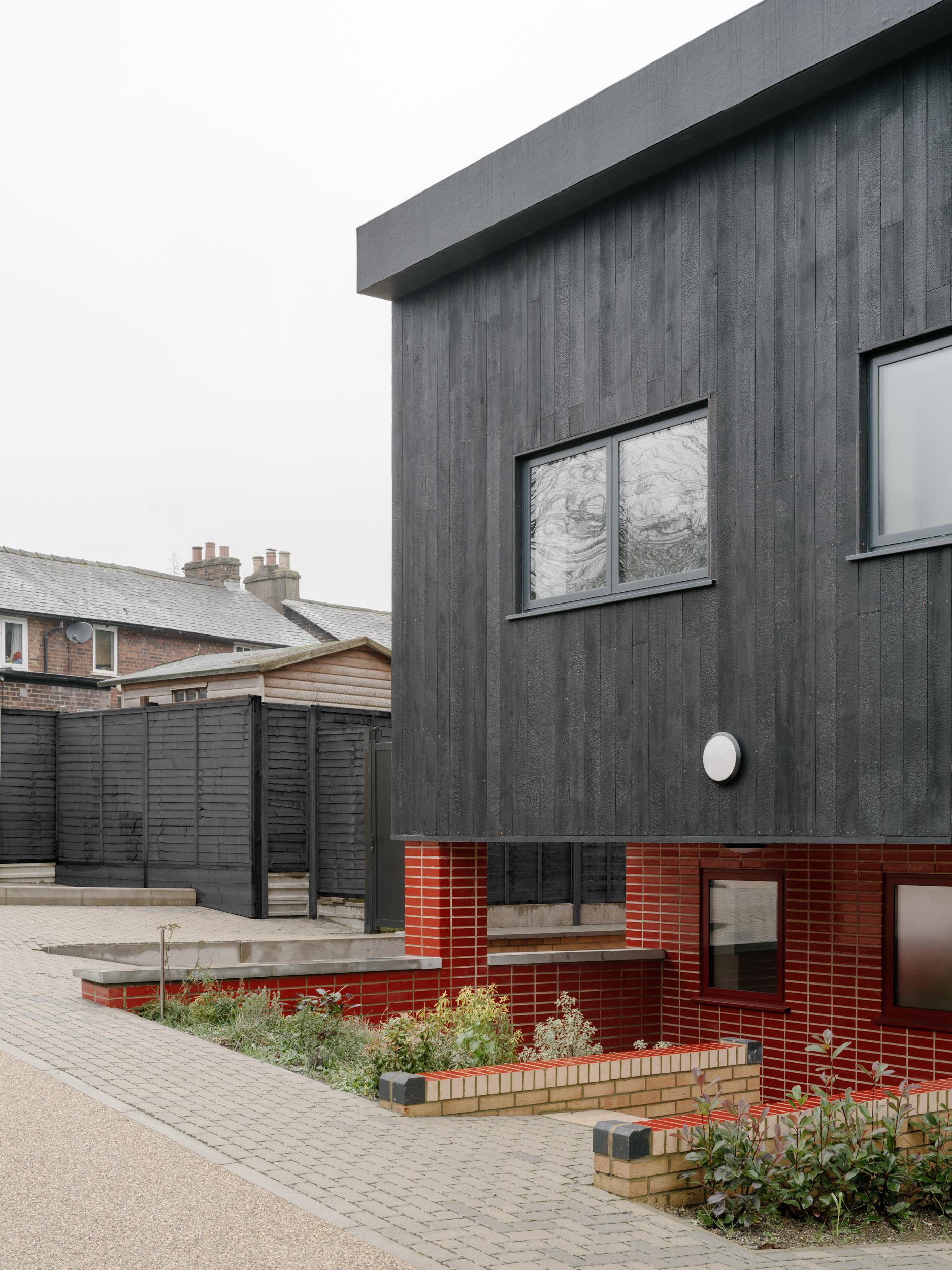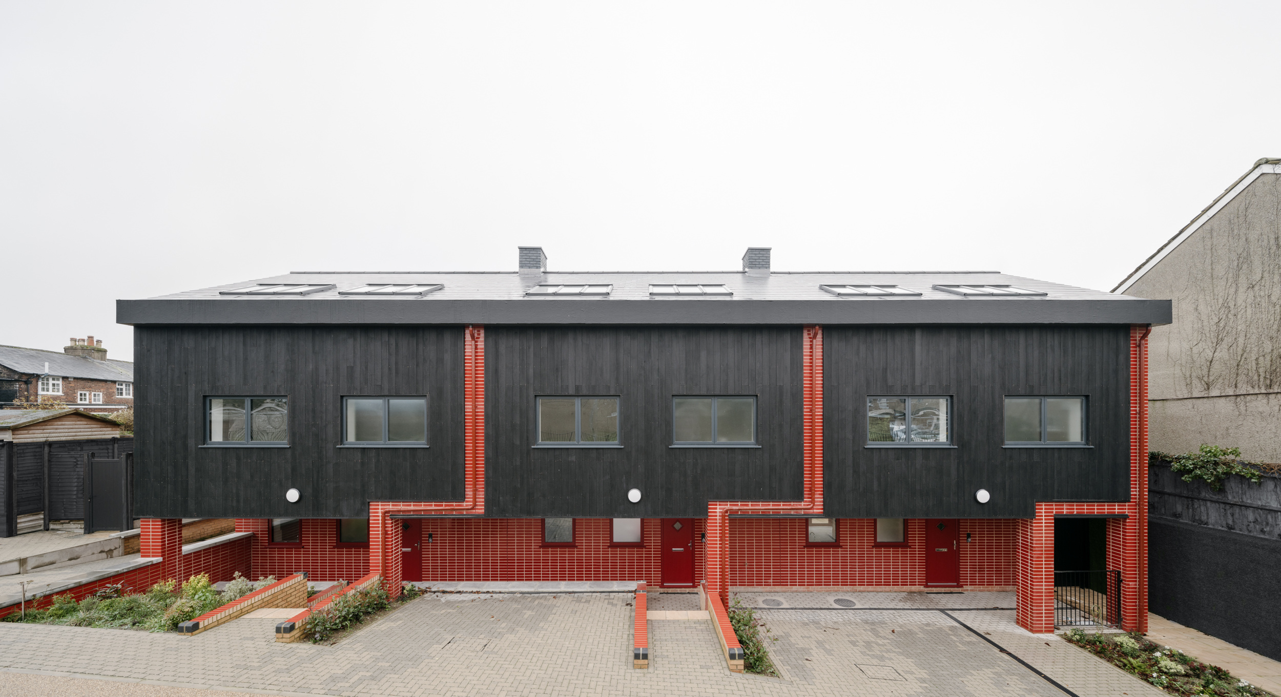 Red Cow Terrace is a development of three new homes near St Albans, which Office S&M secured planning permission for on a greenfield site in a conservation area. The homes are located in Wheathampstead, an ancient village with many notable historic buildings that have influenced the design. The previously undeveloped site, historically known as Red Cow Field, is in a conservation area and surrounded by existing cottages which constrain the height of development. However, by capitalising on the natural slope of the site, which lowers by around two meters, the design achieves three floors while matching the height of its two storey neighbours. The top floor is hidden within the barn like form of the buildings, while benefitting from full length skylights and generous views across the village.