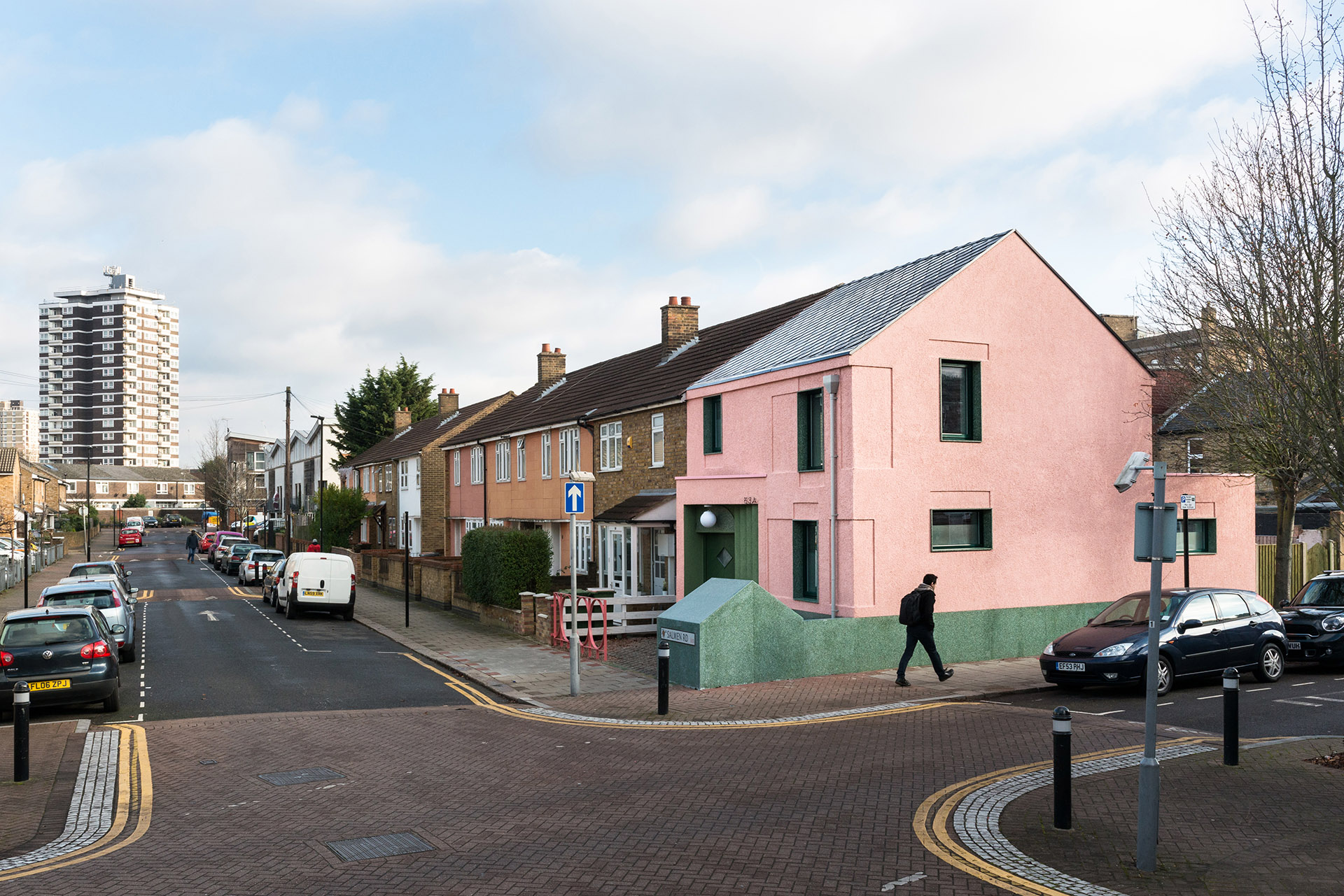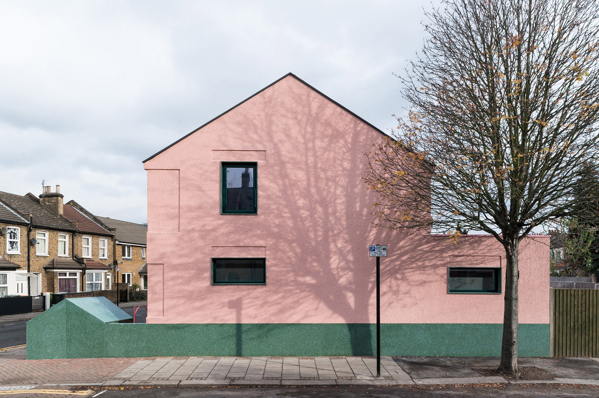 This new build-to-rent house, with textured render and terrazzo details, contains generous vertical spaces on a constrained corner site. Bookending a mid-century terrace in Plaistow this three bed, three bath house makes effective use of a tight corner plot. Salmen House was designed by the architects Office S&M to be built and let by professional landlord My Property & Home, who had purchased an end of terrace garden suitable for a two-storey infill house. Though rented, the house is designed as a unique home, so that tenants feel ownership of the property. The acute angle of the corner site is celebrated throughout the design, in both plan and section, to give spaces that accentuate their volume, while disguising their efficient footprint. Each space has natural light and views from two directions, and views from, into, and through these corners create multiple outlooks within each room. The horizontal circulation is one continuous view from the cranked front door through to the rear garden, while the staircase opens into a generous triple height space that pulls your gaze upwards. This generosity has not come at a price. The house was built for £205,000 and to a lasting specification. While clearly opposing the New London Vernacular, the solid wall construction with a single skin of blockwork meant that the superstructure was erected rapidly, and the entire project took just over six months to complete. By working closely with the structural engineer to take structure away, rather than adding it in, space was maximised to create four-meter-tall bedrooms, exposed beam ceilings, and a triple height staircase.
