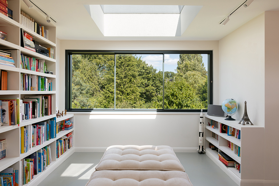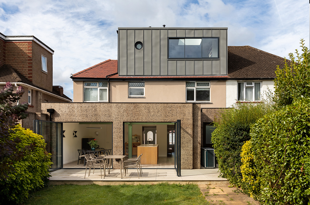 The project is a ground floor garden extension, loft conversion and complete internal refurbishment of a semi-detached house. Office Ten Architecture was approached by a young family that wanted to transform the house they had just bought, an aged semidetached in North London, into a low energy house with a contemporary layout. The new house sees a cork clad rear extension added to the rear garden, and a zinc dormer added to the roof. The new house provides ample space for both family time and working from home.