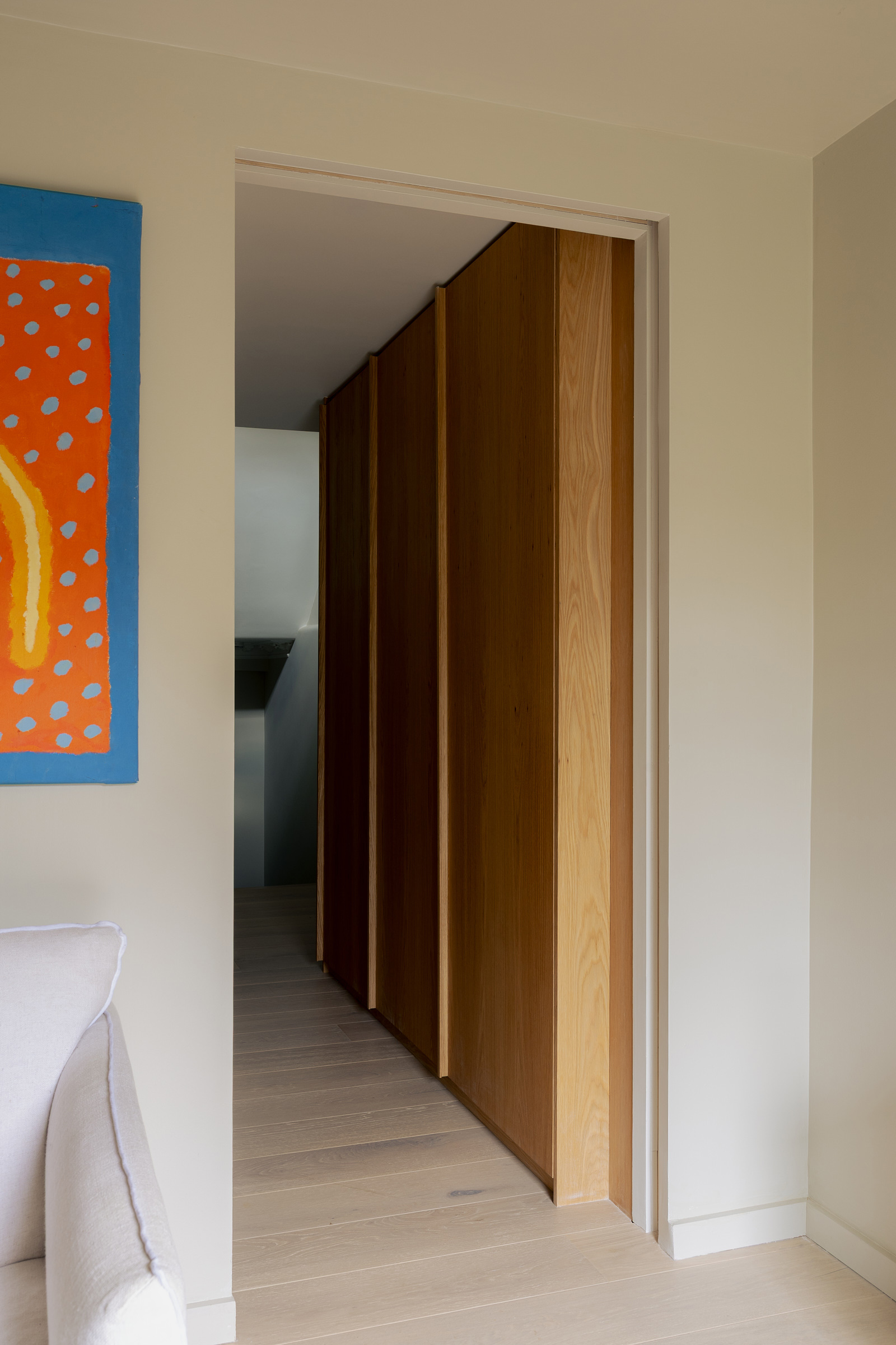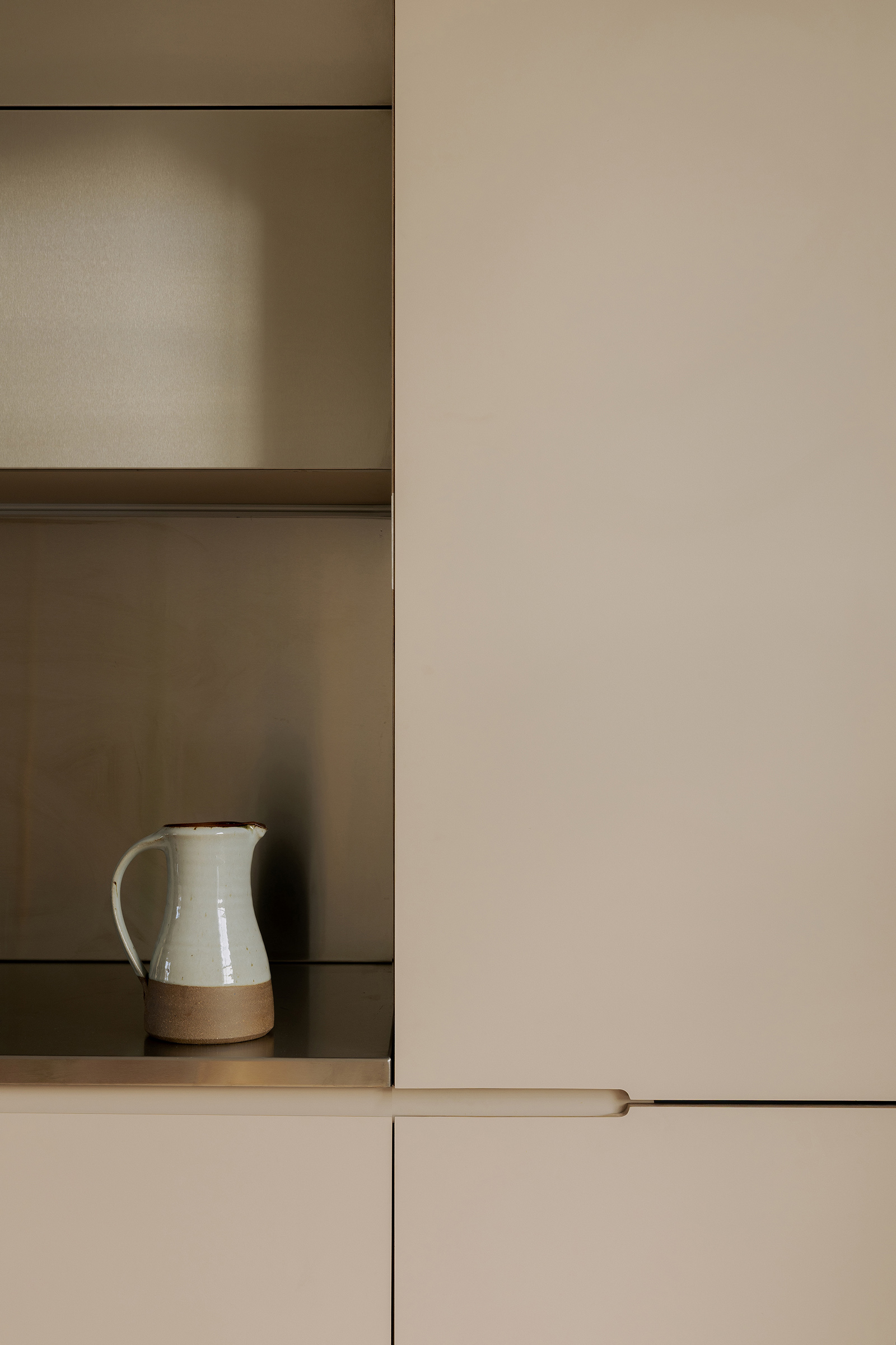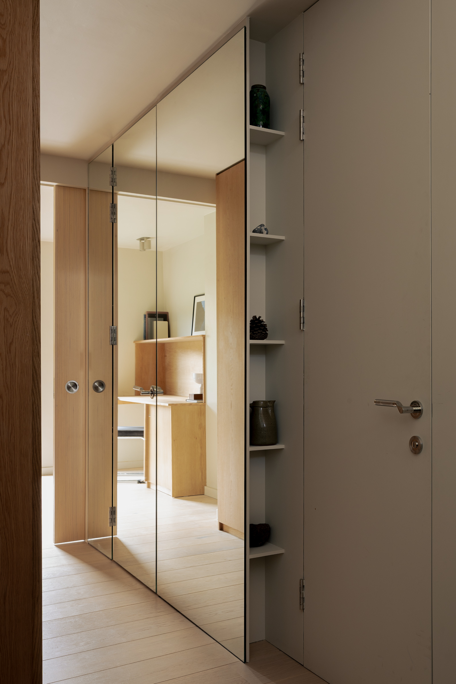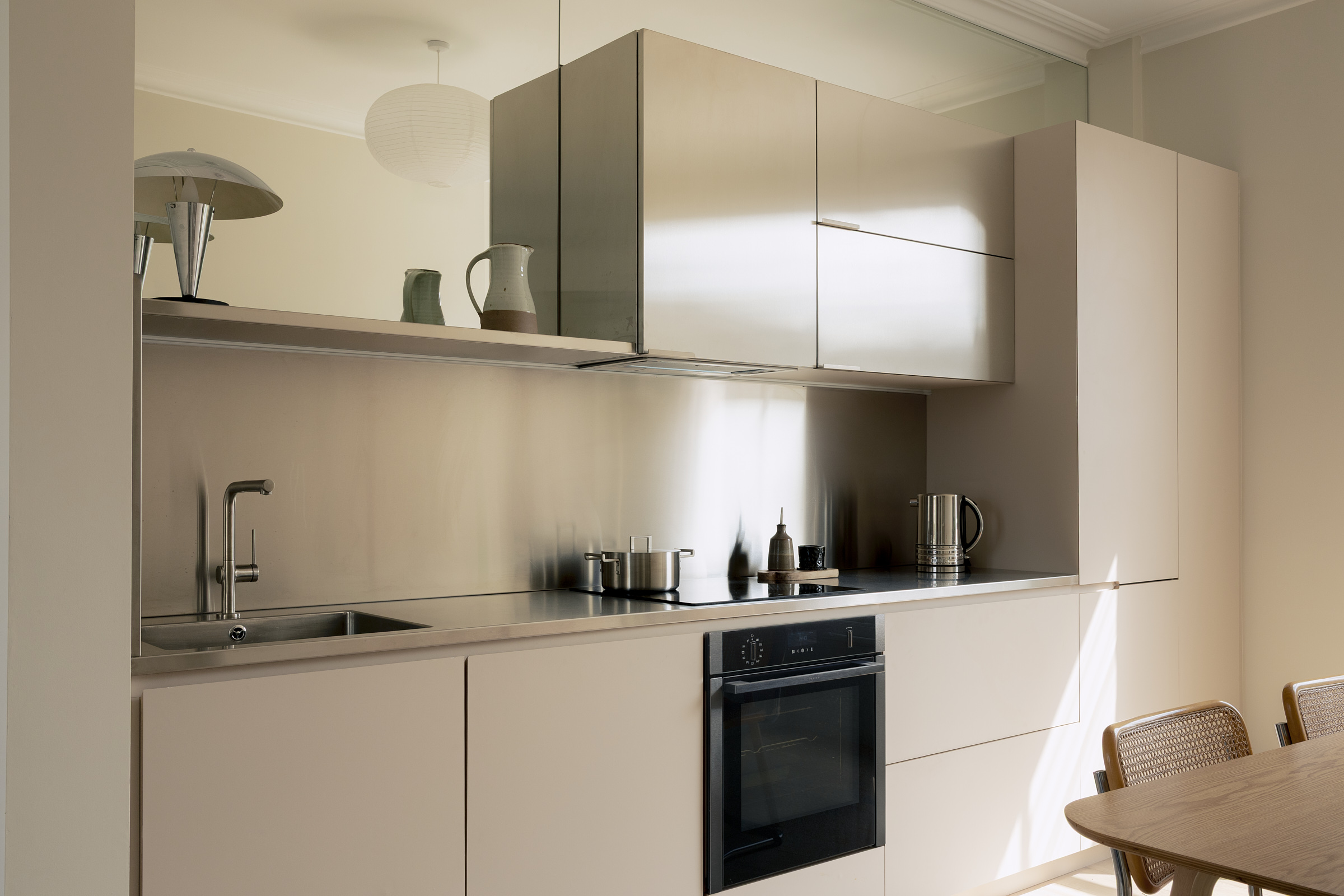 A full refurbishment with minor structural changes to a four storey maisonette in Tufnell Park. The way we live has evolved—and our homes must evolve with us. By blending functionality with elegant minimalism, this four-storey maisonette was reimagined and given a new life. Over the years, houses accumulate countless small alterations that obscure their true potential. Layers of changes build up, often resulting in compromised layouts and subpar living experiences. We uncovered this hidden potential by returning to first principles—drawing, rethinking, and reimagining. From these insights, we performed precise and purposeful “house surgery.” The rear outrigger posed the greatest challenge in the existing plan. On entering, there was no real sense of arrival, no space that welcomed you home. It also contained the kitchen, which was disconnected from the rest of the house and provided only limited dining space. This area was completely transformed. It now accommodates a collection of essential auxiliary spaces: a WC, utility room, wardrobes, and a study/guest bedroom. To enhance the sense of openness, one wall was clad floor-to-ceiling with mirror, reflecting the warmth of a bespoke oak wardrobe opposite. The kitchen was relocated to the first floor, where a new opening in the spine wall created a tall, light-filled space that brings kitchen, dining, and living together. Finishes were carefully considered, forming a pared-back palette that unifies the bespoke kitchen, fitted furniture, and shelving. South-facing, the kitchen glows with natural light, its brightness amplified by a mirrored wall that ties together the stainless-steel worktop and the soft canvas-grey tones of the surrounding elements. Another precise intervention was the reconfiguration of the second-floor hallway. Originally narrow and cramped, it now feels generous and inviting thanks to taller, wider openings. A new linen cupboard and shelving bring both practicality and visual interest to the space. The main bedroom continues the theme of functional elegance with bespoke oak and rattan wardrobes and shelving, balancing natural warmth with refined simplicity. Throughout, the property has been upgraded and renewed, with improvements to electrical systems, plumbing, heating, and plasterwork—ensuring the home not only looks transformed but also functions as it should for a more effortless contemporary living.