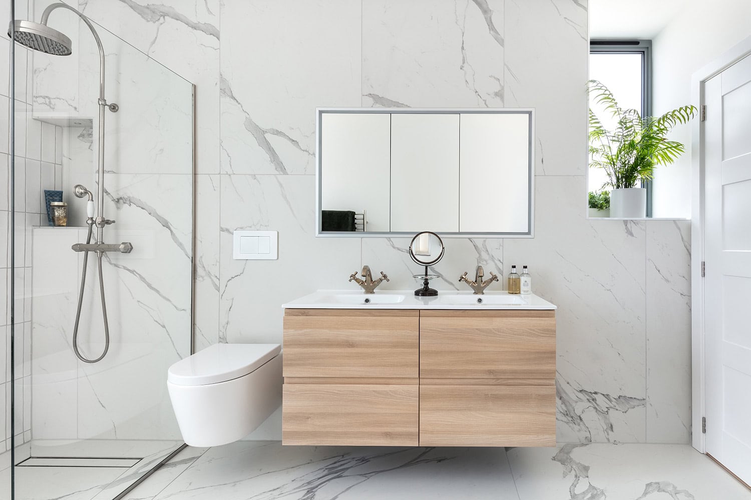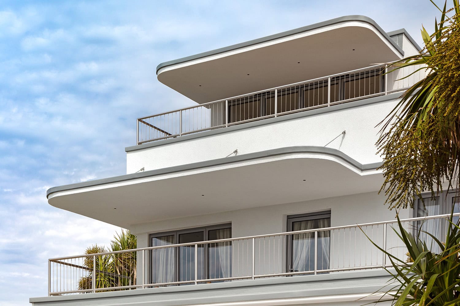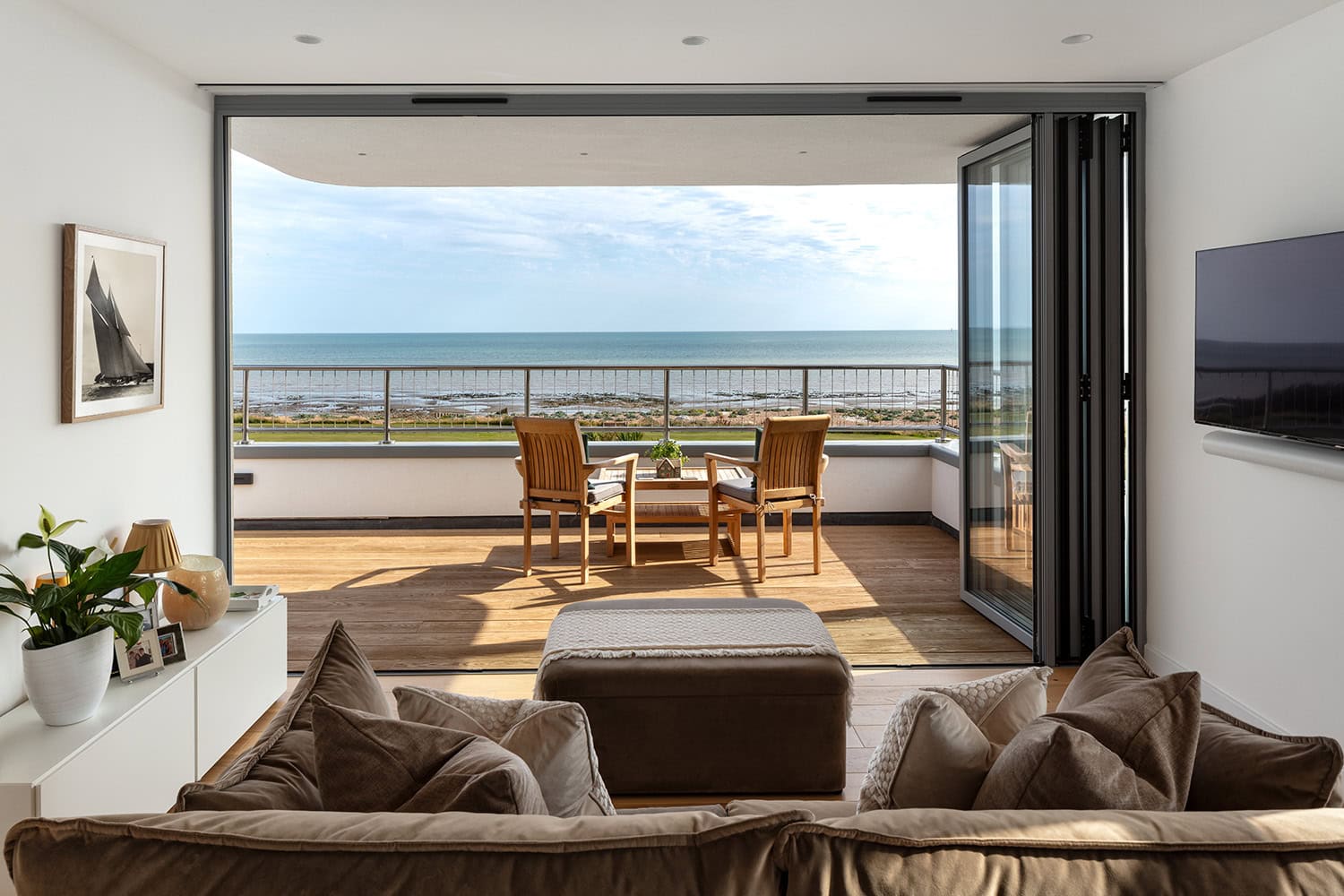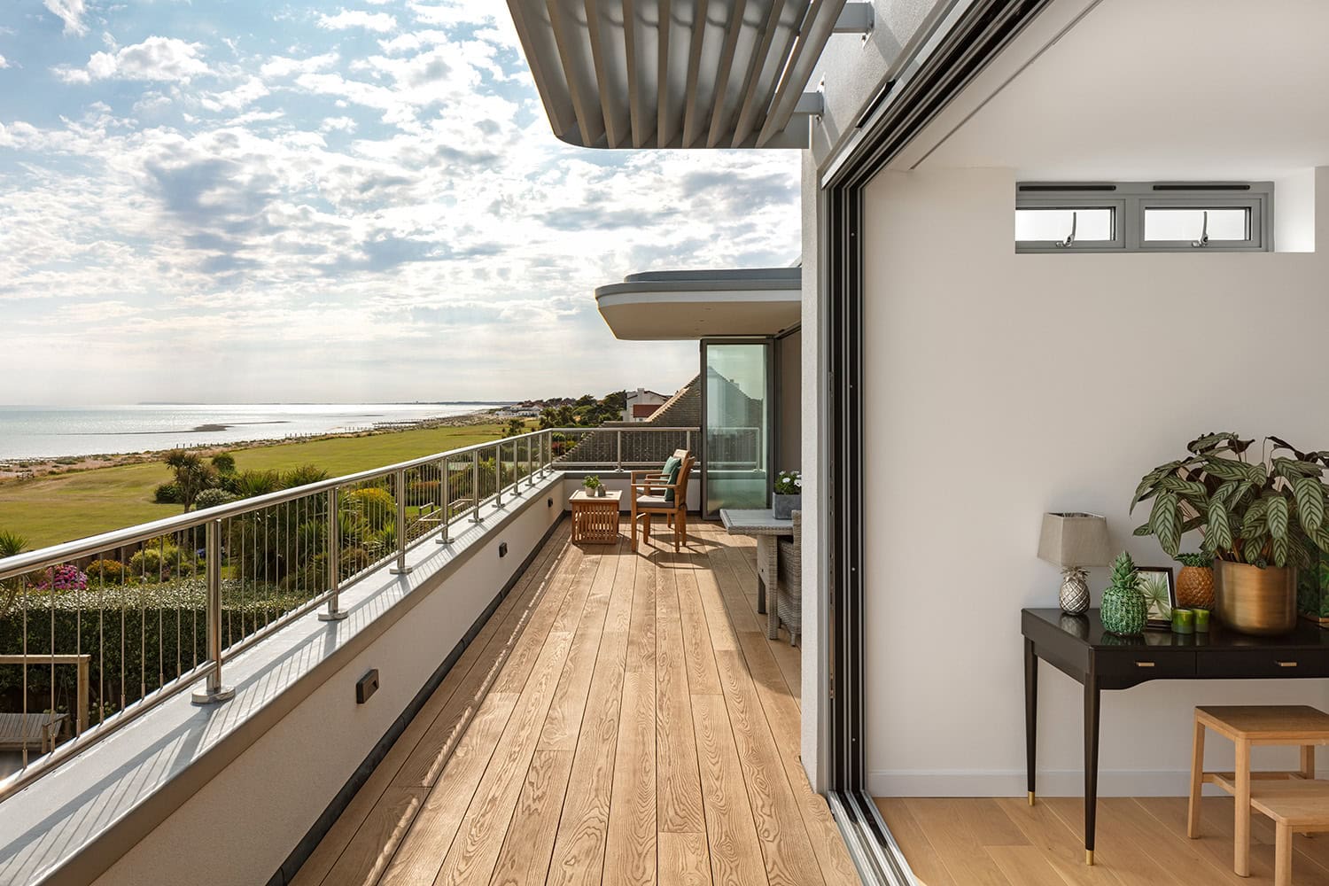 Our clients wanted to extend and improve their beach-side home. The property is on a stunning plot, with direct access to the beach and a fantastic view over the English Channel. The brief was to add another storey to create a master suite and to upgrade the rest of the house and garden. Our architecture and interior design teams worked together closely on this project from start to finish, including successfully achieving planning consent from Arun District Council. The master suite features a bedroom, en-suite, dressing area a further living area and lots of glazing for the sea views. Both brie-soleil and canopies have been fitted to control the solar gain and prevent overheating in the summer months. The interior design brief focussed on space planning and giving the house a wow factor, getting the room layouts right, maximising the use of space and orienting all furniture to take advantage of the views. The style is contemporary with modern finishes, lots of natural light and pops of colour, such as a tropical palm tree patterned wallpaper that suits our clients’ tastes and leans into the art deco style. A small kitchenette has been added and built by Indy Interiors, who also delivered the custom-designed bedroom joinery. The master suite has lots of circulation space and floor-to-ceiling windows to maximise the impact of the natural light. The final piece of the puzzle was to consider the external elements and landscaping. The house had a kidney-shaped pool, but this needed to be replaced with a rectangular pool, terrace and barbecue area, including a new utility and outside pool store with a shower block. The remainder of the garden needed upgrading and it has been landscaped to complement and complete the makeover of this property. Working with Mesh Energy consultants, we developed a long term strategy for renewable energy use on the site. We are pleased we could also help our clients to include a full photovoltaic solar installation in their project, which they use to power batteries for home running and charging their EVs.