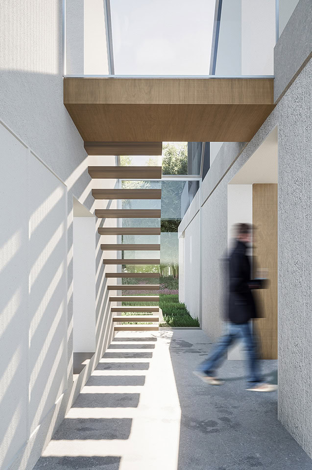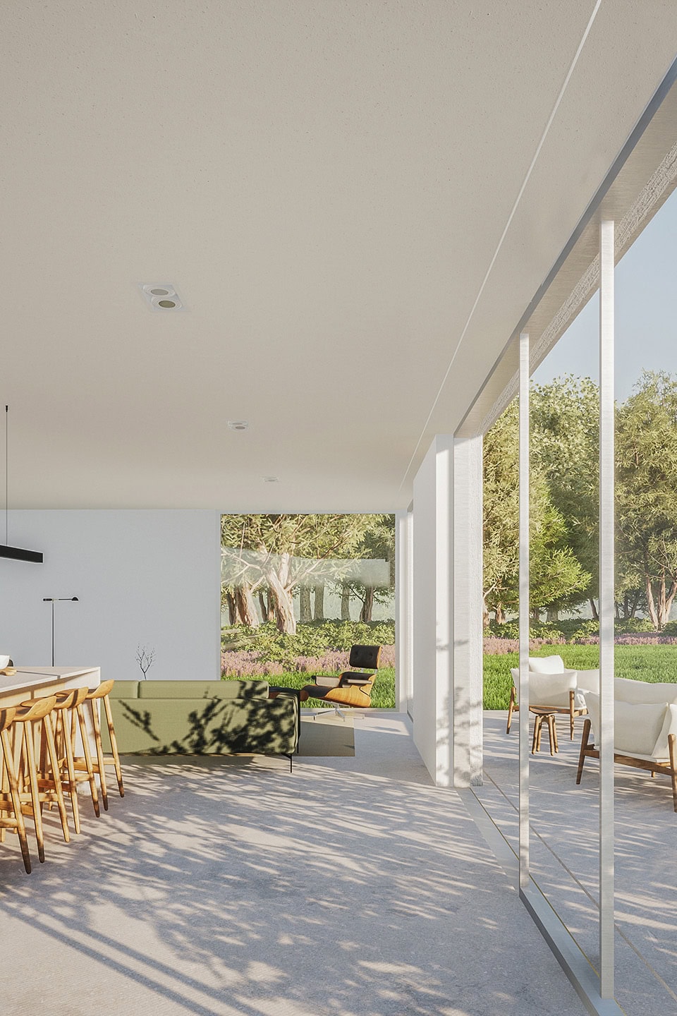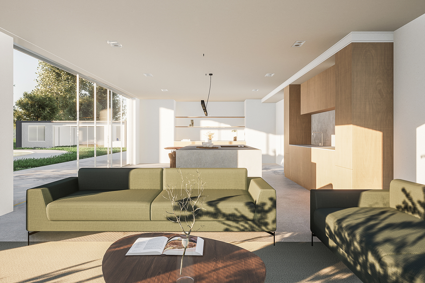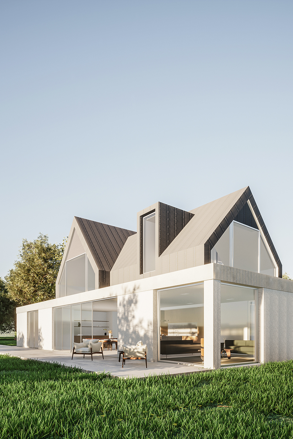 We achieved planning consent with Chelmsford City Council to remodel and enlarge the house, to meet the needs of our clients. The existing house is a 20th century property, built with a thatched roof and an annex. The existing property did not currently meet the client’s needs. The layout of the property was very cellular, with main living spaces disconnected from each other. In particular, the old kitchen contained the main entrance to the building, which was detached from the main living areas. We concluded that demolishing the annex and constructing a new extension would offer an opportunity for a more efficient building footprint with modern construction that would be better located to respond to the existing site context. The proposals include a new single-storey block perpendicular to the main house that creates a privacy barrier between the road and pool/garden beyond, as well as creating a larger driveway space for vehicles. The main two-storey element extends from the rear gable of the main house, with a new pitched roof to mirror the existing (yet with a lower ridge to remain subservient). As the 2-storey element is concentrated to the rear of the existing house, the mass is not seen from the road, and by removing the existing 2-storey annex, the elevation fronting the main road becomes lower and less imposing to the road, whilst retaining privacy for the swimming-pool and rear garden beyond. The proposal creates two distinct areas between the existing and the proposed, linked by a double-height glazed atrium that contains the central staircase. The existing area retains traditional residential spaces in the form of bedrooms and habitable rooms. The proposed area introduces open plan contemporary spaces such as a large living / kitchen /dining area and gym, while the first floor plan contains an additional bedroom and a master suite. The existing building is painted white render with a thatched pitched roof. The proposals retain the existing rendered walls of the main house, but the roof will be replaced with a new metal one to match the extension.The proposals wish to compliment the existing material palette, as well as introducing elements of contrast to help distinguish new from old. The proposals have drawn on inspiration from other rural and agricultural precedents that are believed to be appropriate to the local area and sensitive to the existing dwelling house.