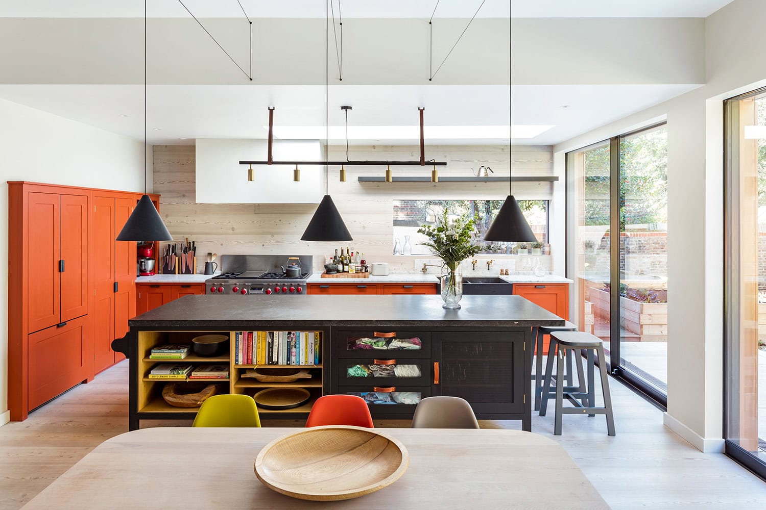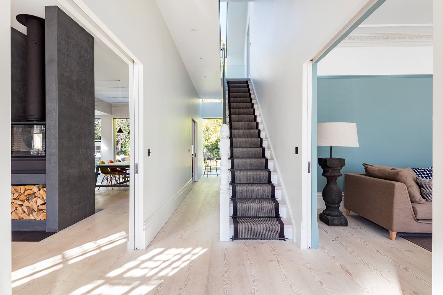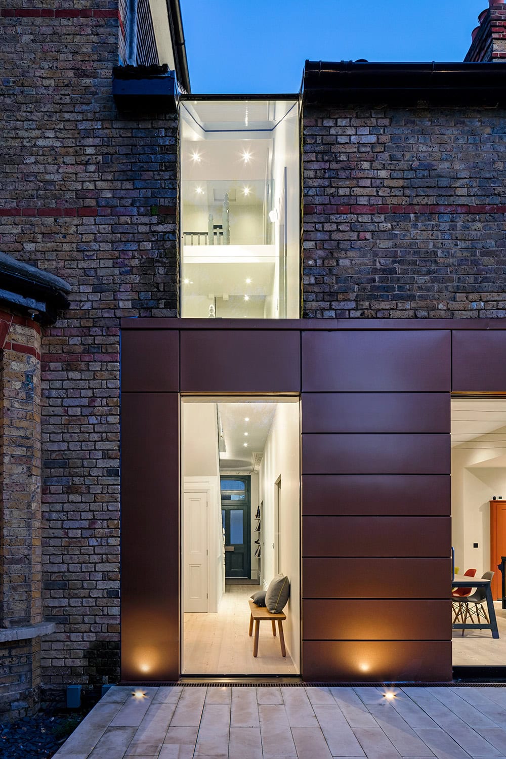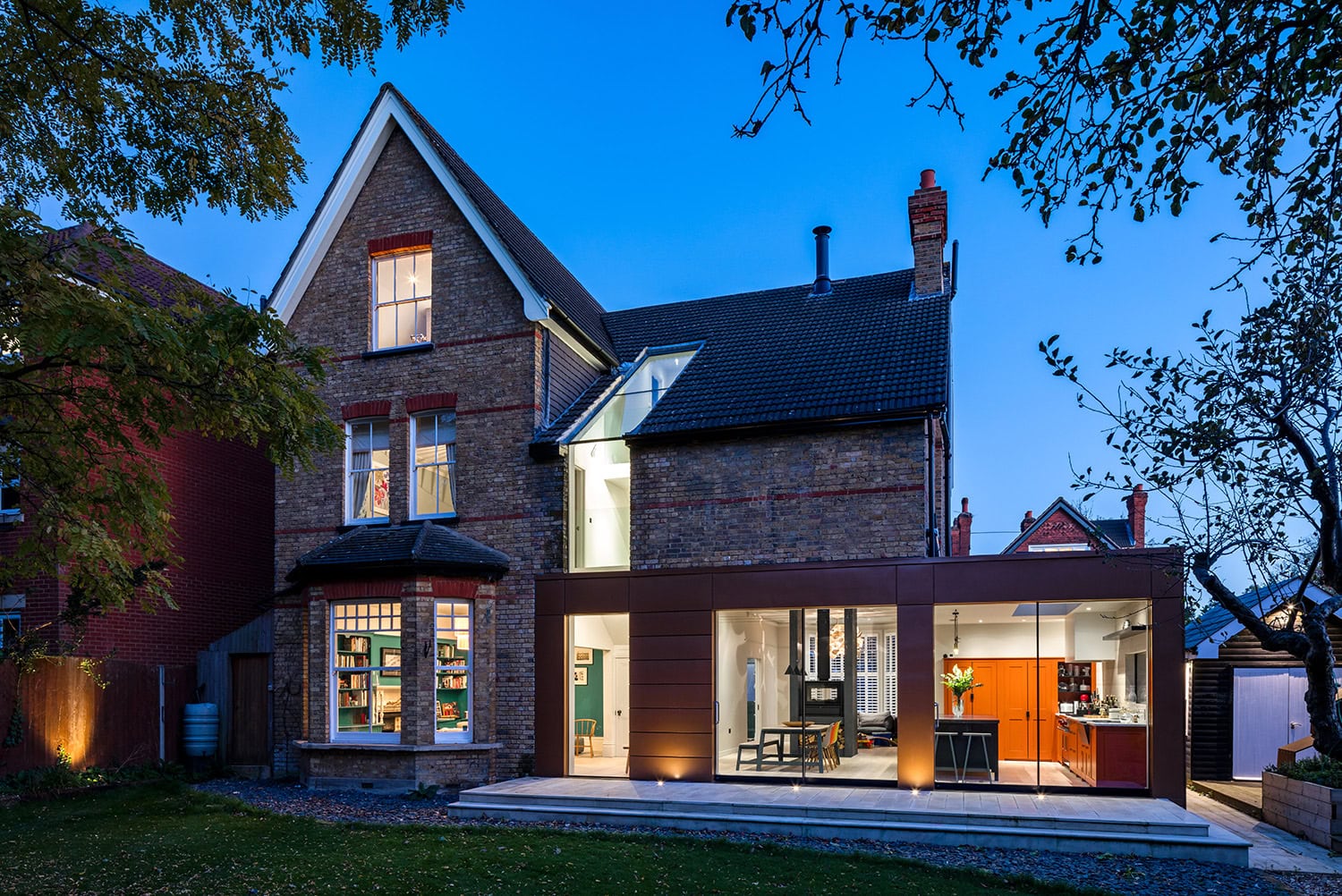 Maximising natural light, space and establishing a visual and physical connection were also key drivers for the design. Owing to the size of the property, it became apparent that reconfiguration rather than extension provided the solution to meet the brief. A metal clad ‘intervention’ was introduced to the rear facade. This created a strong horizontal element creating a visual balance with the vertical nature of the three storey gable. The metal cladding specified echoed the colour of the red brick string courses tying old with new. Slender frame sliding doors provide access and views of the large garden. The central circulation space was transformed by the introduction of a double height glazed slot wrapping up the rear facade and onto the roof. This allows daylight to permeate into the heart of the otherwise dark deep floor plan. The staircase was reconfigured into a series of landings looking down over the main void space below and out towards the tree canopies at the rear of the garden. The introduction of double pocket doors throughout the ground floor creates a series of interconnected spaces and the whitewashed Larch flooring flows seamlessly from room to room. A bold palette of colours and materials lends character and texture throughout the property. Full planning consent was obtained from LB Croydon, and a full RIBA service through to completion.