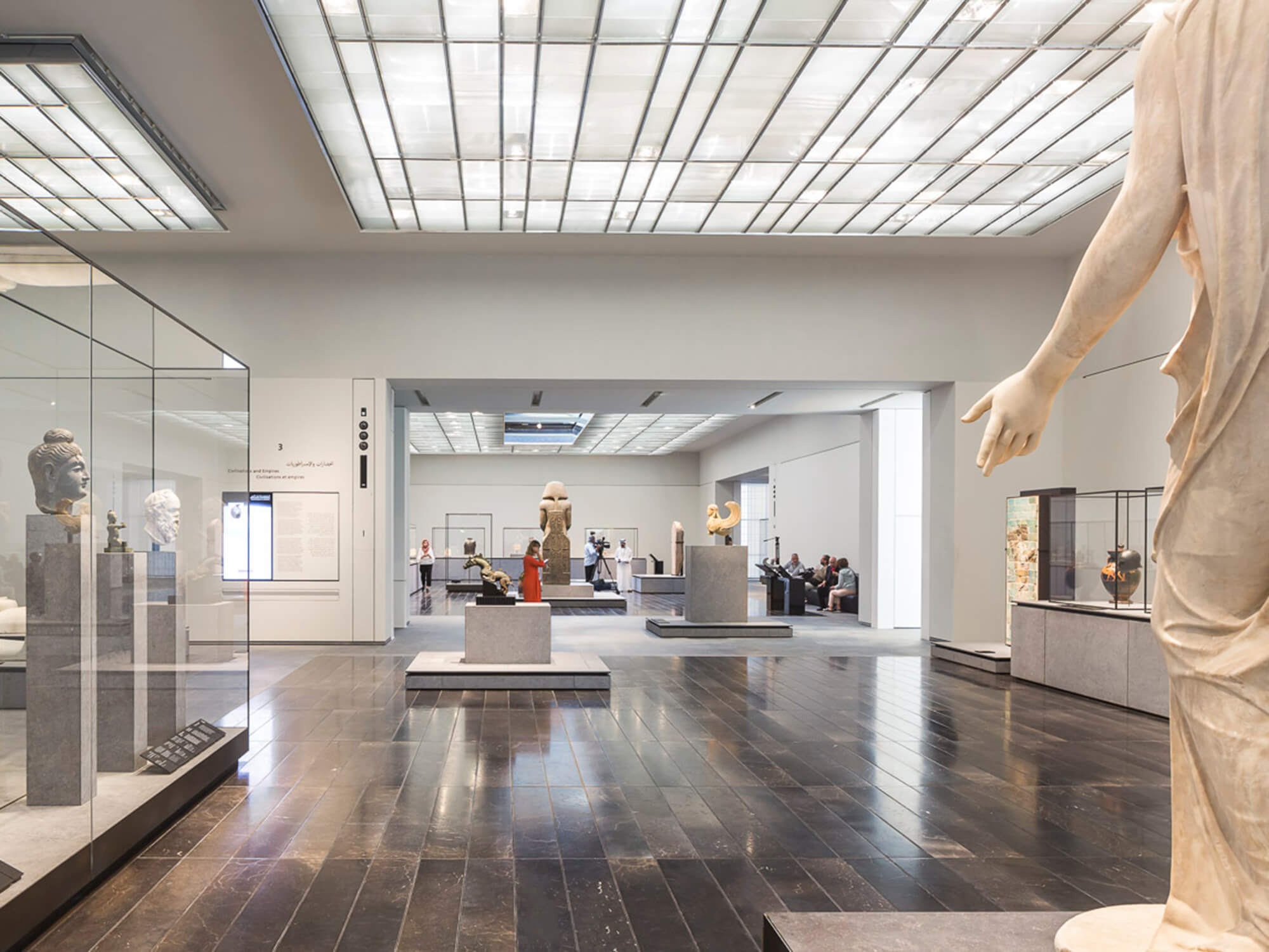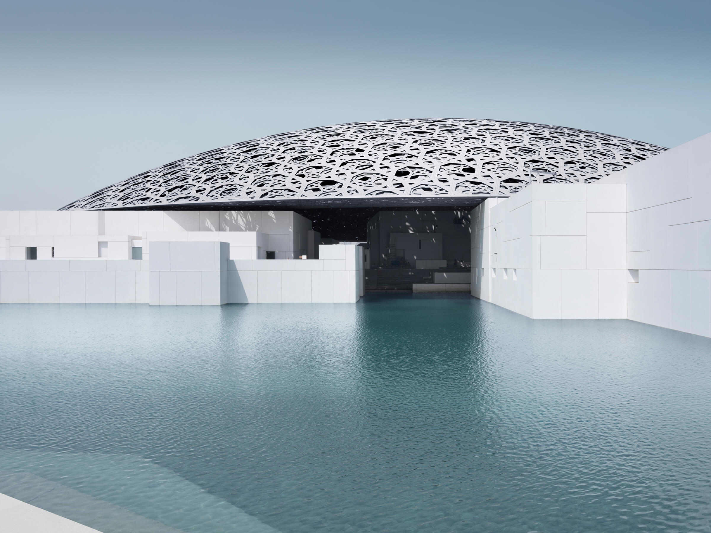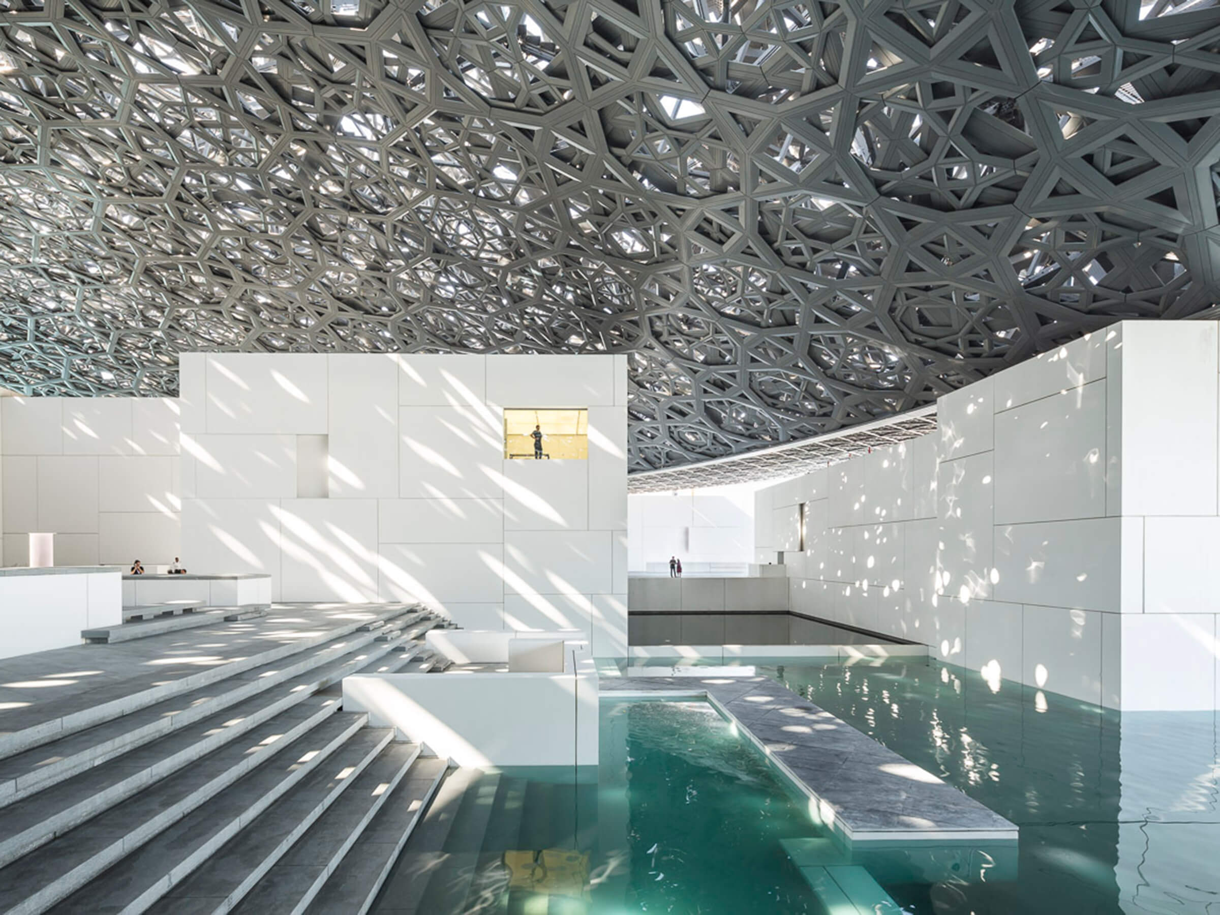 Inspired by the architecture and traditions of the United Arab Emirates, Louvre Abu Dhabi is an emblem of the nation’s vision and achievements. Louvre Abu Dhabi is one of a series of galleries and museums on Saadiyat Island. It houses great artworks from around the world, with a universal focus on shared human stories across civilisations and cultures. As Executive Architects working in partnership with Jean Nouvel, the paper concepts have been brought to life with spectacular effect. The 3 Pearl rated design consists of a series of connected gallery spaces totaling 8,000m², surrounded by seawater and largely covered by a vast 180m diameter domed roof, supported on just four piers. The dome which is inspired by the cupola, a distinctive feature in Arabic architecture, has seemingly random geometric openings that cast a ‘rain of light’ into the circulation spaces below, suggestive of dappled light filtering through a traditional interlaced palm leaf roof.