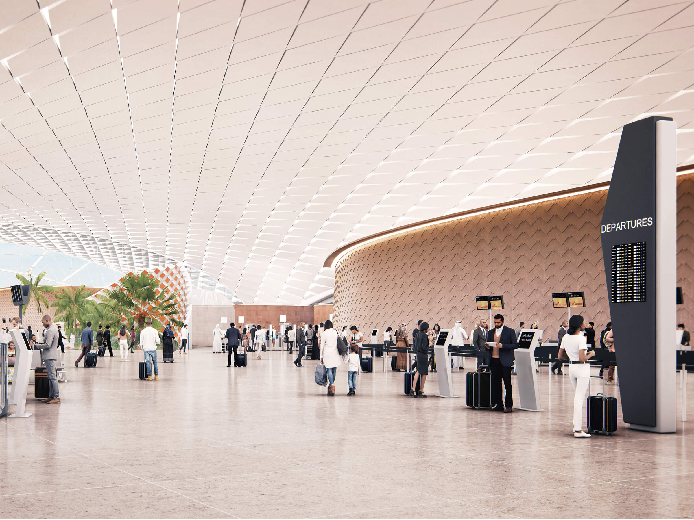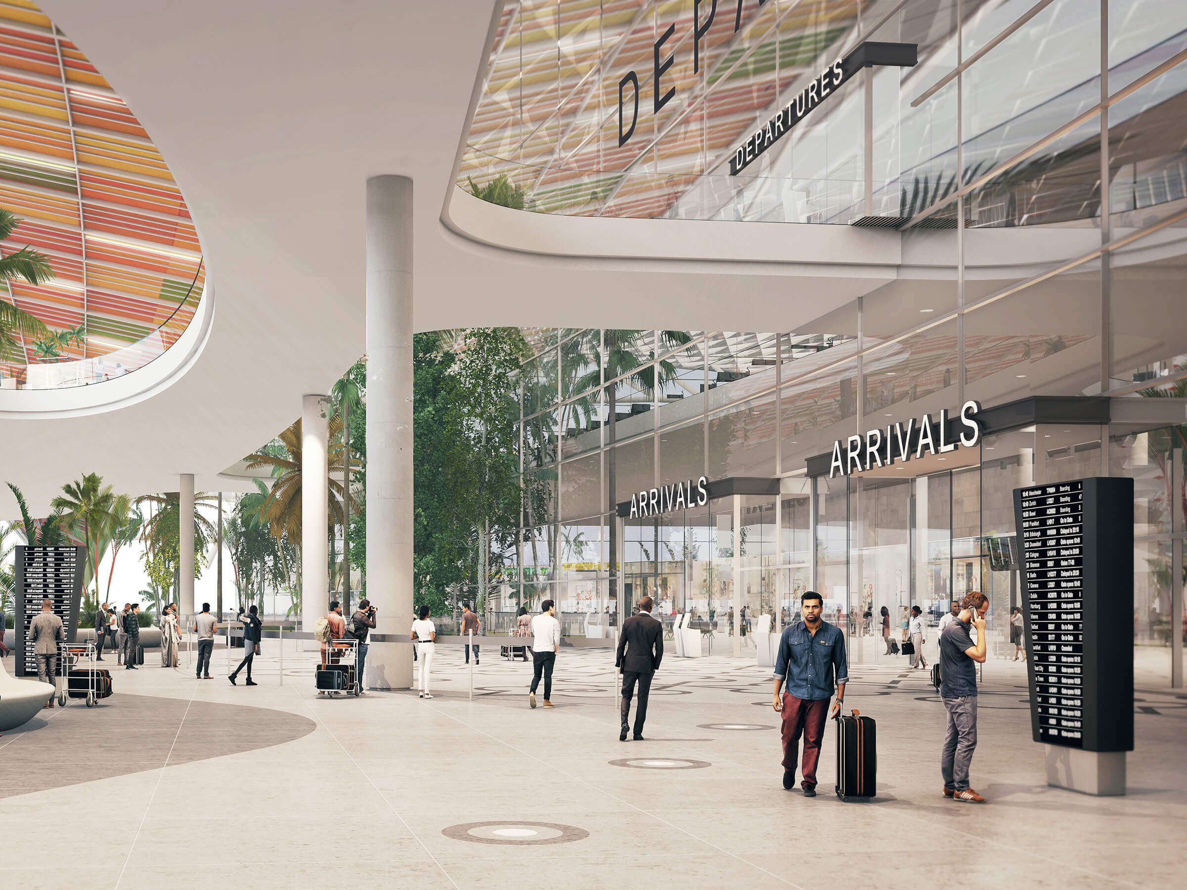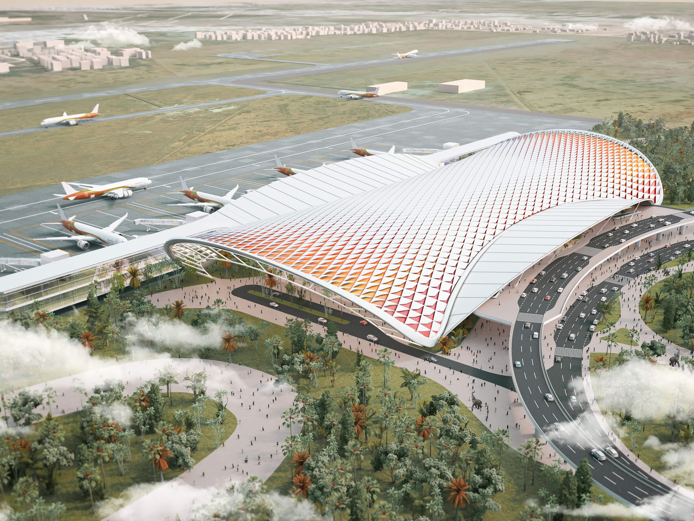 The design for Tiruchirappalli (Trichy) International Airport fuses references from the city’s local heritage and culture with a contemporary palette of materials to create a unique sense of place and identity. The expressive roof form and multi-layered facade take inspiration from the geometry, textures and colours of Trichy’s traditional temple architecture. Generous natural light and lush landscaped gardens bring a calming backdrop to the expansive forecourt and arrivals concourse, which lead to the streamlined passenger processing facilities and departures lounge. Climatic constraints, local customs and specific Indian security processes have been considered and are reflected in the aesthetic, planning and structural solutions. The GRIHA Four Star rated design utilises renewable energy measures such as rainwater harvesting, ground source heat pumps and photovoltaic panels.