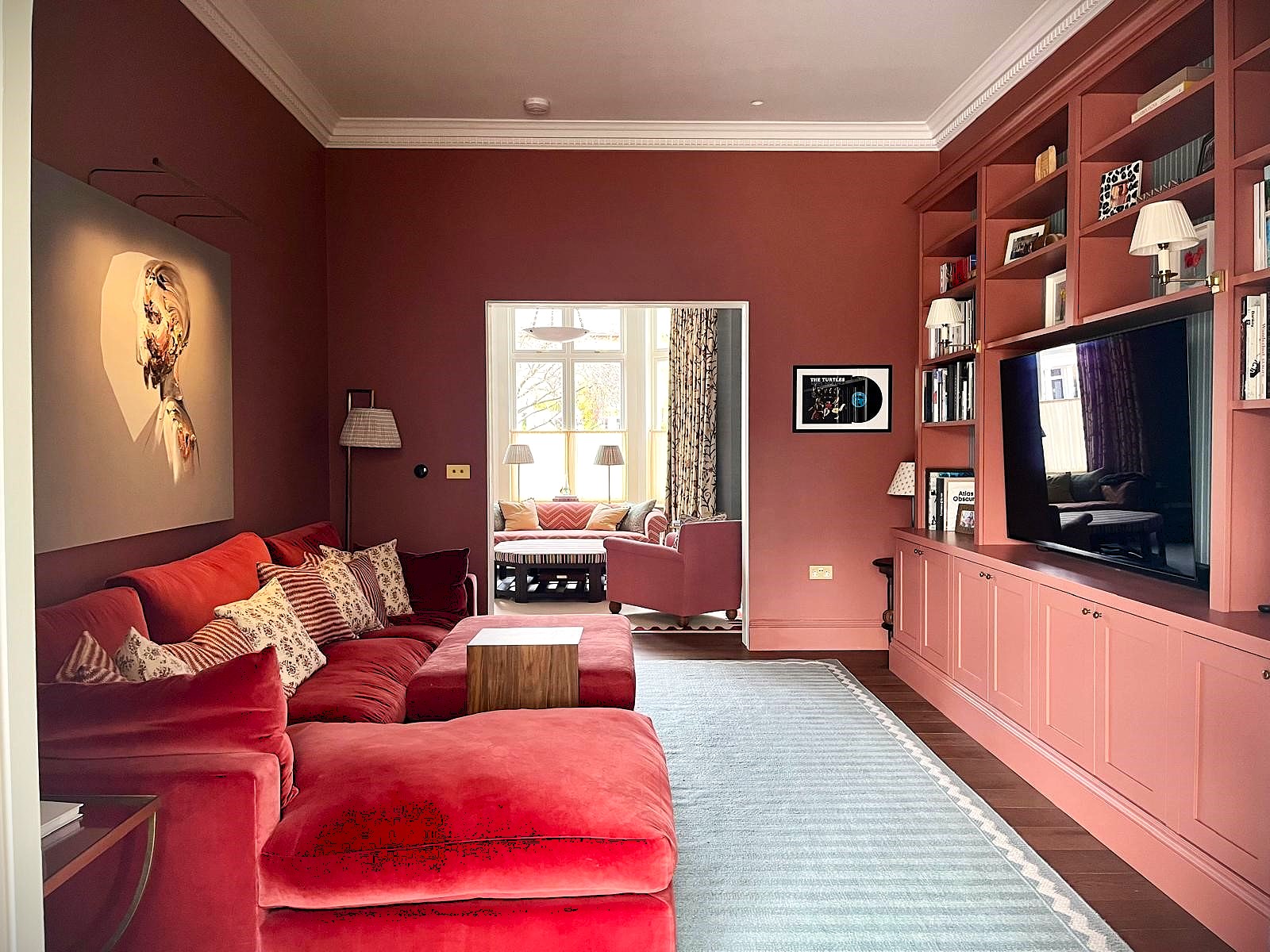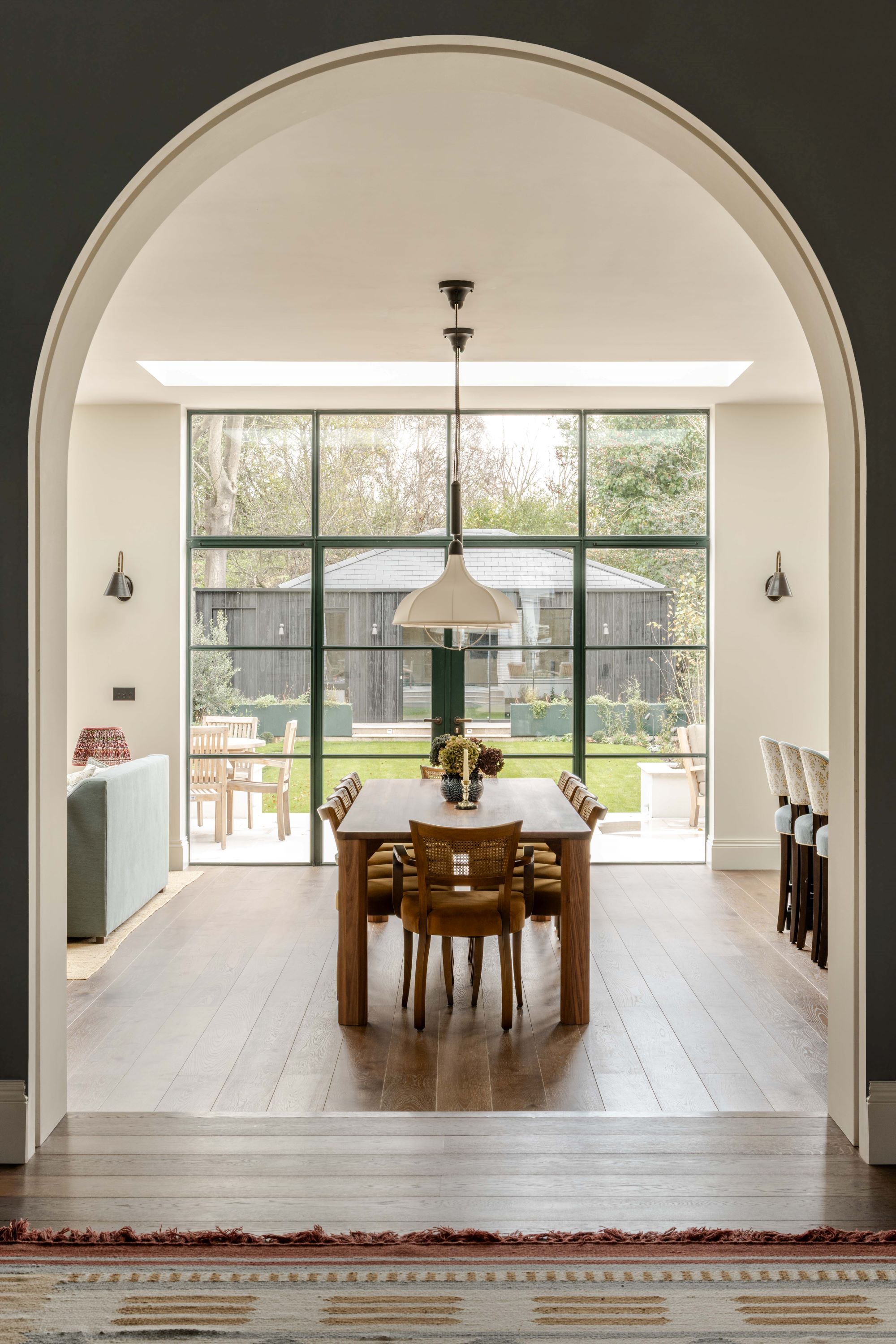 Full house renovation back to brick, including rear extensions, new dormers, roof terrace and garden annexe for a golf studio. We chose a white brick to anchor the Ground floor rear extension and harmonise with the existing white rendered house above, accentuating the rhythm of the bay by pulling out brick detailed ‘columns’ with green Crittall glazing in between. Internally, arches were created with hidden fire curtains and pocket doors, in order to maximise the light and space but also allow the family to close off spaces as needed. We then rebuilt the first floor rear wing, in order to provide a fully glazed bay window to the master bedroom, and finally we designed a rear garden outbuilding clad in charred black timber fins to contrast against the white brick of the house.