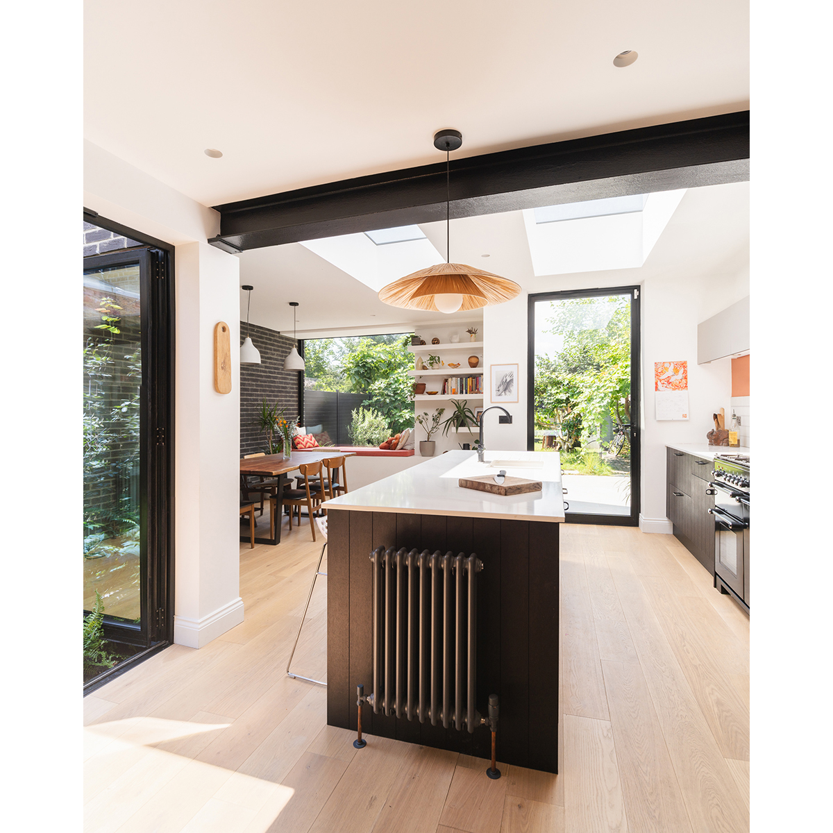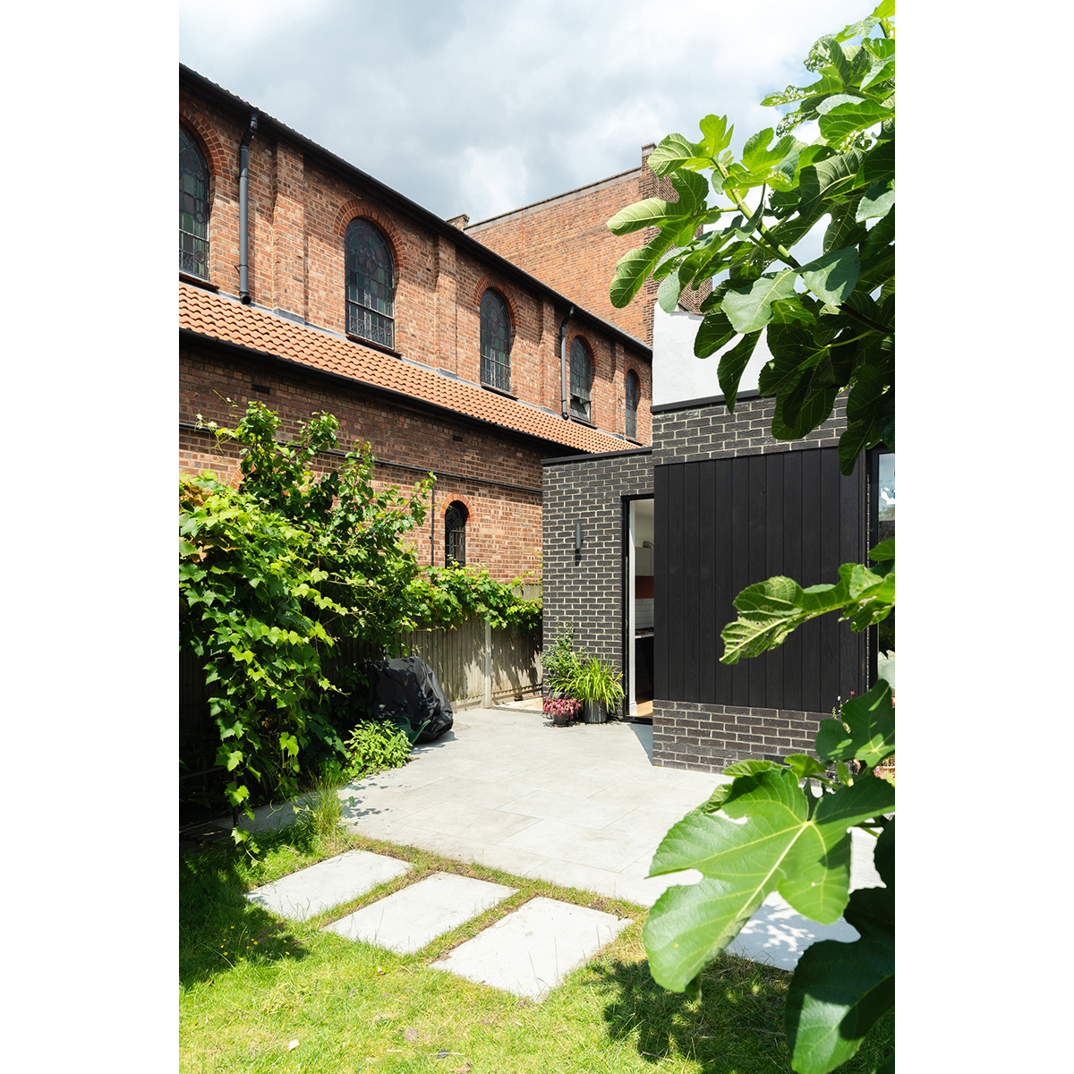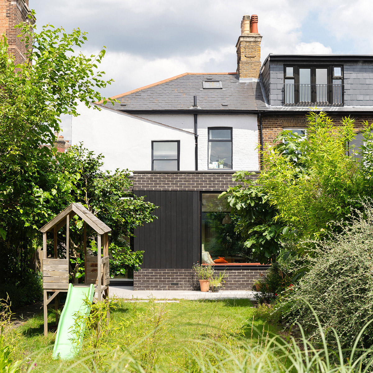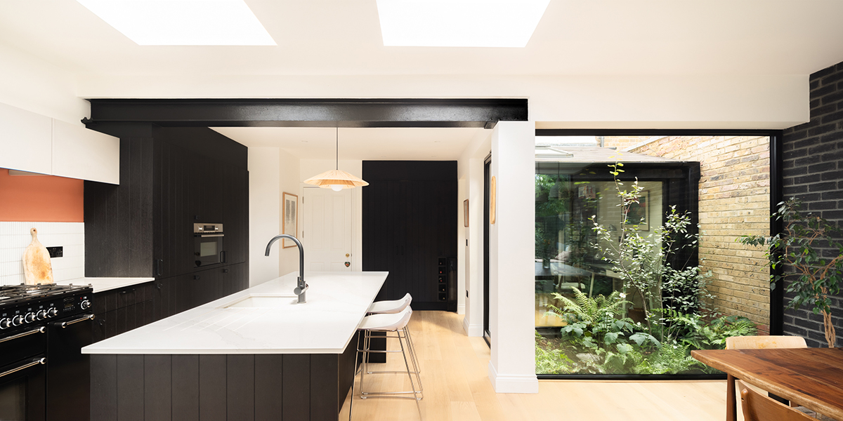 Innovative budget-conscious extension with internal garden. Nestled between a row of houses and a church, this home is occupied by a family that cherish their garden. Keeping this in mind, the extension has been designed to provide views of greenery from every corner. Unusually, rather than maximising the internal floor space, some of the area was used to create a courtyard garden, which brings nature directly to the heart of the family space. The lush main garden at the rear is framed by a picture window, complete with a seat for relaxation. The kitchen serves as the connecting point, with the dining area situated between the garden window and the inner courtyard. On the opposite side of the small courtyard are the workspace and reception room. This layout harmoniously combines openness with moments of privacy. Externally, black brick and charred timber complement the colour palette of the green plants in the garden, the red brick of the adjacent church and the crisp white render of the main house. This choice of materials distinguishes the new elements from the old while maintaining a sense of harmony. These materials also continue into the interior, emphasising the theme of connecting the outdoors with the inside.