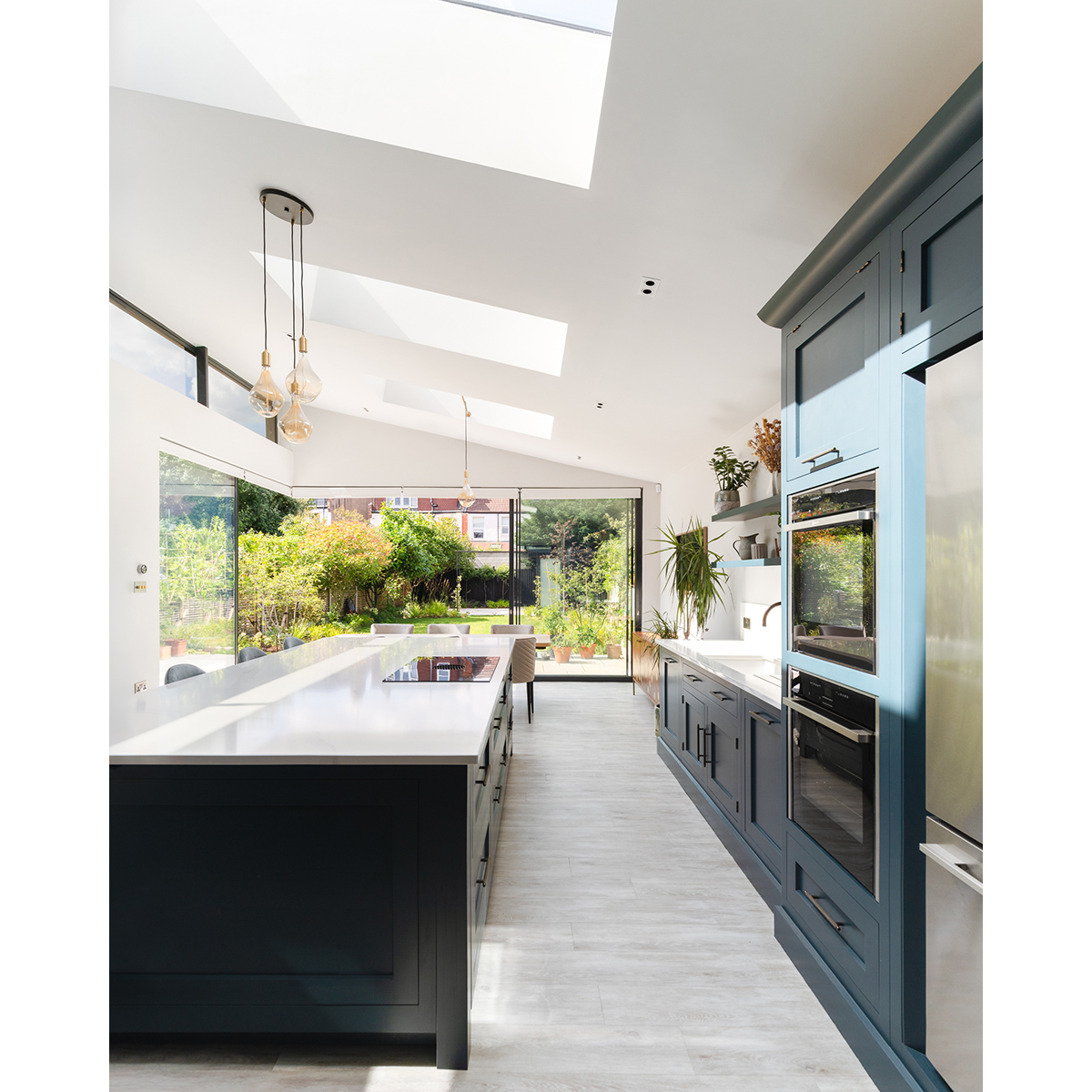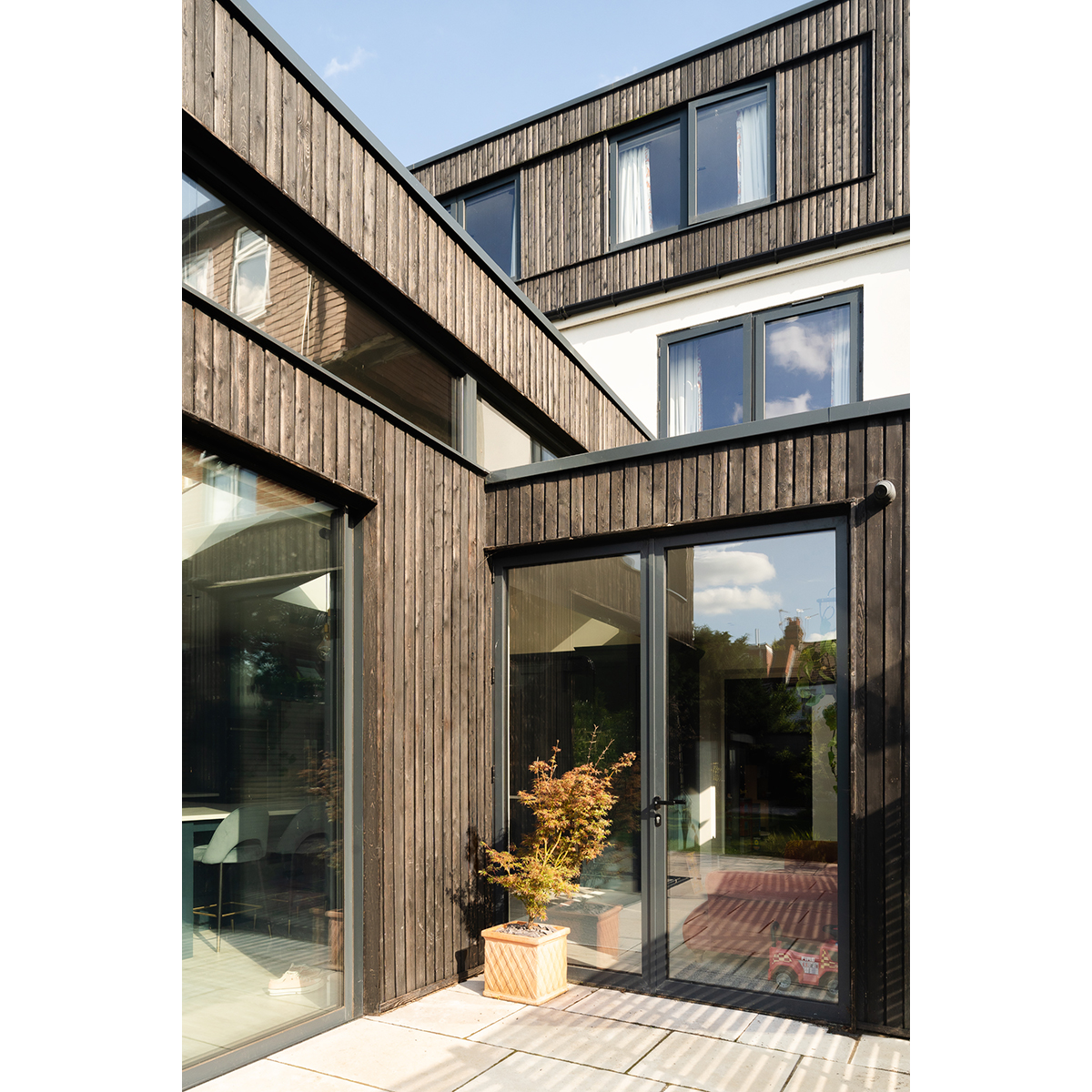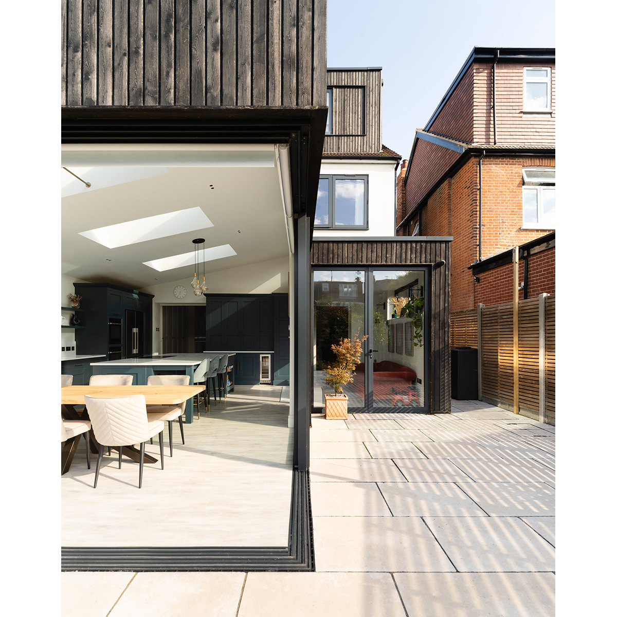 This Shou Sugi Ban clad house is a result of a significant enlargement and a complete renovation to create a forever family home. The rear extension effectively doubles the footprint of the house, offering a new kitchen, dining area, multiple living spaces, a toilet and a utility room, while still allowing for a generous garden to be retained. The footprint of the extension is staggered to reduce its bulk and to ensure there is no negative impact on the neighbouring properties. Additionally, large opening-corner sliding doors were incorporated. Thanks to clever engineering, there are no obstructions from structural supports, creating an unobstructed passage and allowing for an unobstructed view of the garden. Inside the extension, a vaulted ceiling with skylights and clerestory windows brings natural light into the deep space. The upper floors were fully refurbished, and the loft has been extended through a hip-to-gable alteration and the addition of a rear dormer. The ground floor and loft extensions are finished in charred timber cladding, providing a striking contrast to the white render of the existing building. The finish I slow maintenance and feels tactile and warm, with vertical slim planks adding texture to the façade.
