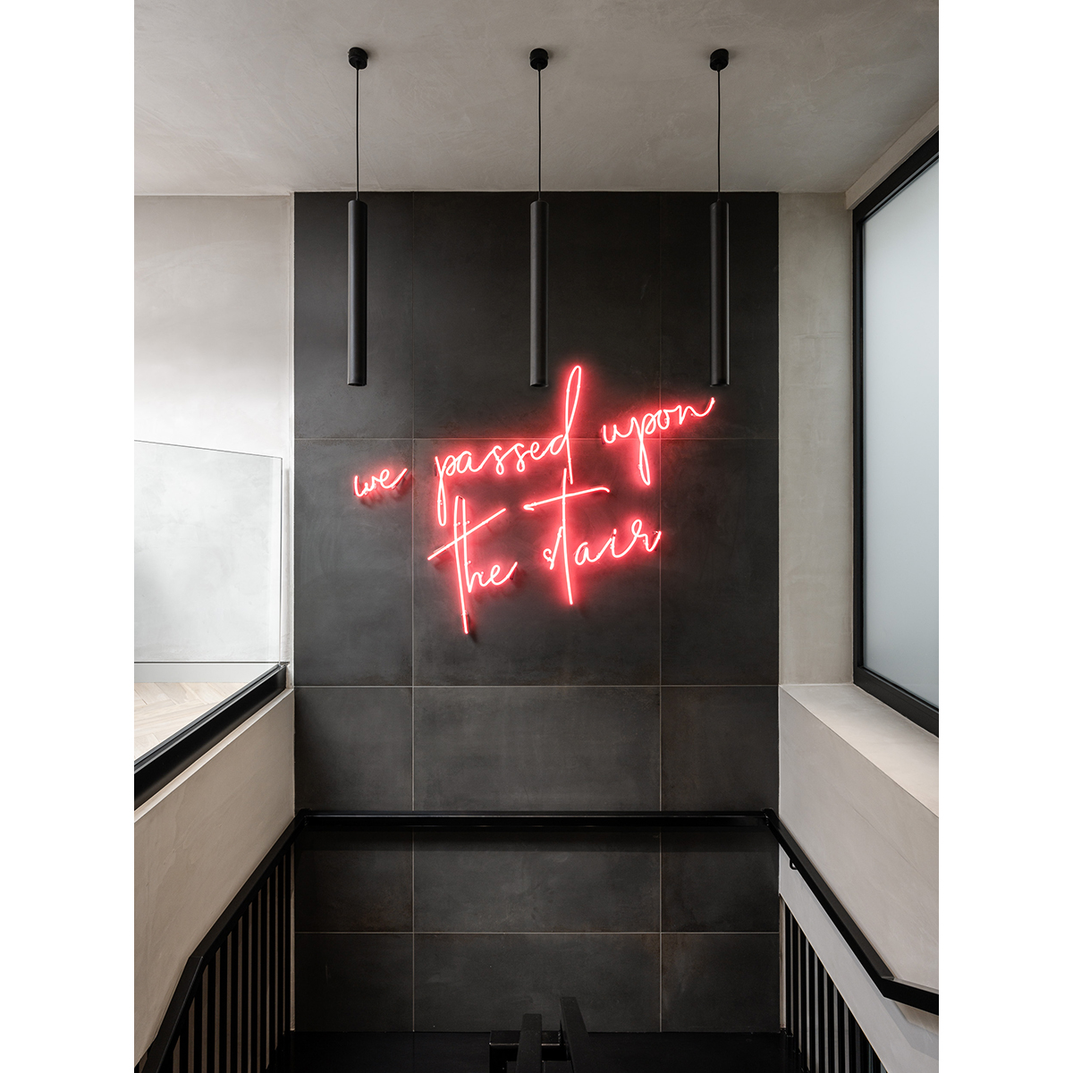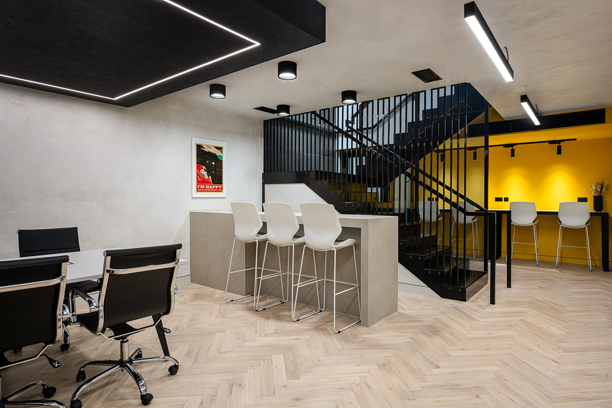A ‘raw chic’ office fitout in the heart of Covent Garden. The converted warehouse in the heart of the Seven Dials area in London’s Covent Garden provided a perfect location for the business client, but having very long and narrow proportions, the layout had to be approached creatively to maximise its capacity and functionality. By placing the staircase in the middle of the linear space, the circulation space was minimised, and the staircase had been crafted to become a visual feature within the office. The workspace offers flexibility in use by creating a series of workstations, meeting and breakout areas as one moves from one end to another, maximising practicality and future adaptation. As a reputable PR and marketing agency, the client wished for the space to represent their dynamism and originality and also give a nod to the building’s culturally significant association with the modern arts when in the 1960s it formed part of The Arts Lab, where David Bowie rehearsed and performed, and where the first joint artwork of John Lennon and Yoko Ono was exhibited. The design response was a ‘raw chic’ look, combining raw plaster and painted OSB, with stylish fittings, herringbone flooring and tiling. Bright yellow walls create joyful accents within the space, whilst the real moss wall and the neon sign frame the staircase void.