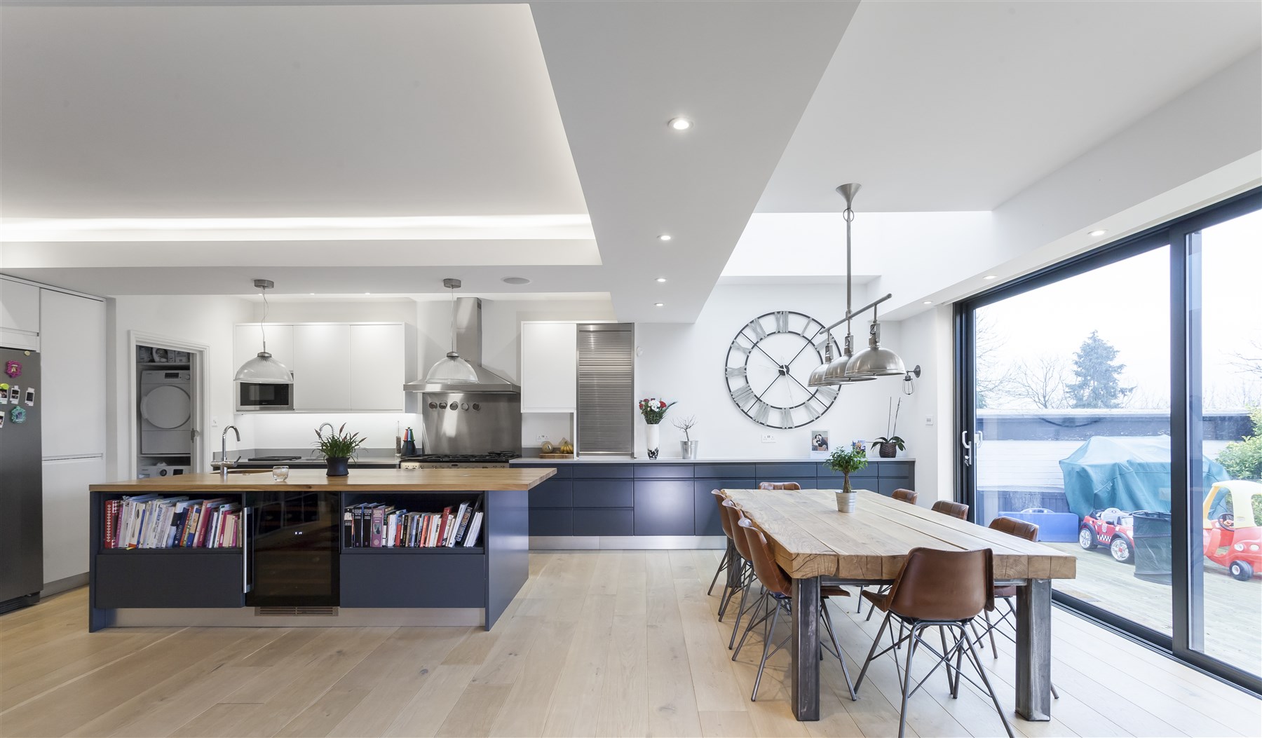 The project involved the extension, and remodelling of a 1930's semi detached London home. The design brief was for a reconfiguration and full refurbishment of a modest semi detached house. Following design reviews with their architect, the clients decided to proceed with a layout which completely reconfigured the rear of the house to provide a contemporary open plan flexible family space, with a reconfigured master bedroom suite with new rear terrace and fully refurbished interiors. The new kitchen and family space had wide sliding aluminium framed glass doors inserted to the rear terrace to provide a seamless transition to the terrace and garden, maximise light and emphasise the natural width of the site. A two storey extension was also added to allow for study and utility accommodation to the side. Different areas within the kitchen and family space were further articulated through the installation of feature rooflights to the flat roof, a carefully crafted ceiling and lighting design and the selection of a limited palette of materials. Sustainable features within the design included high performance thermal insulation to new building elements being designed to exceed building regulations for extensions, the insertion of high specification glazing and low energy and concealed lighting through key areas. The clients worked closely with the builder, building control officers, architect and wider project team to obtain the necessary planning and building approvals, and successfully transform a tired house. The end result is one which seamlessly blends and contrasts traditional features with the new, and the creation of a modern and contemporary family home full of light detail and character.