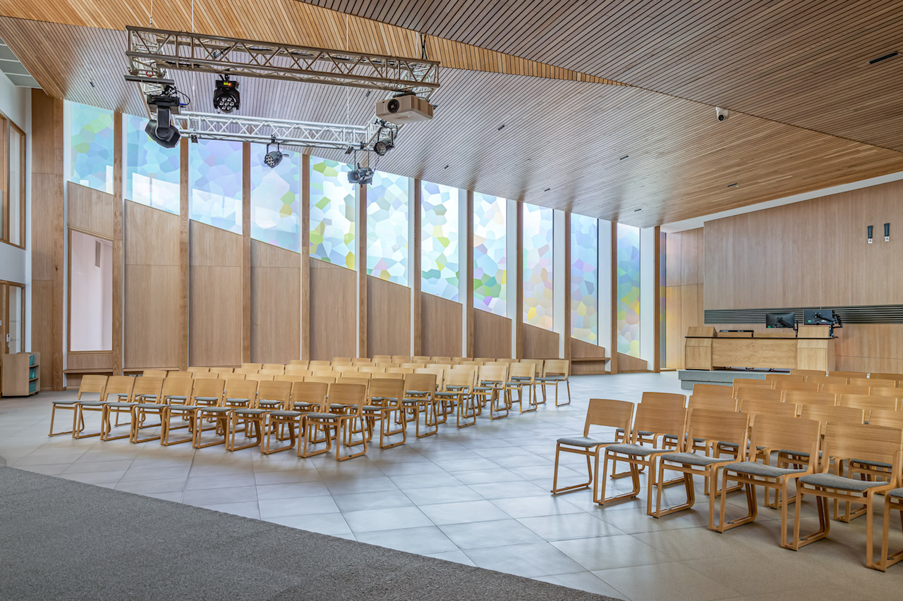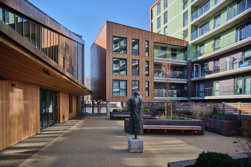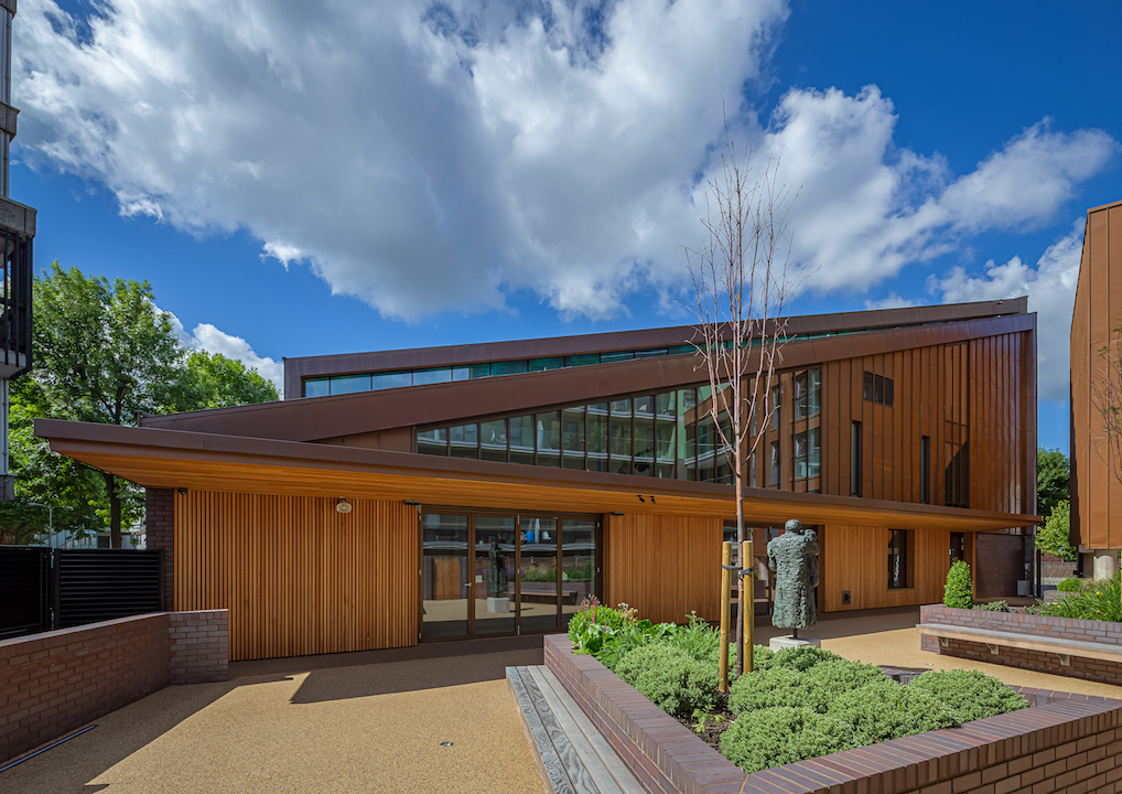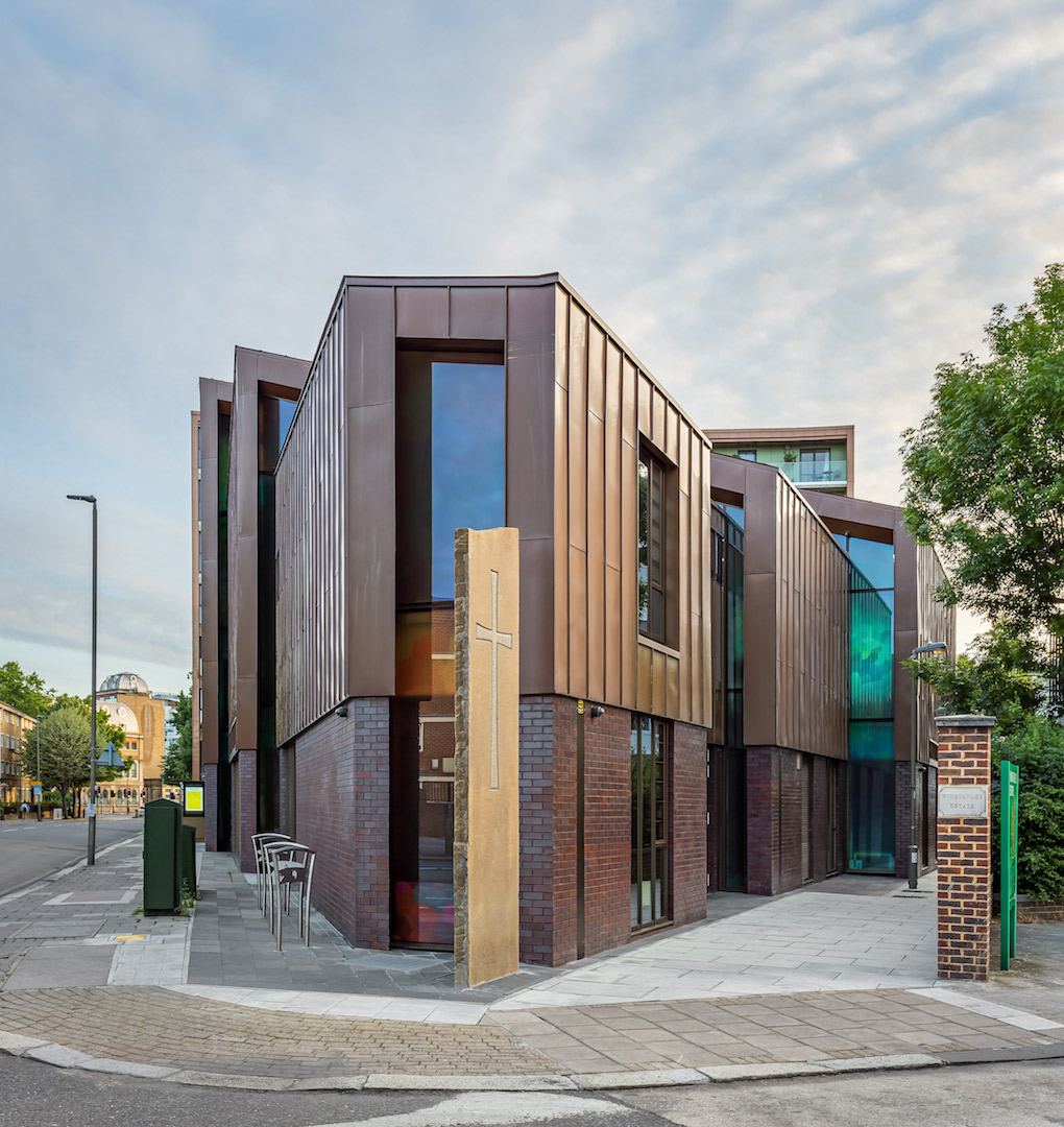 A new development on the site owned by the Diocese of Southwark and the local parish comprising an 8 storey residential block with 69 flats in a mix of market-led and affordable housing and a new church and community centre. St Peter’s Church will provide a 300+ seat worship space on the first floor with a multi-functional community centre and offices on the ground floor that will provide facilities for the local community. The Church is clad in brick at ground floor level and brass and is seen as a series of volumes stepping up to the worship space on the first floor. Digitally printed glazing and a standing stone from Caithness carved with text by the renowned artist Richard Kindersley hints at the building typology. The courtyard space that separates the buildings is a public open space for all members of the community to use.