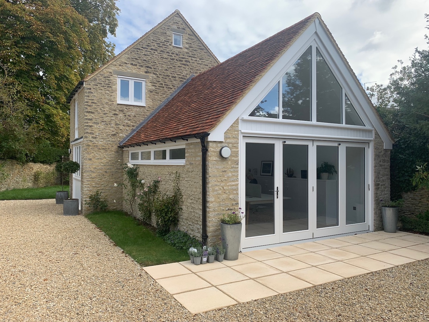 This former rectory was bought by a young family who had recently relocated from London. The brief was to create a modern family home introducing as much natural light into the formerly dark Victorian spaces as possible. Although the house was not listed it was important to retain the original Arts & Crafts style exterior. Working with the original fenestration we opened up internal spaces and created light and airy house. A new state-of-the -art stainless steel kitchen with natural limestone flooring was created with a dining room leading out the extensive landscaped garden. Ten years on were commissioned by the client to refurbish and convert a stone former coach house into a self contained home office in the grounds of the house.