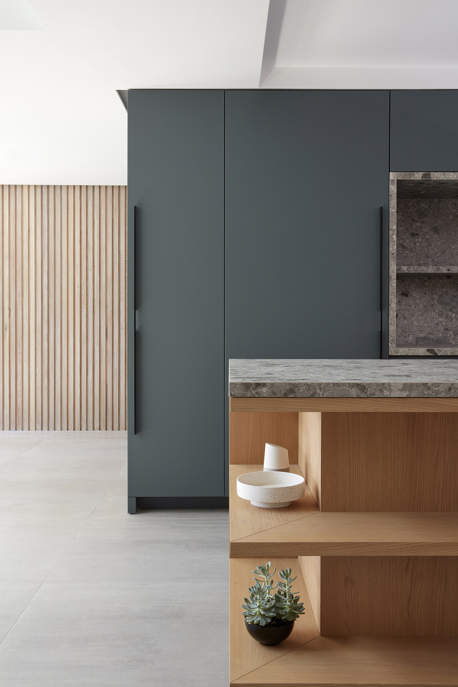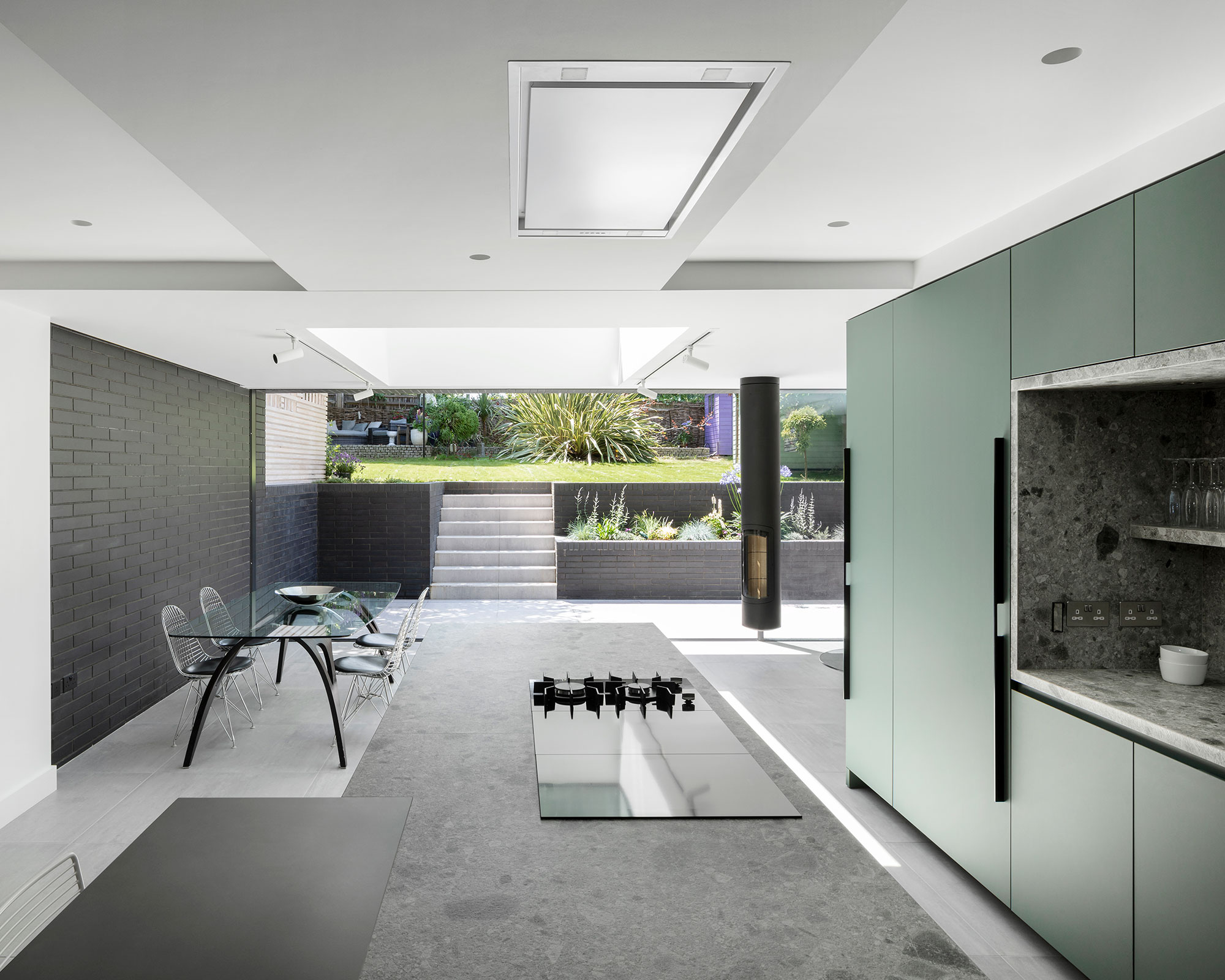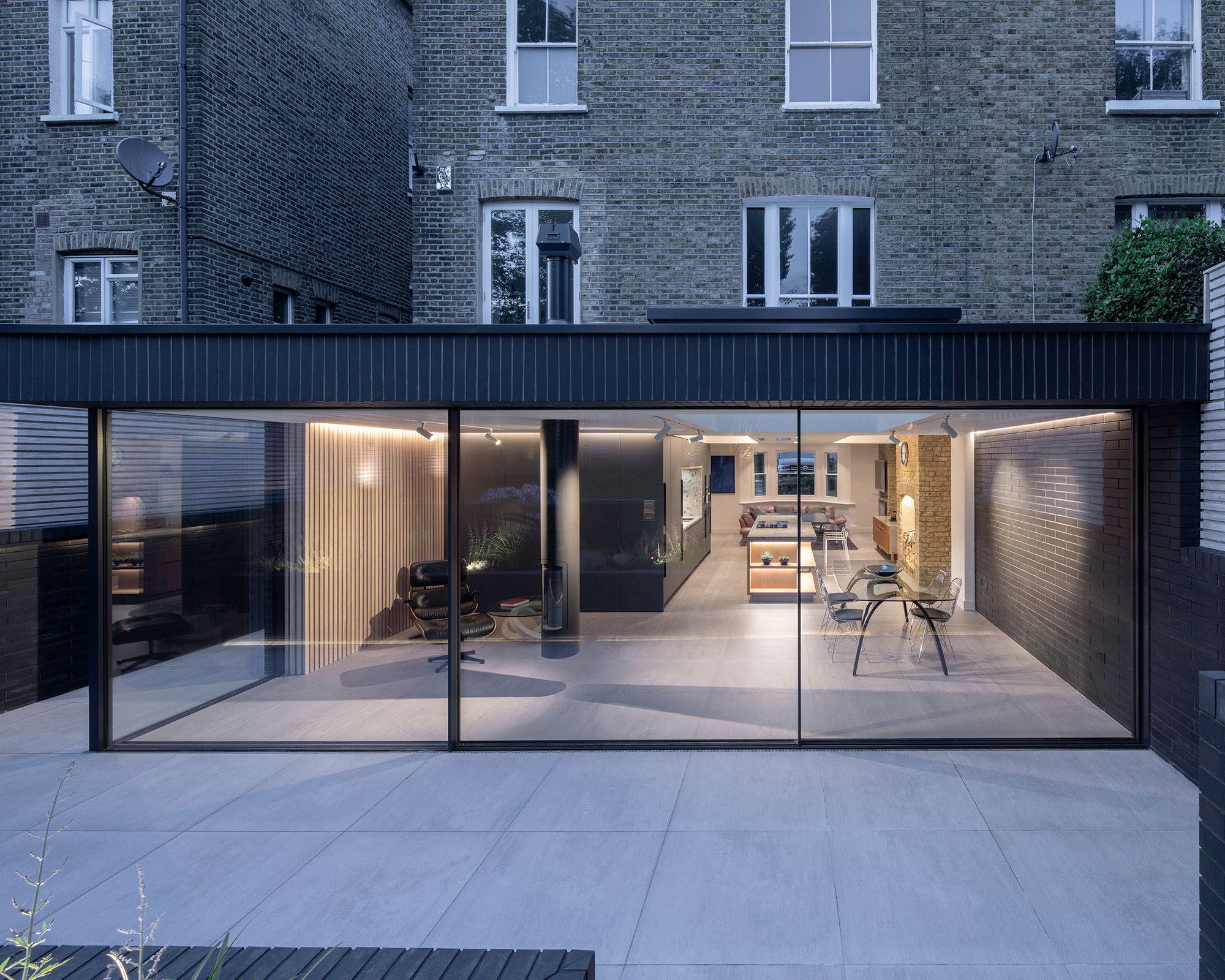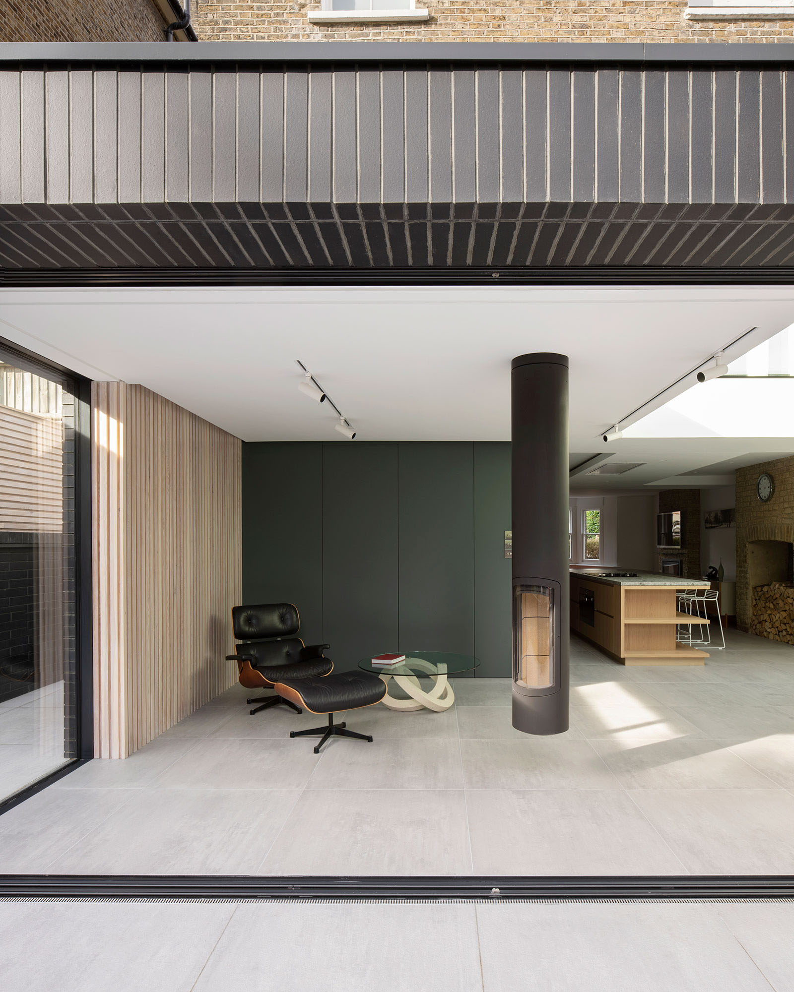 Our proposal is a crafted brick-clad extension that enhances the original brick detailing of the house. Large sliding doors open onto a flush sunken patio at Lower Ground Floor Level. The roof is cantilevered over the glass and the overhang is detailed in a single oversized linear ‘brick-and-a-half’ lintel. The thick lintel reinforces the perceived mass of the roof as a counterpoint to the thin framed sliding glass doors and large oversized roof light. The ground plane has been excavated as low as possible whilst avoiding internal underpinning. This is continued externally to create a semi-submerged courtyard that captures the Southerly light whilst retaining privacy. The new retaining walls are clad in the same dark brickwork, this continues internally to the flank wall which further blurs the threshold from inside to outside.