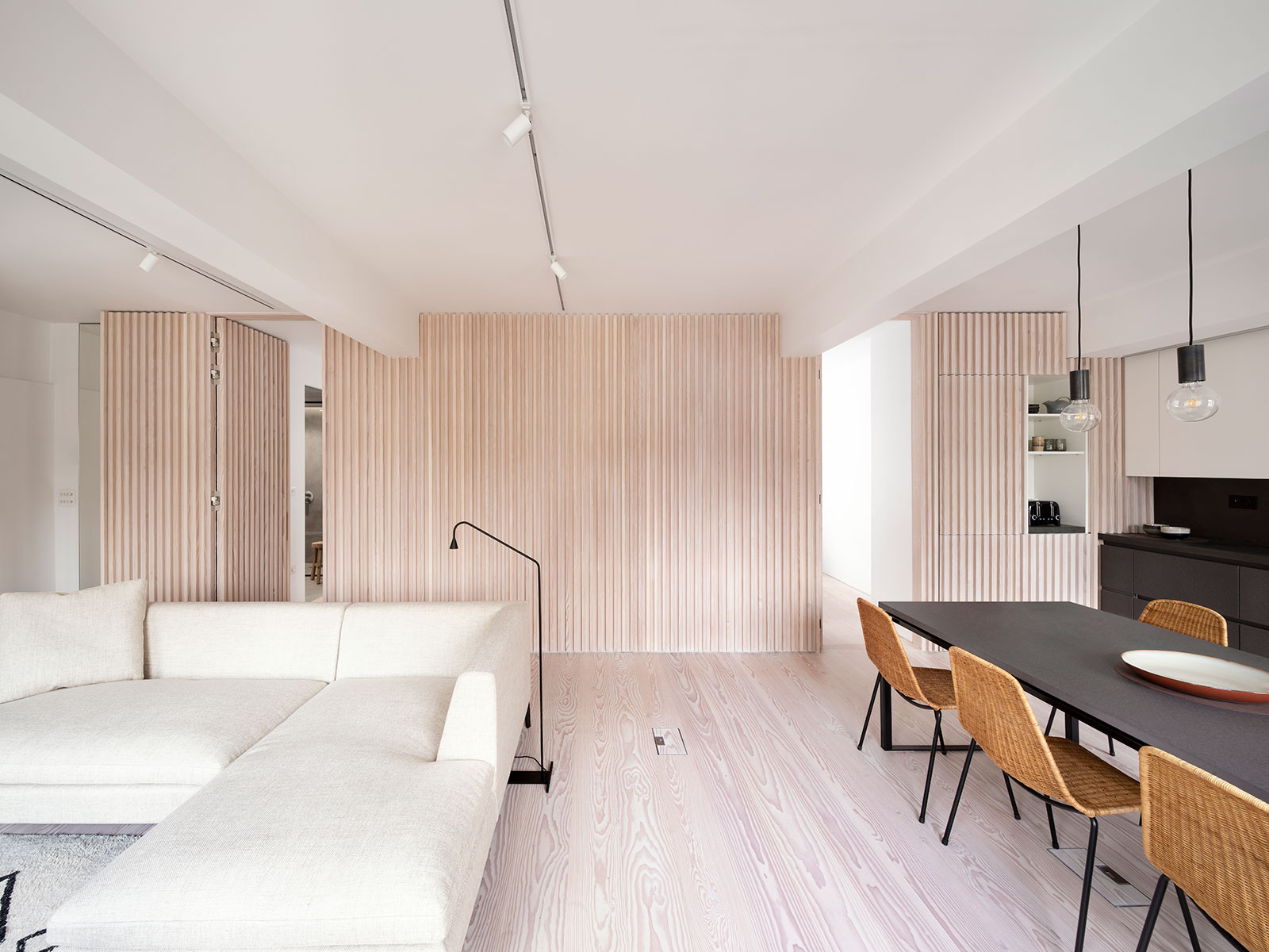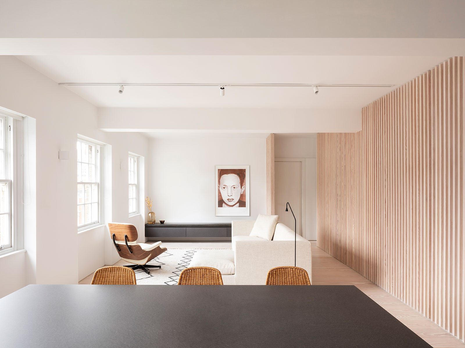 The brief for this apartment full refurbishment required 2 bedrooms with ensuite facilities and an open plan kitchen, dining, living space that made the most of every square inch of the property’s modest footprint. The chosen design solution reconfigured the bedrooms behind a beautifully detailed timber screen wall to allow a consolidated street-facing living space the full length of the apartment. The timber wall incorporates full height storage, concealed kitchen cabinetry, services and hanging cupboards into a highly efficient footprint. Lye washed douglas fir floor boards spanning the full width of the room continue up onto the rear wall of the space in a vertical batten arrangement to emphasise a sense of height in the space. Flush doors and discretely carved handles are concealed in its protrusions. The ensuite shower rooms are finished in a seamless microcement finish to walls, floor, ceiling and cabinetry to create a sensuous cocoon-like atmosphere. Ultra matt grey through-coloured MDF cabinetry complements the rich language of dark pitted concrete vanity units, basins and worktops.