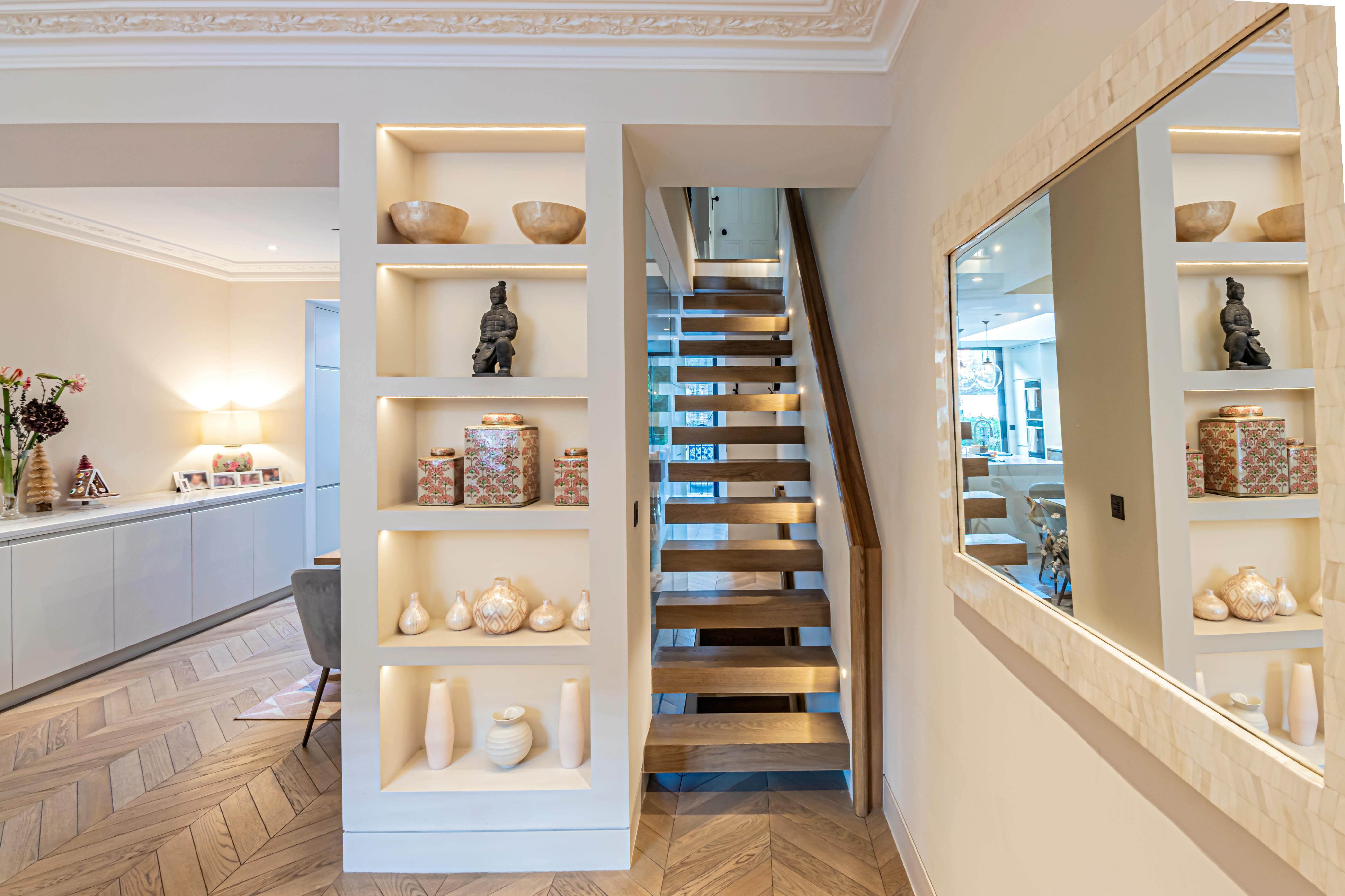 This five-storey townhouse in the Chelsea Conservation Area was reimagined to resolve years of fragmented remodelling. Uneven floor levels and compartmentalised spaces were replaced with a cohesive layout offering improved flow, light, and connectivity. The rear closet wing was demolished and rebuilt with an added storey, while the basement was deepened to create more usable space. At ground level, the plan was opened up for modern family living, and a new central staircase was introduced to unify all floors. Fully refurbished throughout, the home now balances period character with refined contemporary design.