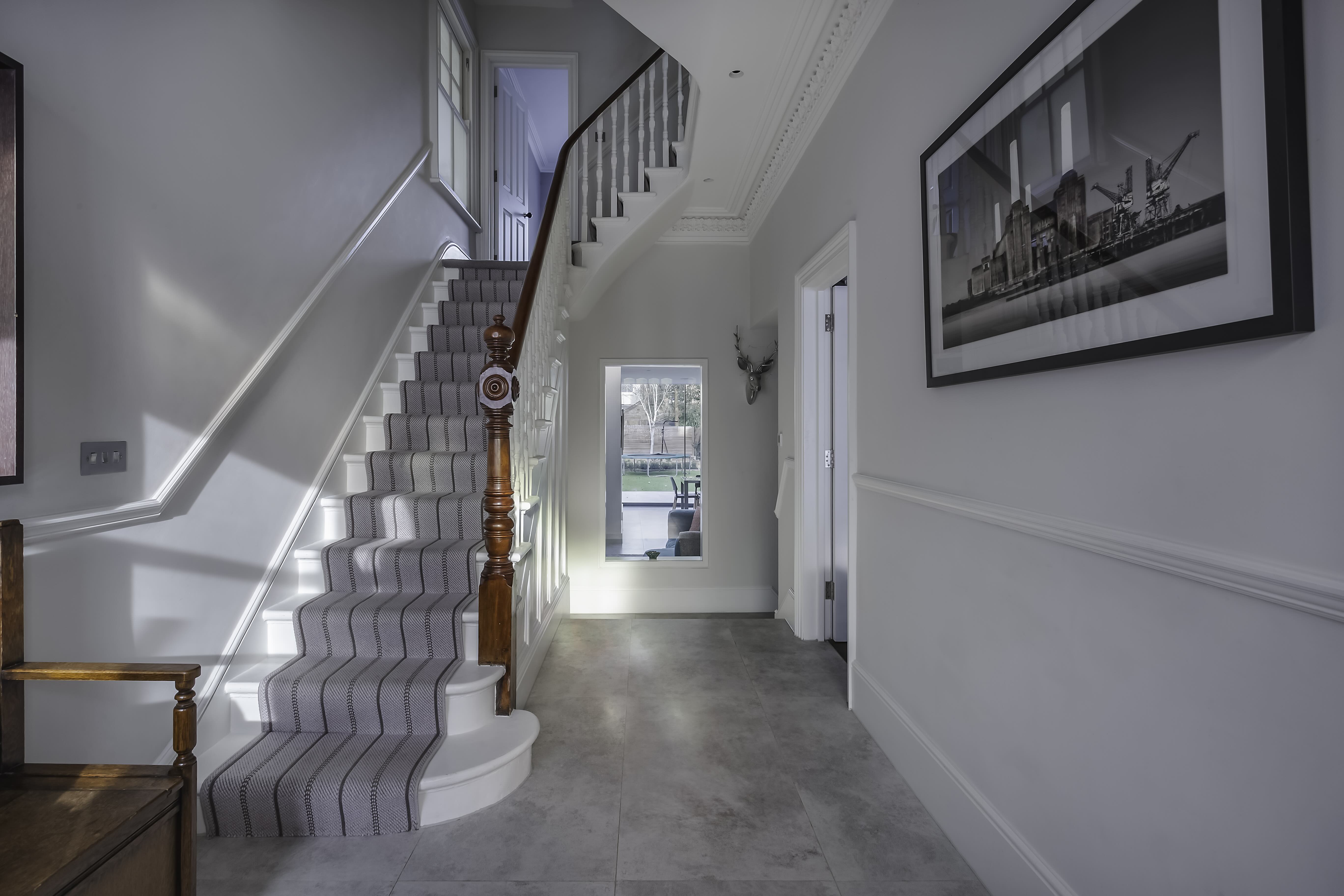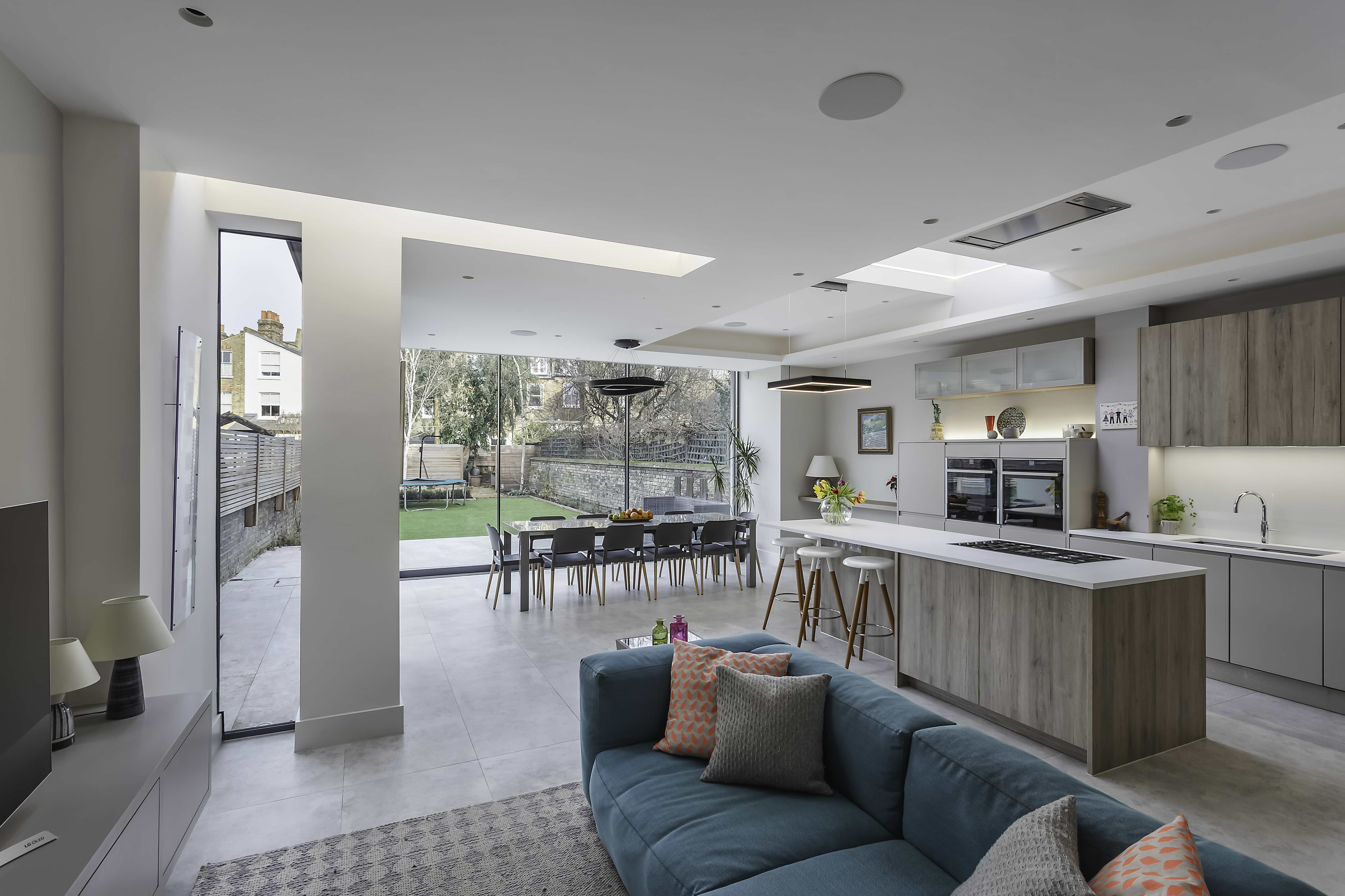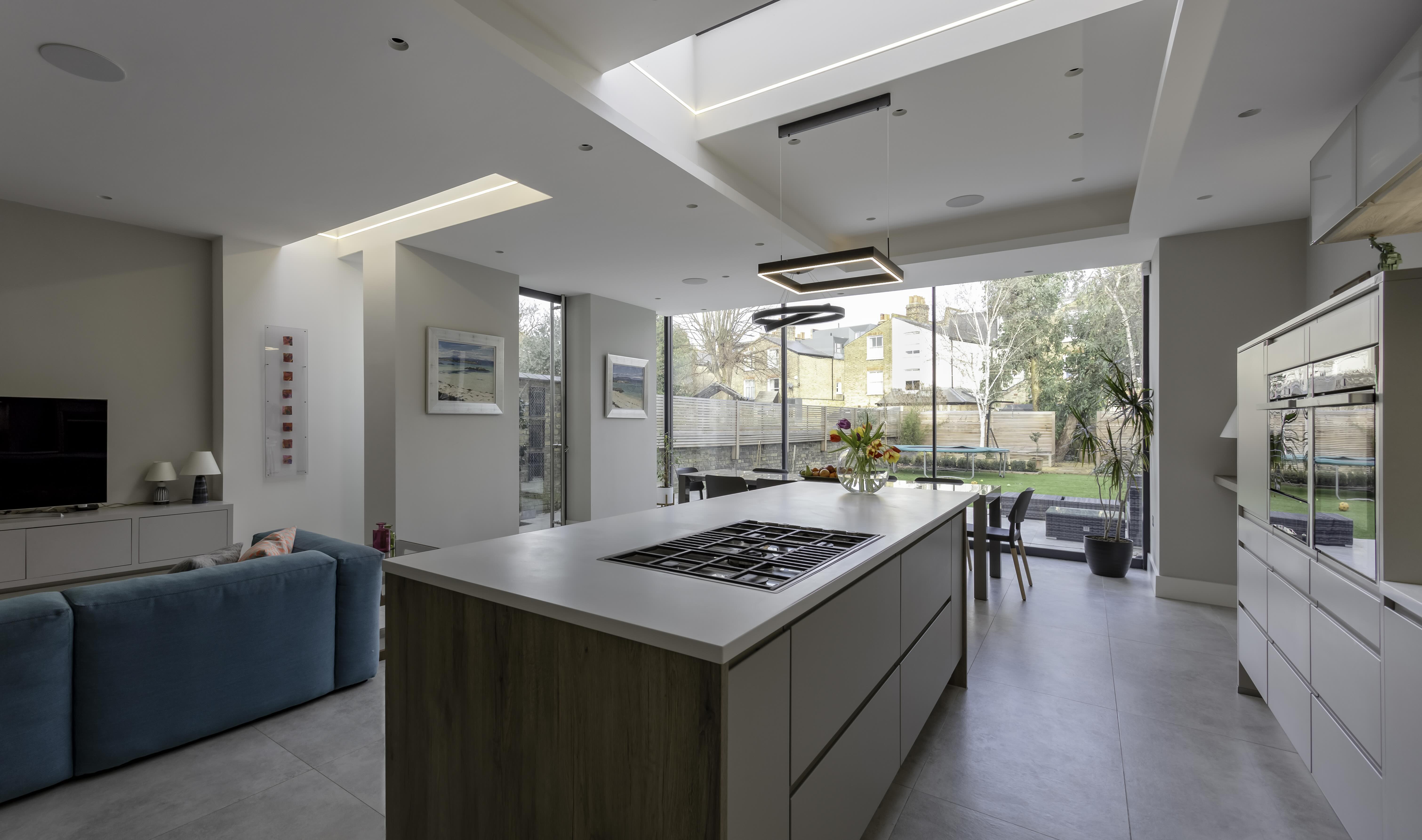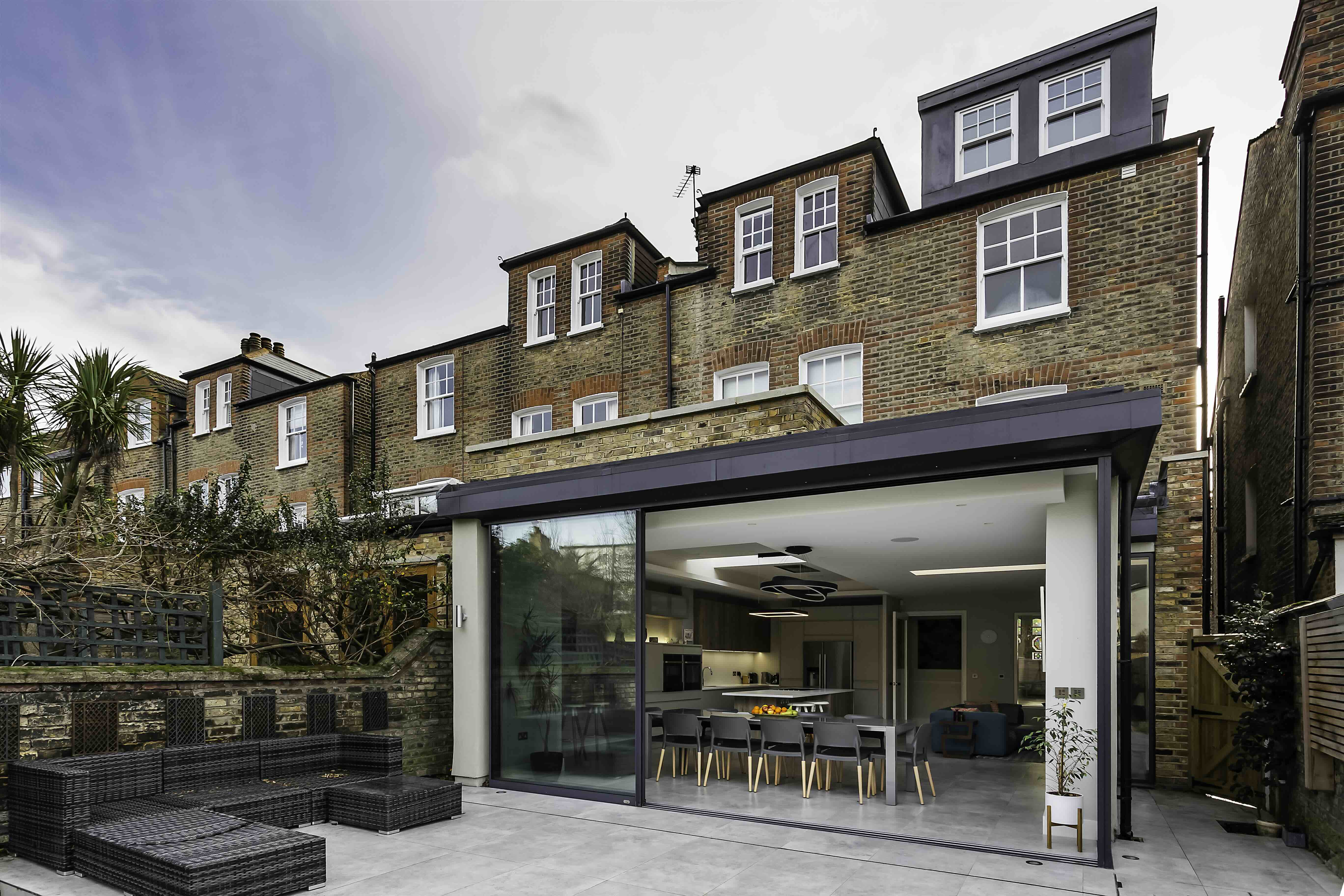 Located in the Heaver Estate Conservation Area, this period home (c.1890–1910) was transformed to enhance flow, light, and connection to the garden. Earlier extensions were replaced with a bold, contemporary ground-floor addition featuring stepped volumes, varying ceiling heights, and large roof lights, creating a spacious, light-filled family room. A key feature is the full-width sliding doors that seamlessly open the interior to the patio and mature garden, blurring the line between indoors and outdoors. A new loft dormer study, accessed via a sensitively extended staircase, and glazed internal screens bring daylight deep into the house. Original period details—including cornices, mouldings, and stained glass—were preserved and complemented by clean, modern materials, achieving a harmonious balance between heritage and contemporary family living.