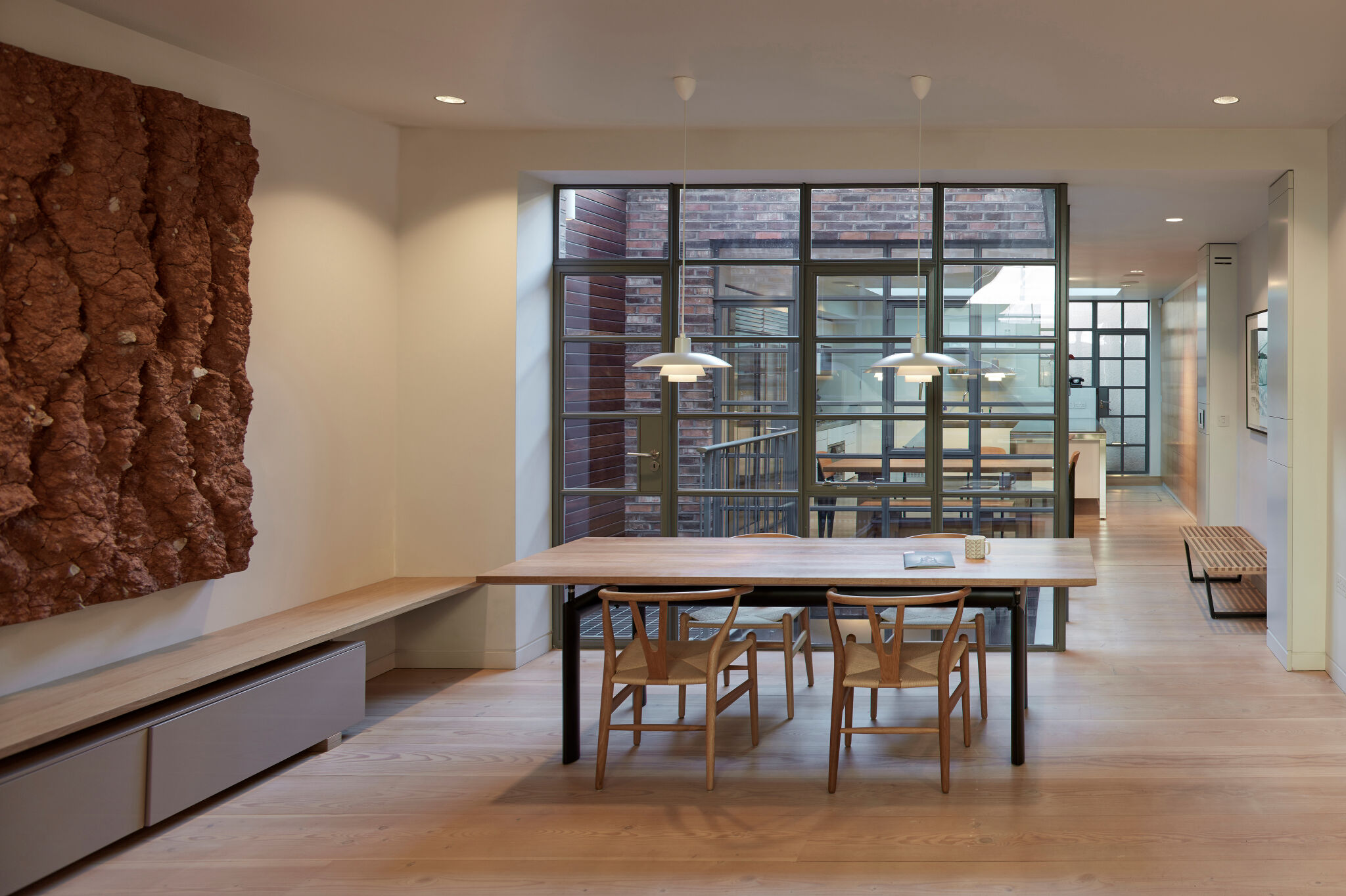 Taking as catalyst the history, the original materials and detail of the existing building, the design of this contemporary town house retains a quiet complexity behind the relatively modest front facade. Originally a series of interconnected Victorian warehouse terraces, this five-storey private residence is located within an important terrace of Victorian warehouses in the Brick Lane and Spitalfields area of London. The brief was to create a contemporary family home that maintains the scale and space of the warehouse, while introducing as much natural light as possible to accommodate display of the client’s art collection. The new oak shopfront combines old and new while allowing maximum light, however the deep plan required a complete review of the light penetrating the rear of the property. In order to provide the required additional floor space for the family, the plan included insertion of a new basement, a new rear extension and top floor roof extension. Two light wells were created that run the height of the building, allowing the south-facing natural light to penetrate throughout the section. One of the light wells, a glazed courtyard, open to a new basement with a guest bedroom and suite. The second light well takes the form of a glazed rooflight and atrium over the central staircase, which was conceived as spiral form through which light would gently flow. Throughout the building care was given to consider the original detailing and quality of existing materials, which is followed by material choices of hand made bricks, Dinesen Douglas Fir solid floorboards, thermally broken steel windows and Lime render which naturally sit along with the existing Victorian warehouse facade.