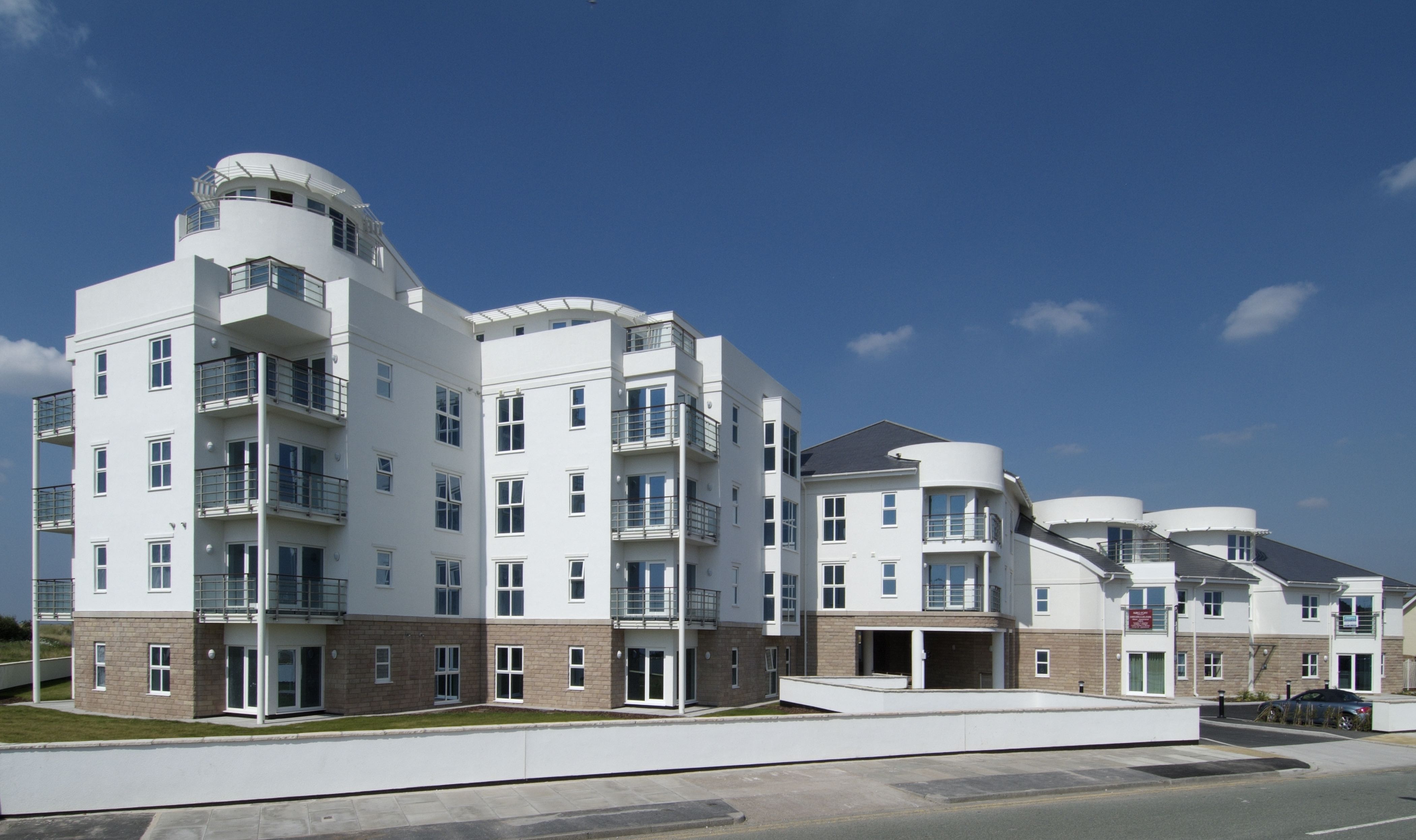A contemporary five-storey apartment block containing a two-storey penthouse and 21 other luxury apartments. Designed as a modernist white building associated with the UK coast, it takes maximum advantage of the spectacular panoramic views over Liverpool Bay, the Welsh Hills beyond and West Lancs Golf Club. The beachfront site on the ‘Golf Coast’ overlooks ‘Another Place’; the famous iron figure sculptures by artist Anthony Gormley. Car parking is provided below a landscaped garden deck to minimise visual obstruction of cars on the views. This project won the LABC Award for Best Large Housing Development in the North-West & Highly Commended for Best Large Housing Scheme at The Sefton Design Awards.