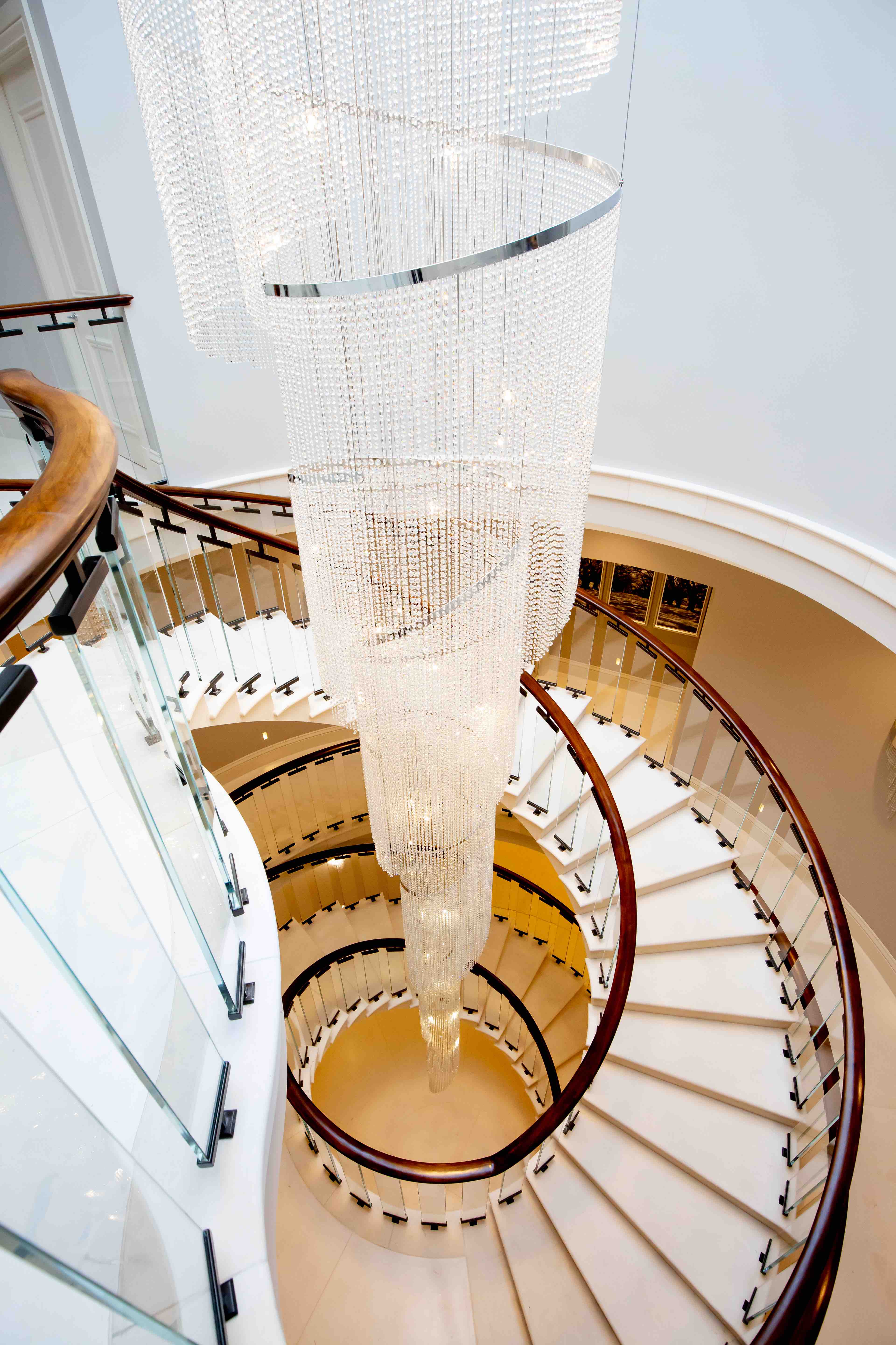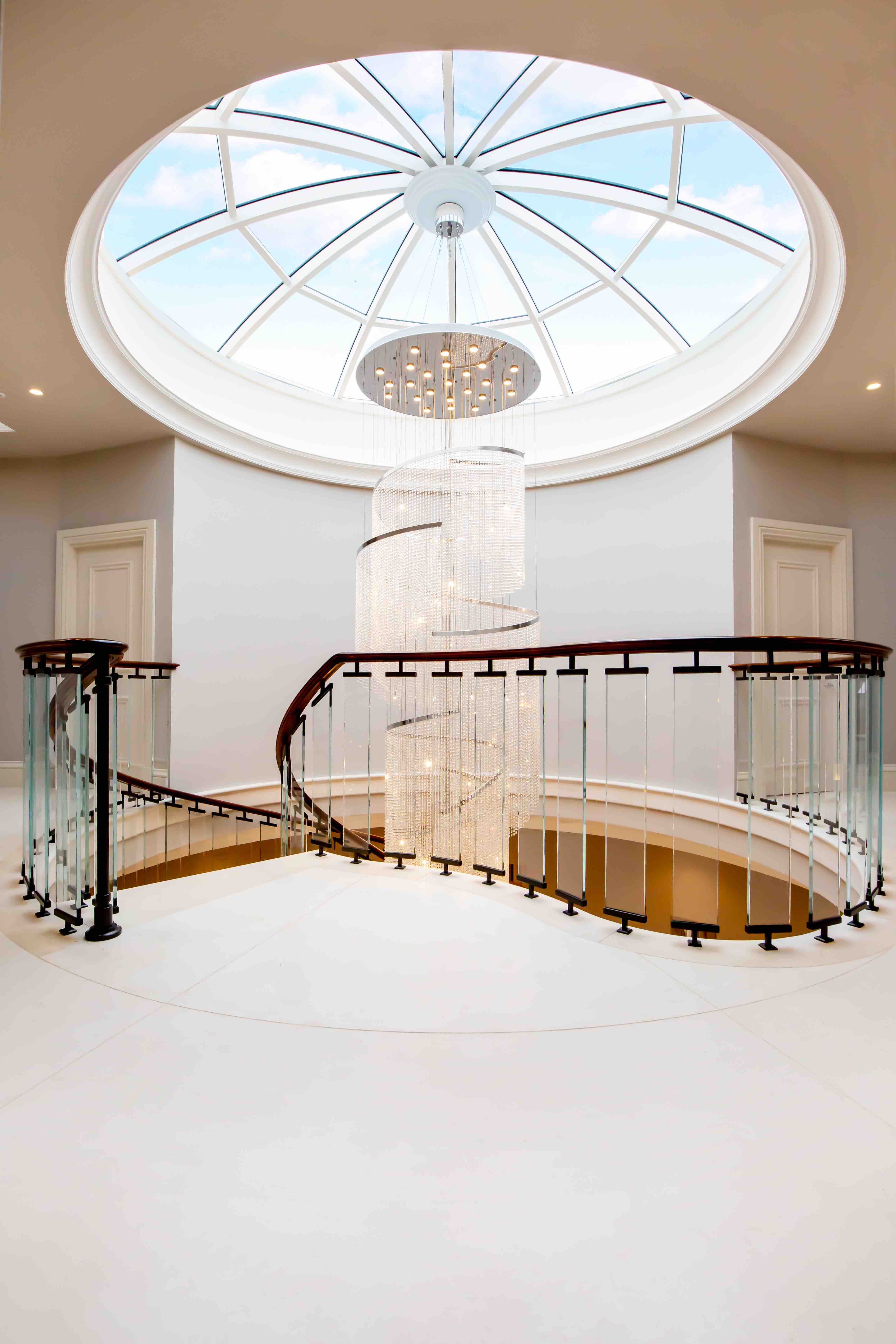 A substantial country villa was built in the Palladian style. The entrance to the house is dominated by a central stone four columned ionic portico with modillions, finials and pediment. The front door leads to a central hallway around which internal spaces are arranged. At the hallway’s core stands an award winning French limestone staircase with a complex 320-degree curved self supporting structure, a world ‘first’. This helical stair runs through all three floors culminating in a decorative domed roof lantern which floods the centre of house with light. The house extends to 22,000 sqft and includes 8 ensuite bedrooms with a leisure annexe. The building employs typical classical symmetry in its layout, with neo-classical Georgian proportions completing the overall aesthetic. Winner of Best Individual Home at the Sefton Design Awards 2023.