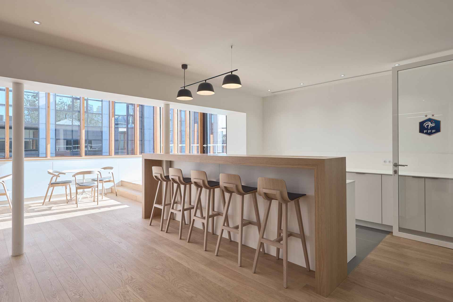 Reid Brewin Architects were selected following an invited design competition to overhaul the offices of a French sports federation. This included a complete structural remodelling of the façade and building entry, a new contemporary lobby space, refurbished conference auditorium, meeting rooms, and informal break-out spaces. Specific design features that are specialised to the space and organisation include bespoke timber displays for trophies and historical memorabilia and a mesh screen on the façade onto which the federation can project visual displays depending on the sporting calendar.