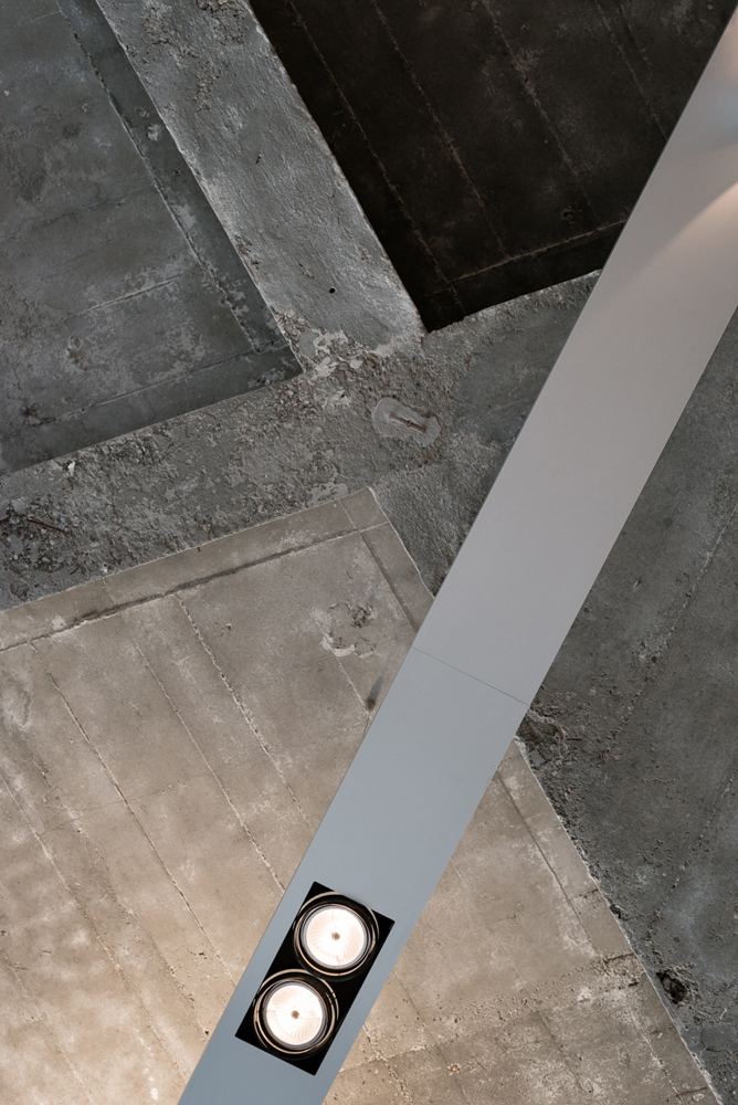 Following the success of a number of London refurbishment projects, Inside Out Architecture was appointed to redesign the interior layout of a unique apartment space in Clerkenwell, Central London, in early 2012. The existing building had an intriguingly tactile industrial structure, with exposed concrete beams and columns throughout its interior. These original structural elements proved far more captivating than the apartment’s existing interior, and IOA’s subsequent intervention sought to enhance their prominence. Work began by stripping the old apartment back to its basic shell and exposing the dramatic geometry of the concrete beams. A number of spaces - including a TV room, 2 bedrooms, separate family and guest bathrooms, a utility room and an adaptable guest bedroom - were then “inserted” into this hollow shell. These inserts came in the form of numerous bespoke joinery pieces, designed with a light touch and simple smooth finishes to contrast with, and hence emphasize, the strength of the textured concrete structure. By stopping these joinery inserts short of the overhead beams IOA expressed them as something secondary to the structure. It was then possible to step these partitions back at high level to align with concrete beam junctions. This enabled the creation of a suitable layout in plan while ensuring that full acoustic separation was achieved in a way that respected the complex soffit geometry. Despite their simple expression, the joinery pieces house a wealth of concealed functions including fold out beds, integrated radiators, storage units, kitchen appliances, glazed screens, curtain recesses, sliding partitions and the entire family bathroom. In the living area a bespoke island kitchen was introduced to provide a focal point for activity within a large open plan space. A suspended aluminium profile provided functional downlighting while simultaneously uplighting the concrete soffit to create a comfortable warm atmosphere, giving the clients the flexibility they require. In combination, the project’s lighting, tones and textures collude to create a series of tranquil domestic spaces amidst the bustle of central London.