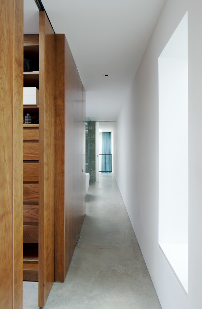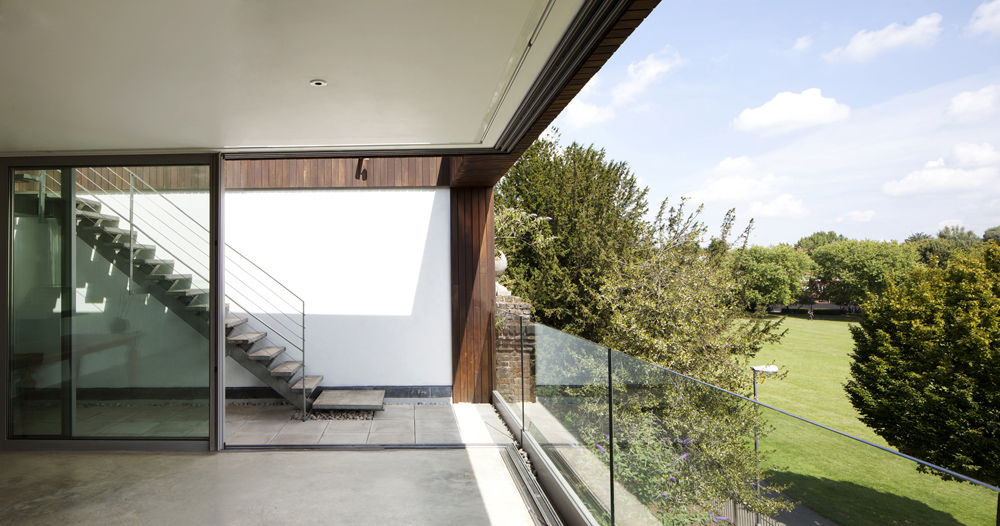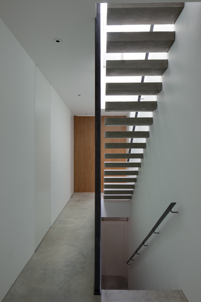 Due to the success of a prior refurbishment and partial extension to an existing industrial building on the site by Inside Out’s director while working for a previous practice, the client asked Inside Out to design a substantial new extension to her residence. The layout of the house is uniquely tailored to the client’s specific lifestyle and livelihood, with a number of unusual spaces including a high-spec cinema, a double height library and a renovated warehouse studio complimenting the more traditional domestic spaces. The house’s picturesque urban setting adds to its singular character, sited on the edge of Kilburn Grange Park. A series of double-height sliding glazed screens take full advantage of these panoramic landscapes, with frameless corners eroding the division between house and park. The ancillary spaces are, by contrast, quite tactile and personal. Intimate bathrooms are located within freestanding joinery pods while the narrowness and subdued lighting of the main staircase helps to create a dramatic sense of arrival as you step into any of the main spaces. While the oak and stone add a sense of warmth to the white interiors, the restrained material palette of the main spaces acts as a canvas for the ever-visible green landscape outside.