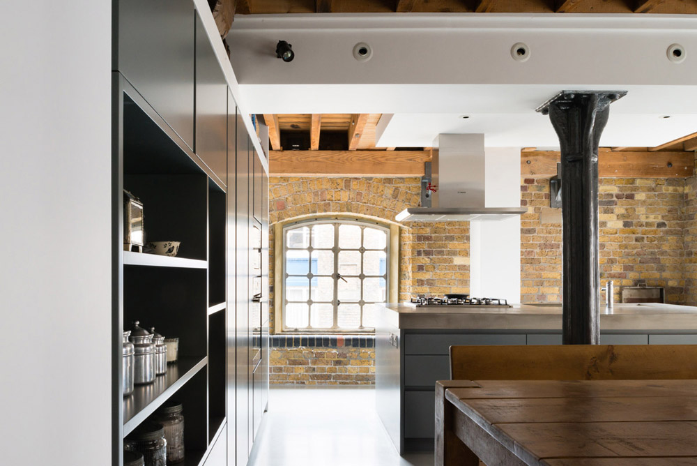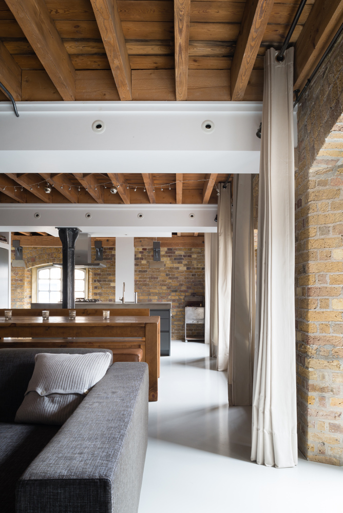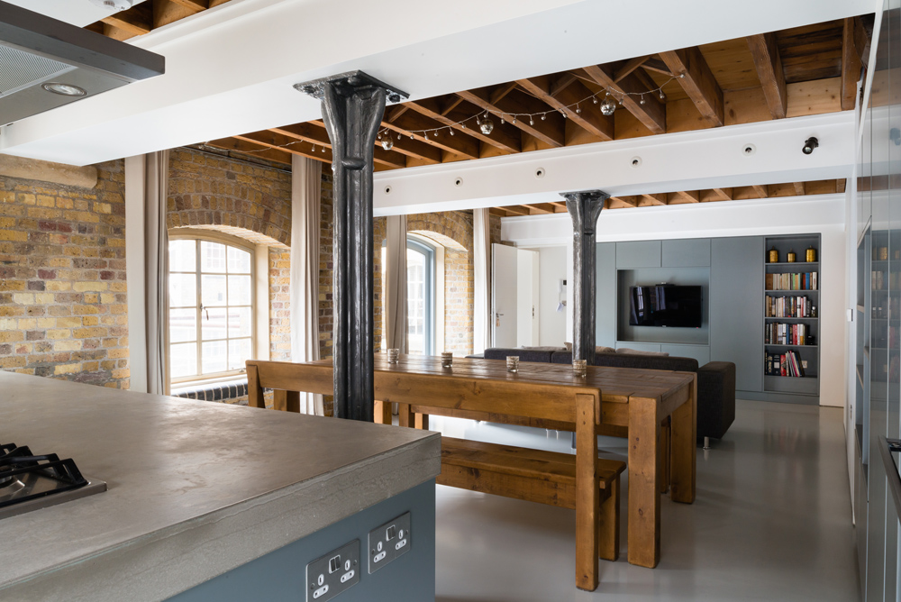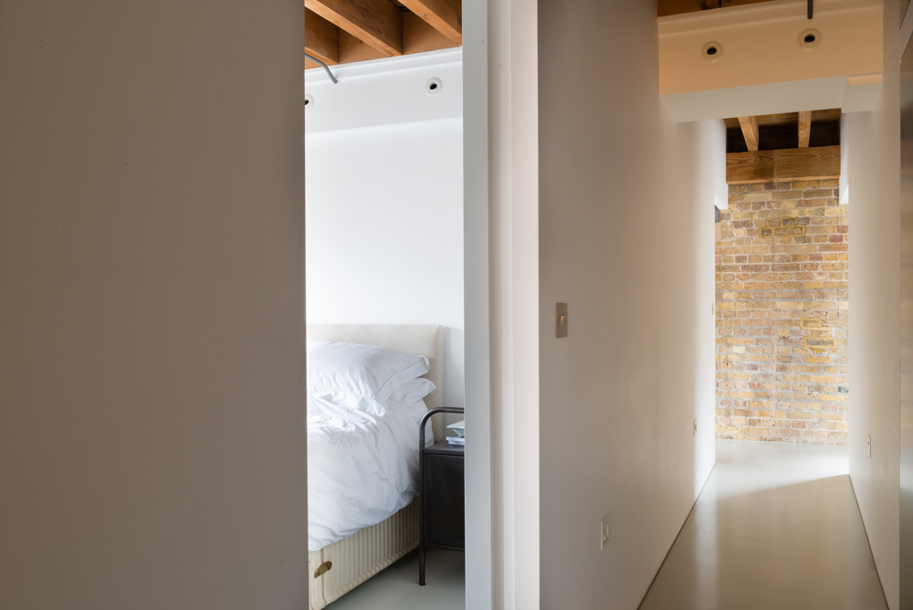 Our clients asked us to redesign the interior of their apartment within an industrial dockland building in Bermondsey. The original building contains a lot of character and tactility, so our intervention focused on maximizing these characteristics through simple interventions. By adding small timber elements throughout, we added a domestic warmth to the robust industrial masonry construction. A polished concrete floor allowed light to penetrate to the back of the space. Floating joinery pieces created notional divisions of space while allowing for a free, unobstructed circulation.