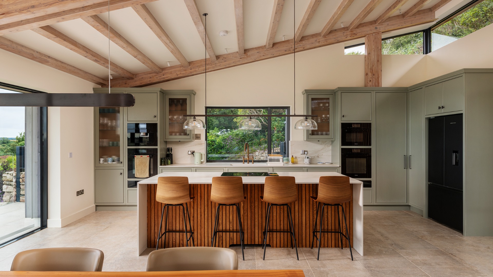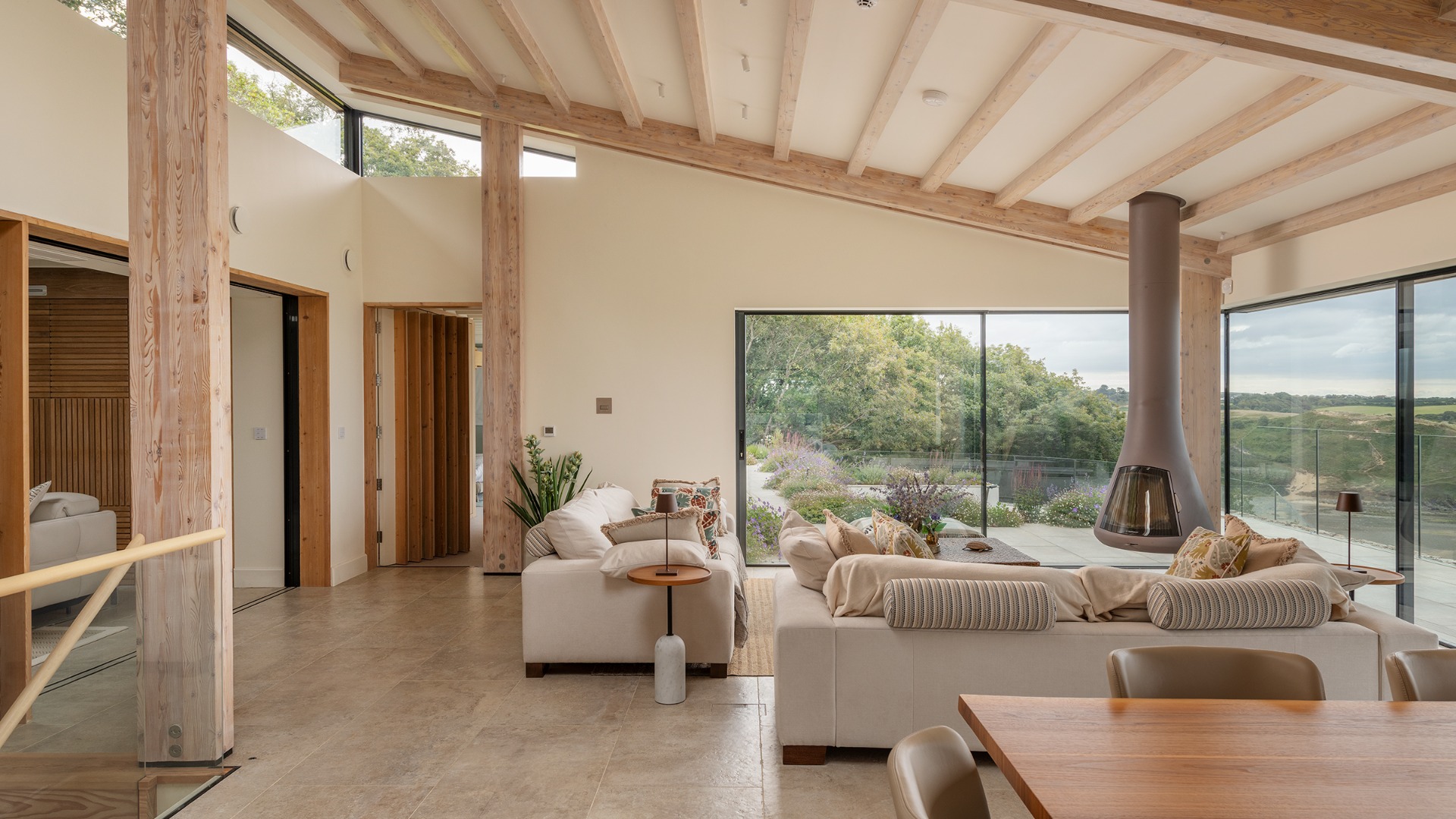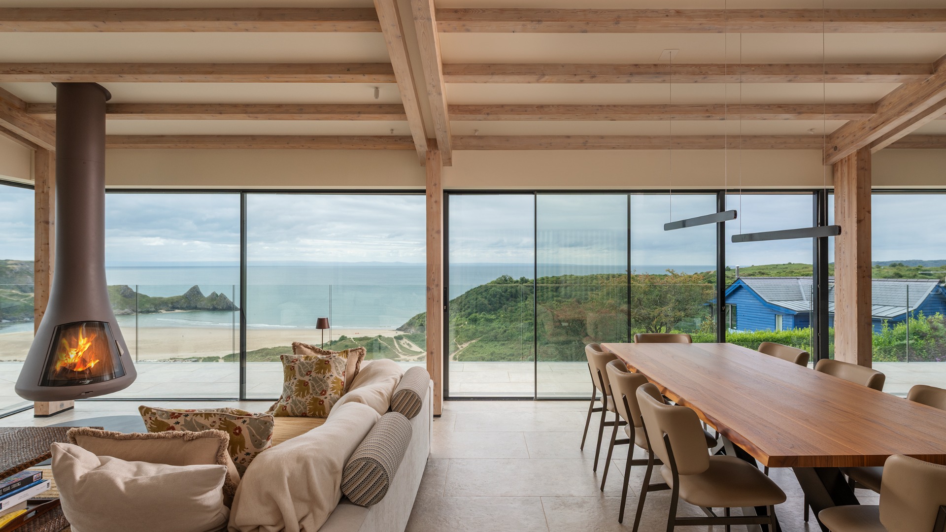 This contemporary low-lying replacement house is a masterclass in subtle integration with the protected landscape. Much of its mass is concealed below ground, allowing the structure to nestle discreetly into the rolling terrain of the Gower Peninsula. From the approach, the building appears modest and grounded, its green roof and earth-toned materials blending seamlessly with the surrounding heath and coastal flora. Yet upstairs, the living spaces open dramatically to the horizon. Expansive glazing frames panoramic views of the Gower coastline, flooding the interiors with natural light and forging a strong connection between inside and out. The upper level is designed for openness and flow, with minimal partitions and a restrained palette that echoes the tones of sand, sea, and sky. A series of dry-stone walls running across the site create a clarity and order to the steep topography, whilst these hard stone walls are then softened by a planting scheme that will mature over time, ultimately concealing and disguising these surfaces. The Cabin is an nZEB (net zero energy building), which means it produces the same amount of energy annually as it uses.